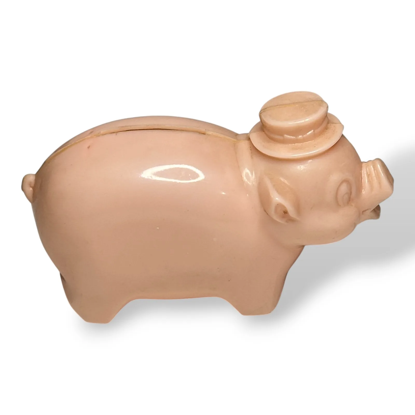 This vintage c.1950s plastic piggy bank was made as an advertising premium for The Home Building & Savings Co. of Toledo, Ohio. The bank features a pig with a small bowler-style hat and printed lettering promoting the institution. These small savings banks were popular mid-20th century giveaways and remain collectible today, especially for regional bank and advertising collectors. The piece measures about 2.5 inches tall by 4.5 inches wide.