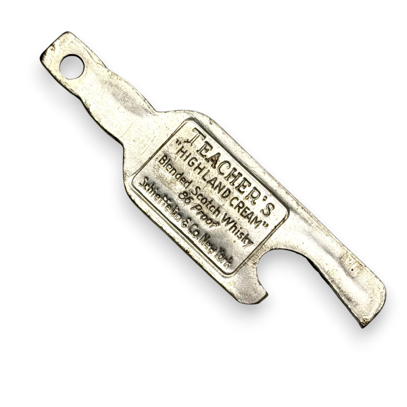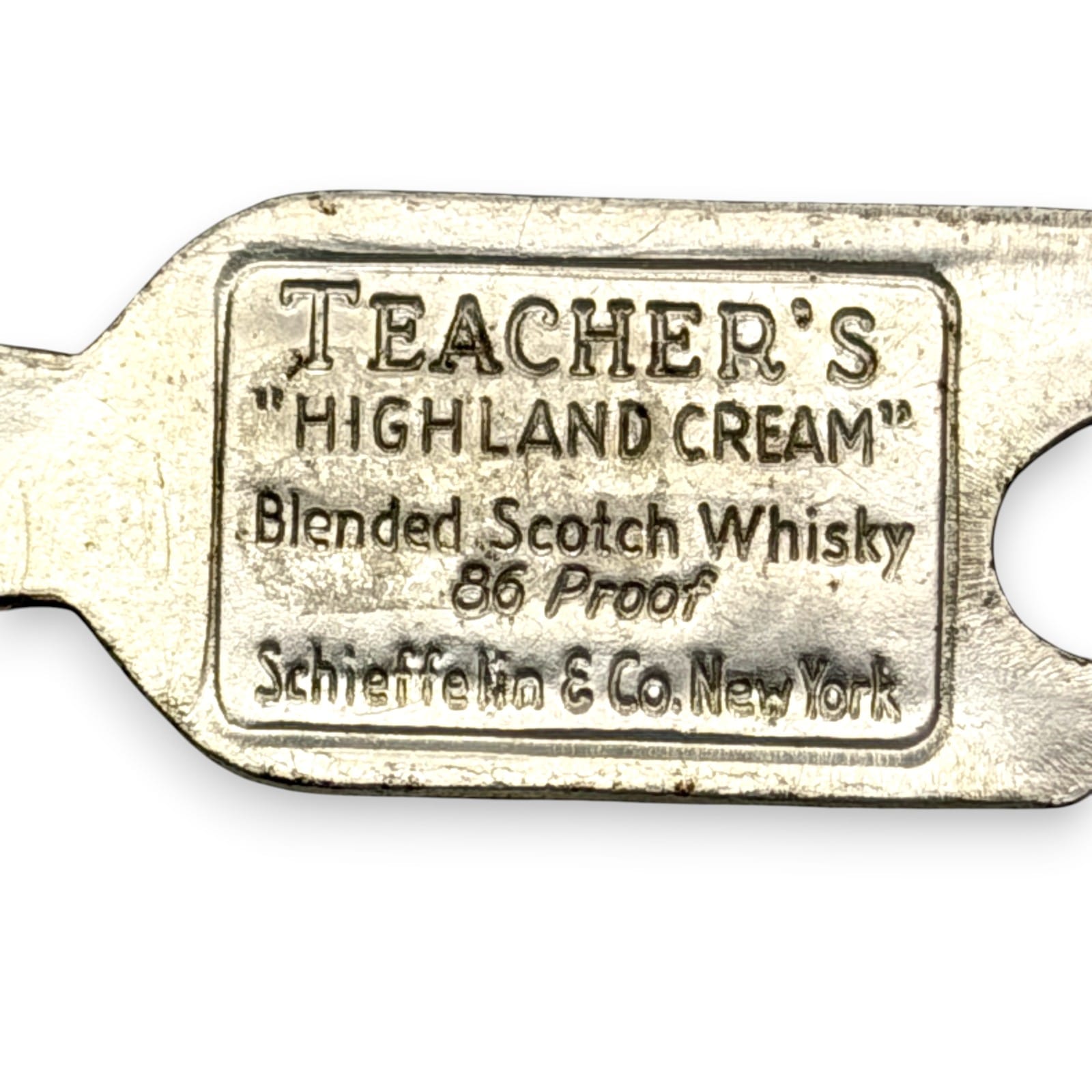 Mid-century Teacher’s Highland Cream advertising bottle opener with Schieffelin & Co., New York branding. This is a two-sided figural opener made as a small barware promo for blended Scotch whisky.