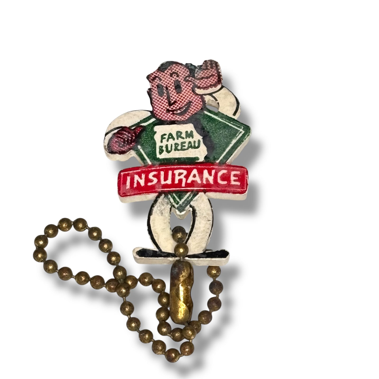 Original c.1950s Farm Bureau Insurance advertising key fob made of molded white plastic with a printed multicolor cartoon image. The design shows a cheerful figure holding a green diamond reading āFARM BUREAUā and a red banner marked āINSURANCE.ā It retains its original brass bead chain and was distributed as a mid-century promotional giveaway by Farm Bureau agents.