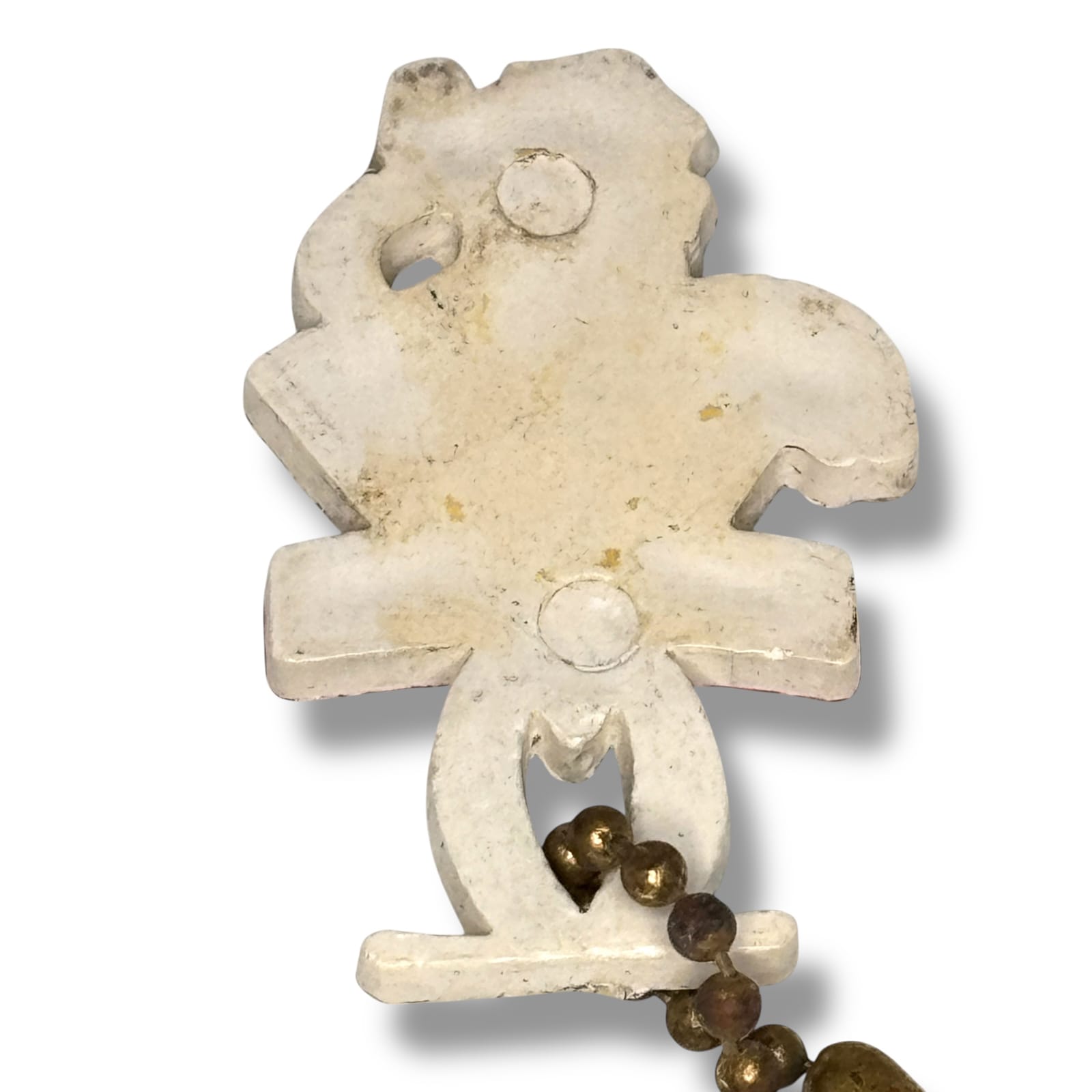 This pin is in fair condition. The chain has light rust and the image has surface wear. Please review the included photos of the actual item to make a complete determination of its condition.