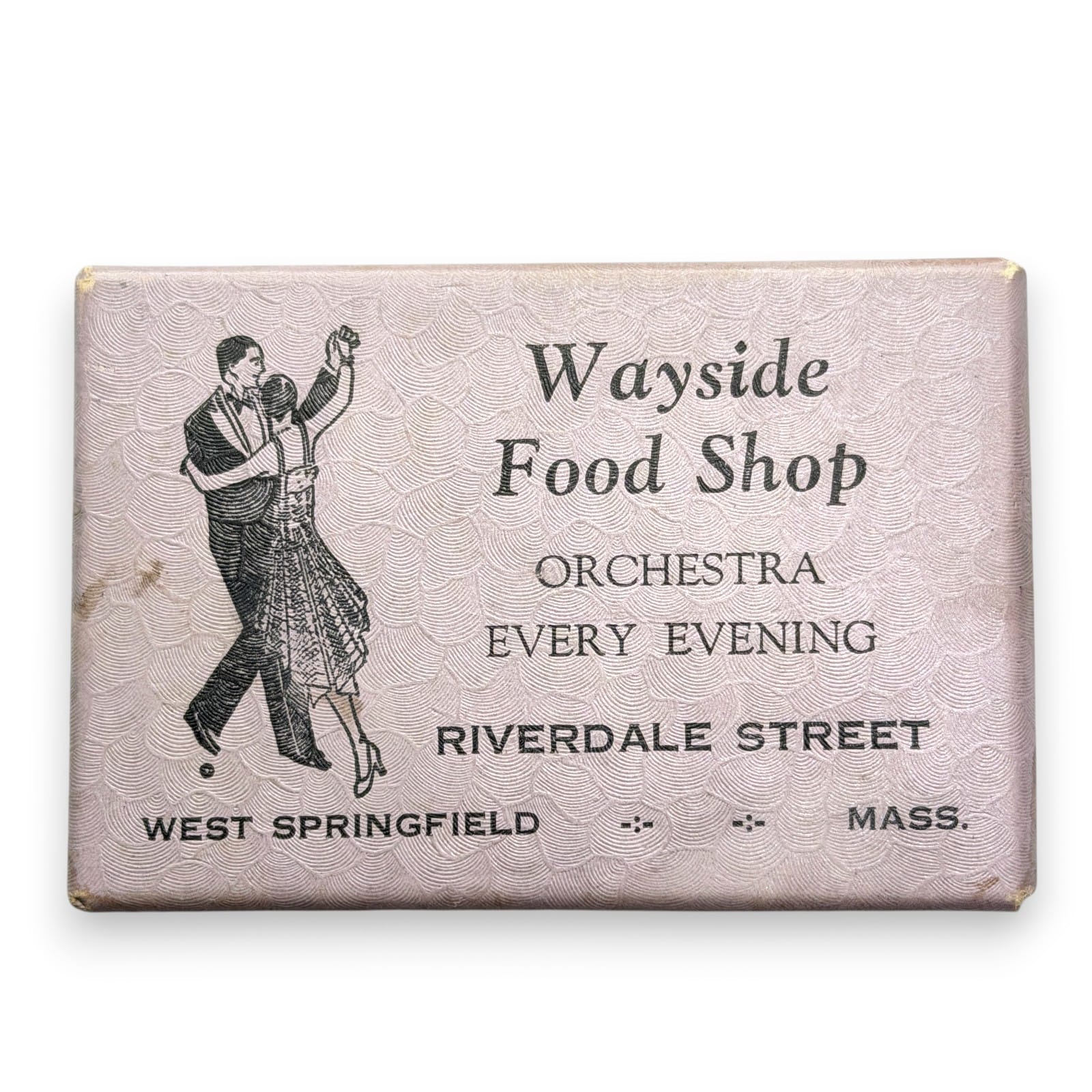 This 1950s advertising pocket mirror promotes the Wayside Food Shop on Riverdale Street in West Springfield, Massachusetts. The front features a dancing couple graphic with “Orchestra Every Evening,” reflecting the live entertainment culture of mid-century neighborhood restaurants. The piece is constructed with a metal body wrapped in pink vinyl, with the advertising printed directly onto the vinyl surface and a glass mirror inset on the reverse.