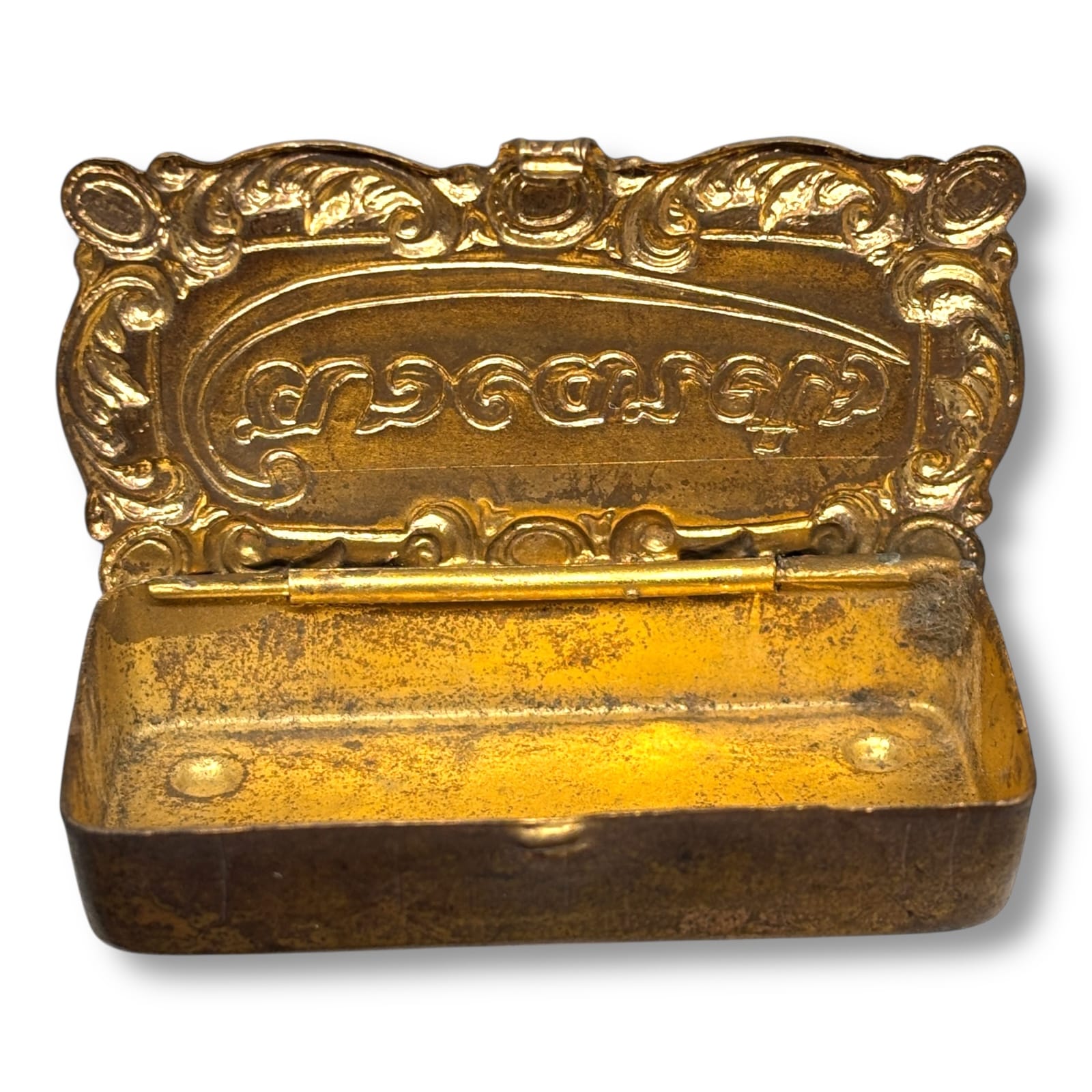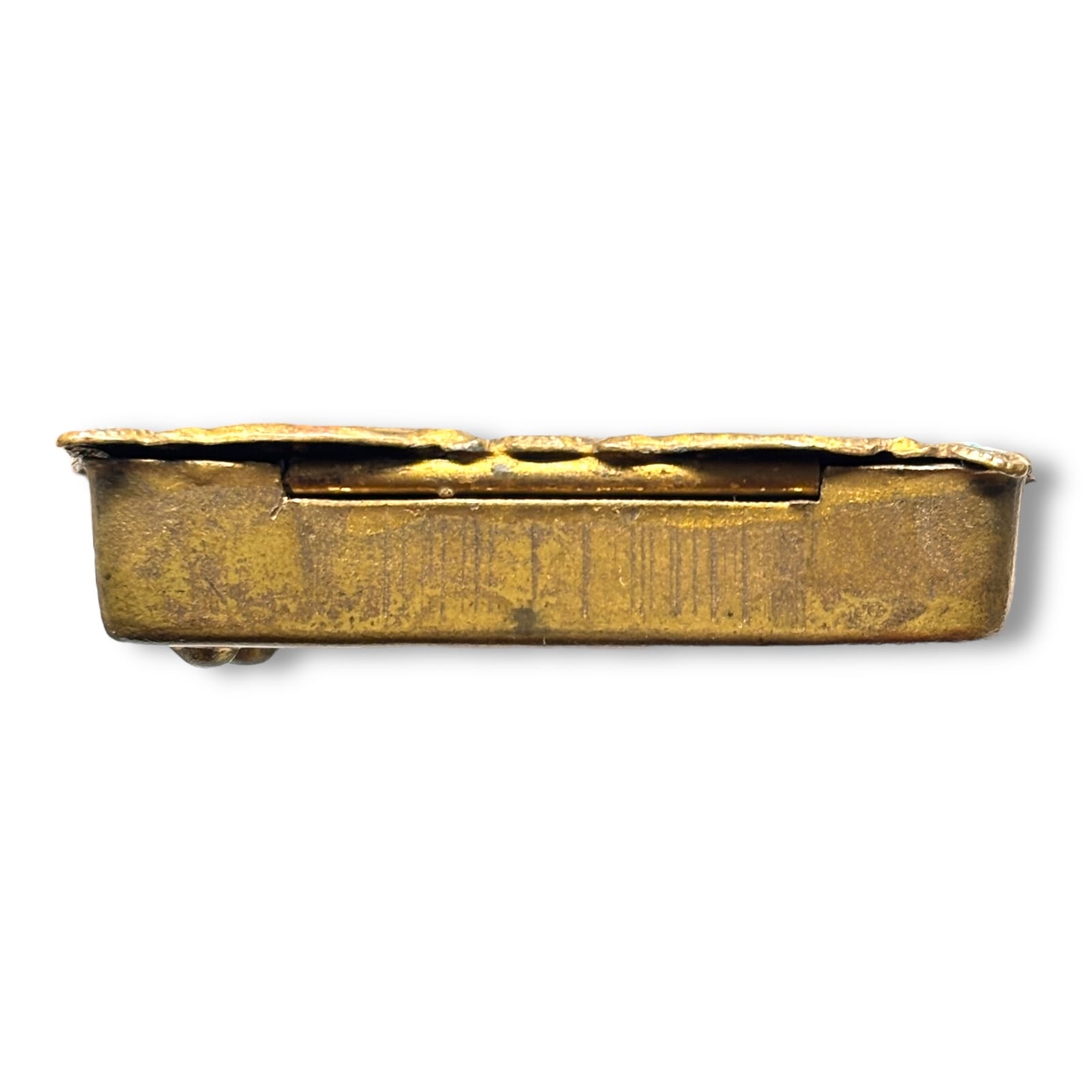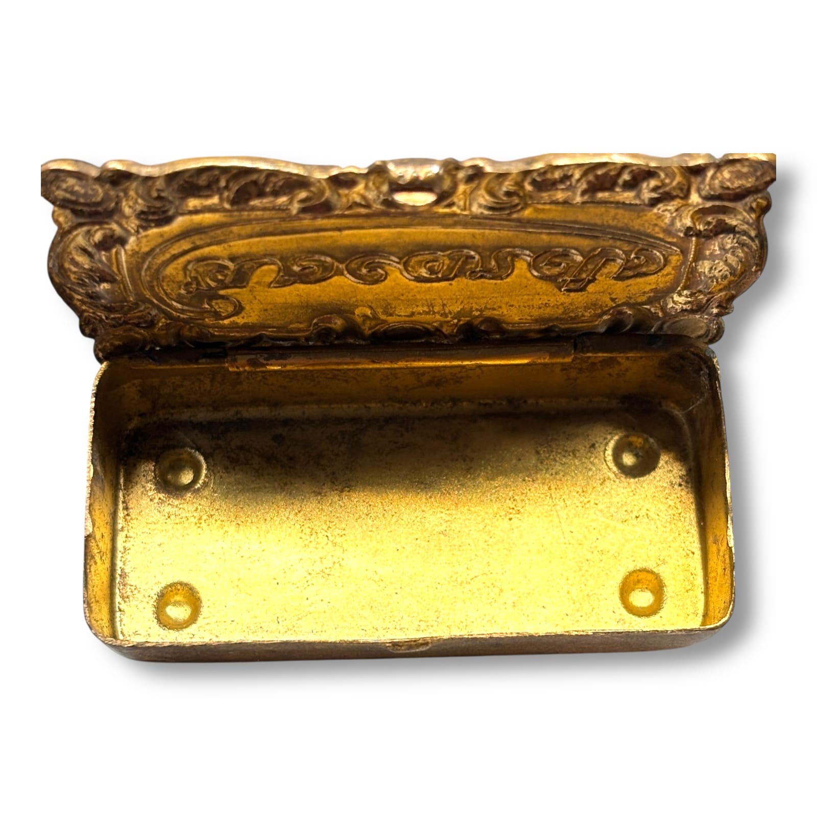 This c.1900 Cascarets advertising pill tin is an ornate Art Nouveau brass and enamel box produced for Sterling Remedy Co. of Chicago. The hinged design features raised scrollwork framing cobalt blue enamel lettering, with a richly gilt interior. Cascarets were heavily marketed as “Candy Cathartics,” and this tin represents one of the more decorative early 20th-century promotional versions. It is crafted from brass with embossed floral borders and retains traces of its original finish.