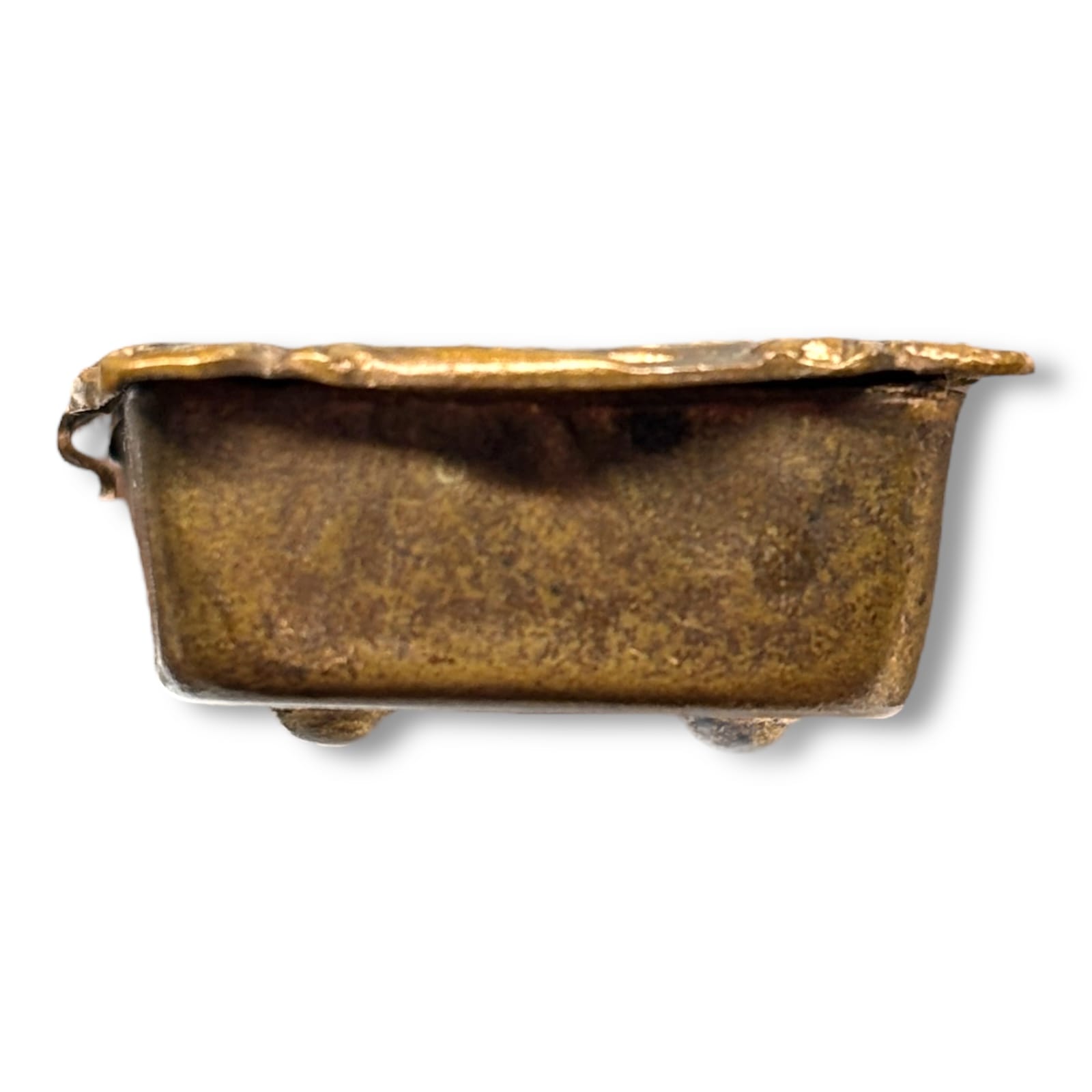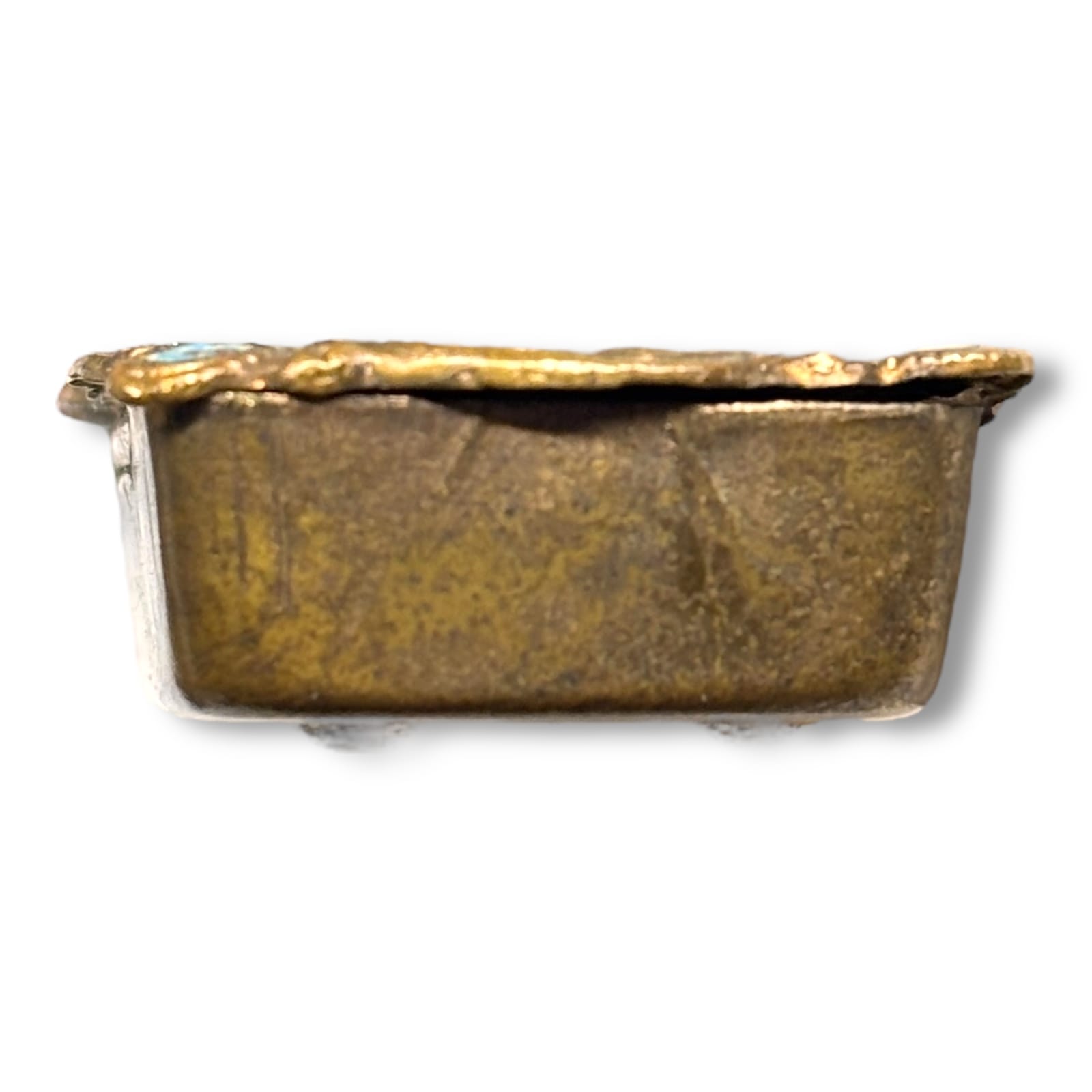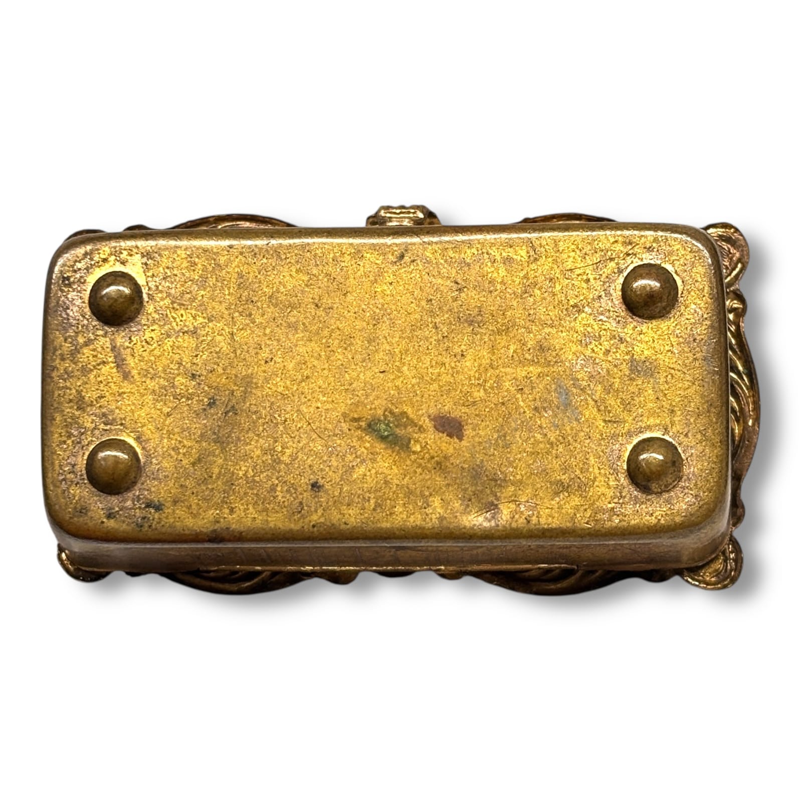 This c.1900 Cascarets advertising pill tin is an ornate Art Nouveau brass and enamel box produced for Sterling Remedy Co. of Chicago. The hinged design features raised scrollwork framing cobalt blue enamel lettering, with a richly gilt interior. Cascarets were heavily marketed as “Candy Cathartics,” and this tin represents one of the more decorative early 20th-century promotional versions. It is crafted from brass with embossed floral borders and retains traces of its original finish.