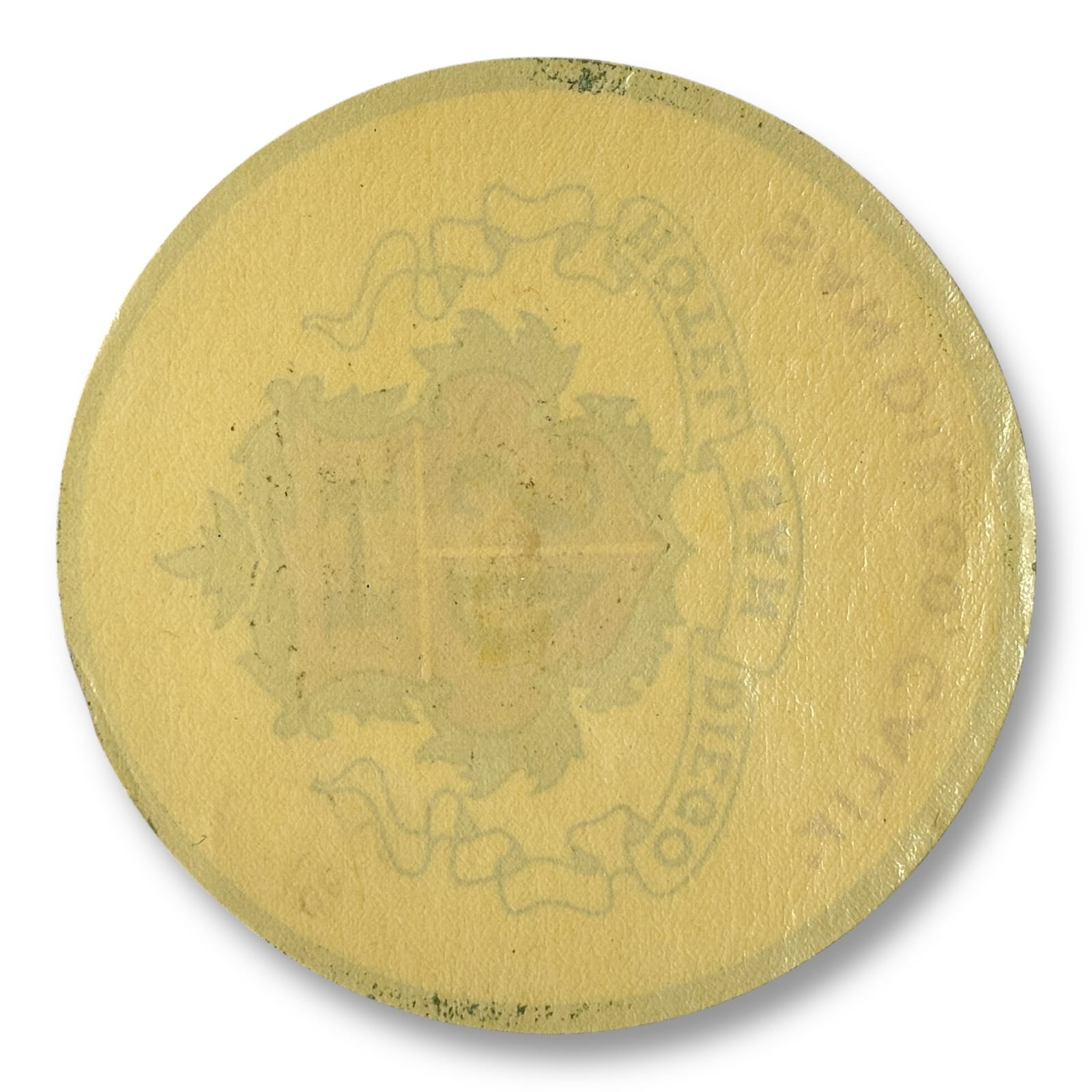Original c.1930s round luggage label from the Hotel San Diego in California. Features a heraldic crest with the initials HSD in red and black surrounded by green leaves, with banner text reading Hotel San Diego and city location printed below. These labels were used as promotional travel advertising during the golden age of rail and steamship travel and remain collectible examples of regional hotel history.