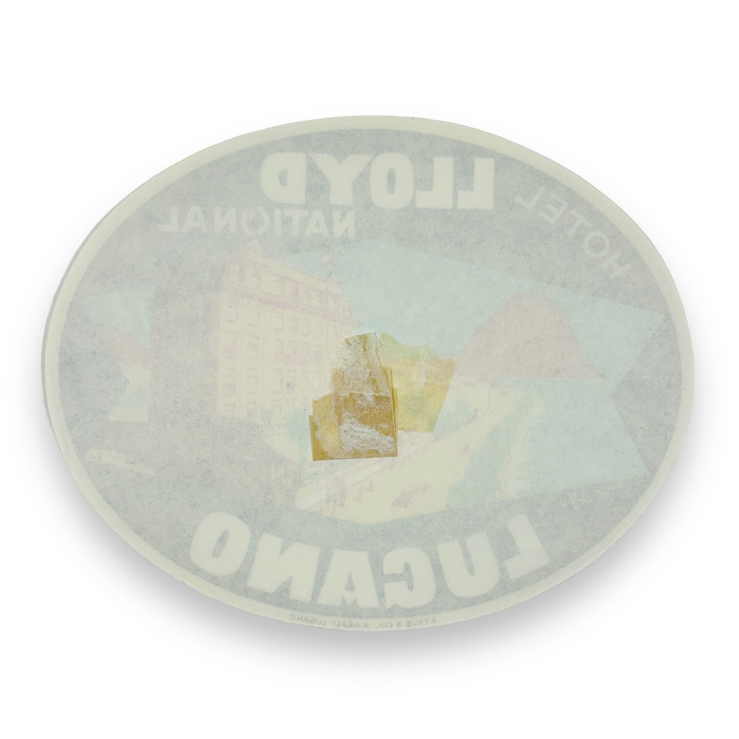This lot is a scarce, original vintage luggage label from the Hotel Lloyd National in Lugano, Switzerland. The art deco label created by Trub is c.1930s and shows the hotel sitting on the banks of the Lake Lugano, all in bright colors.