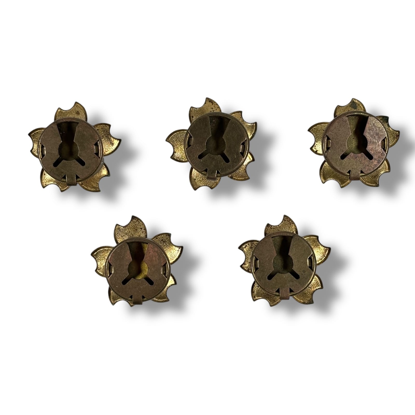 This lot includes five vintage Japanese hana-buton, or decorative button covers, dating to c.1950s. Each brass piece is shaped as a five-petal cherry blossom (sakura), traditionally used to adorn kimono or haori garments. The gold-toned surface features fine petal texturing and a recessed center. Each measures approximately 1″ in diameter with an inset slot-type fitting on the reverse. These display beautiful patina from age and use and represent postwar mid-century Japanese craftsmanship at its finest.