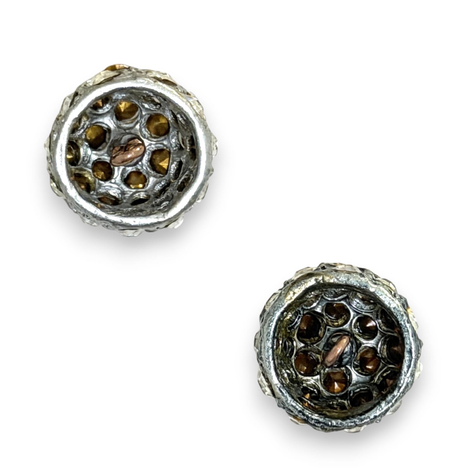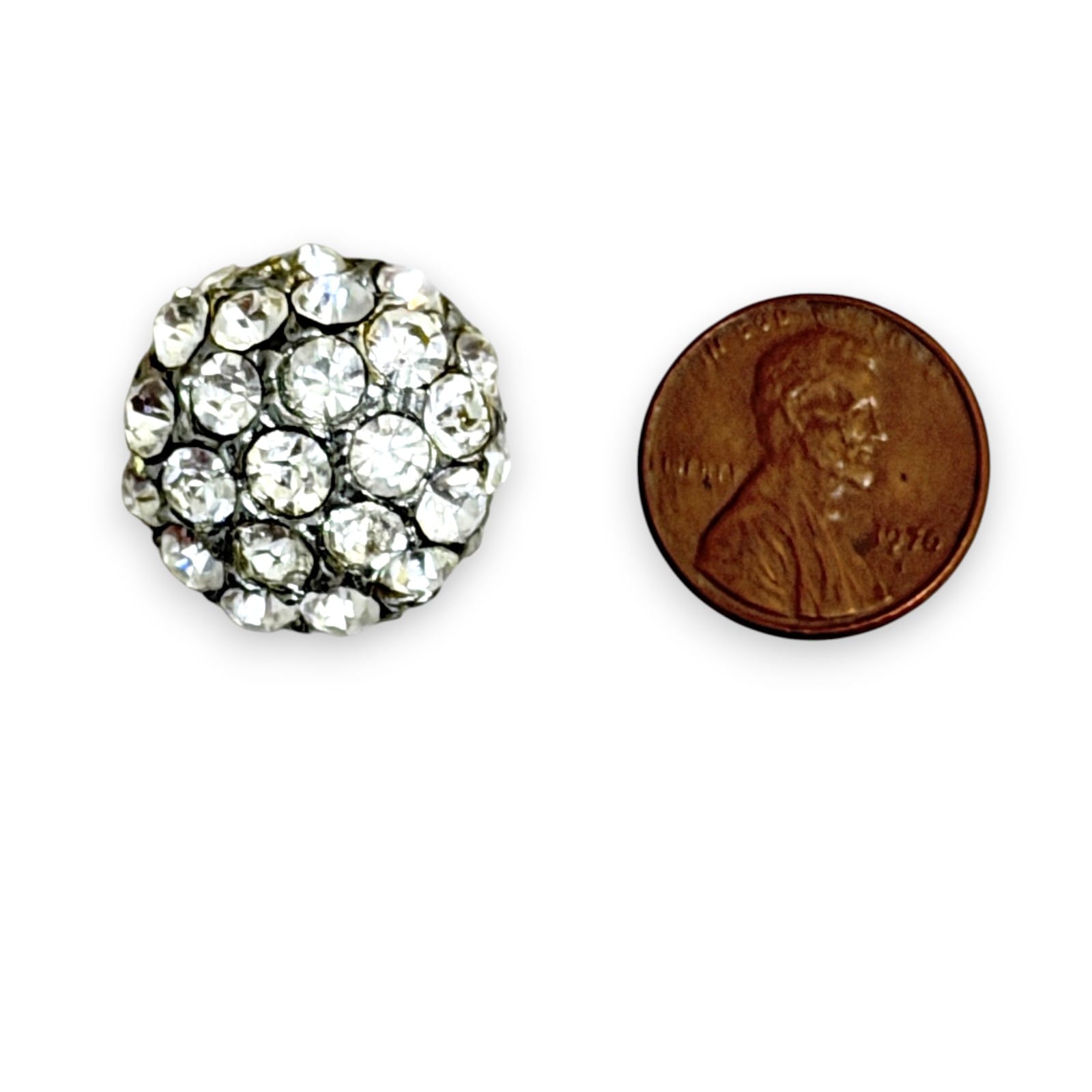 Pair of mid-century 1950s silver-tone metal shank buttons with a rounded dome form and an all-over surface of clear brilliant-cut glass rhinestones. The open-back basket construction and copper wire shanks give them the look of vintage dress or coat buttons made for sparkle and dimensional trim.