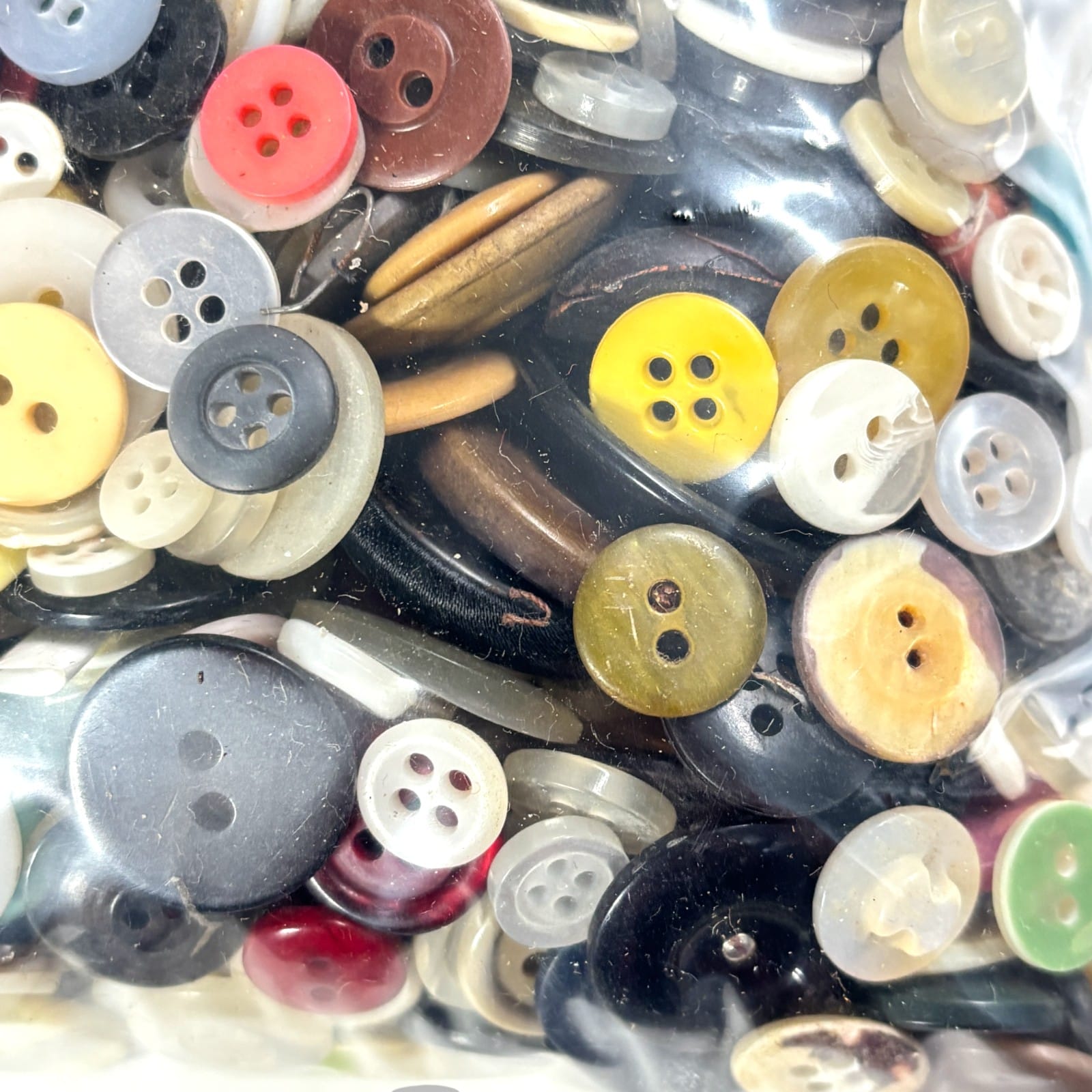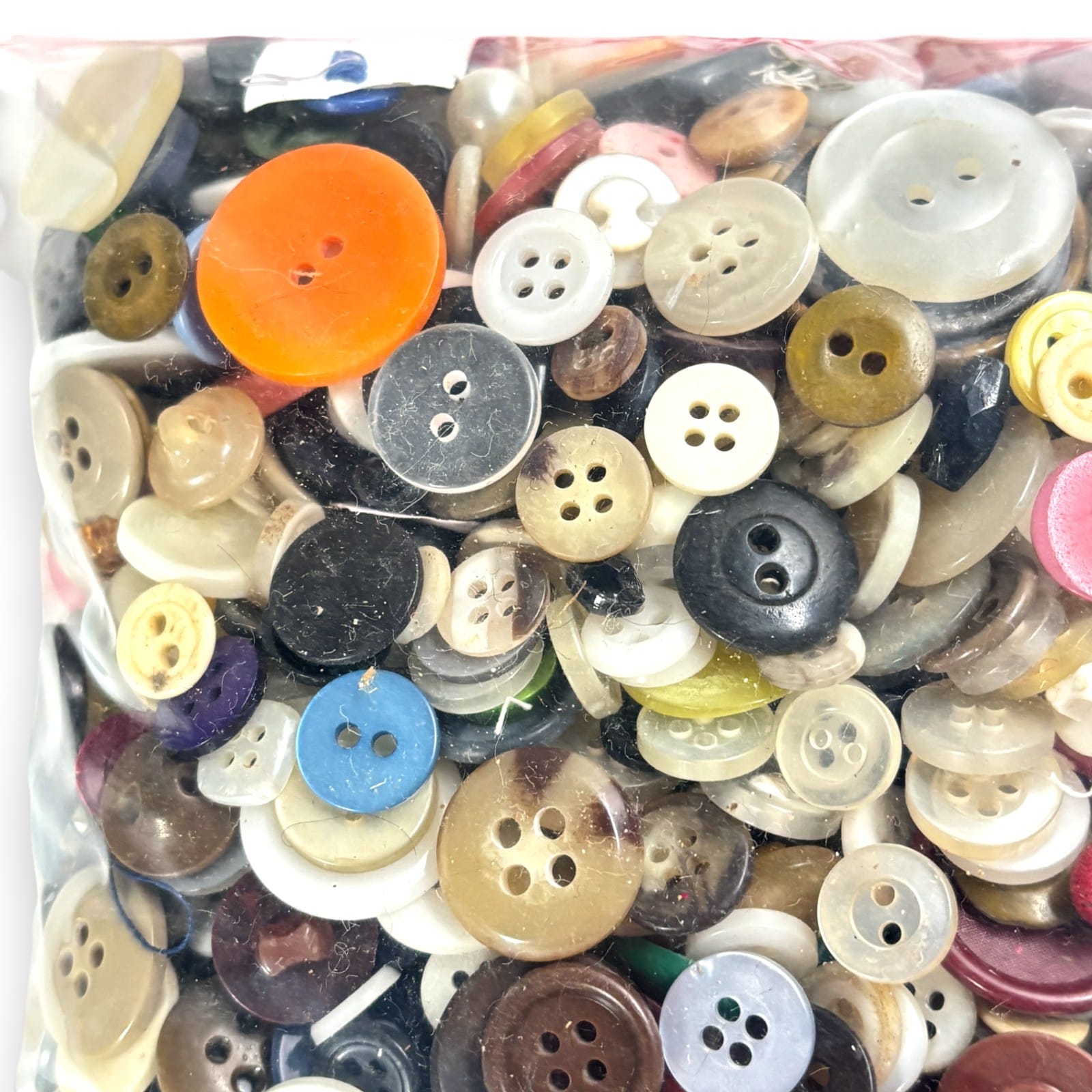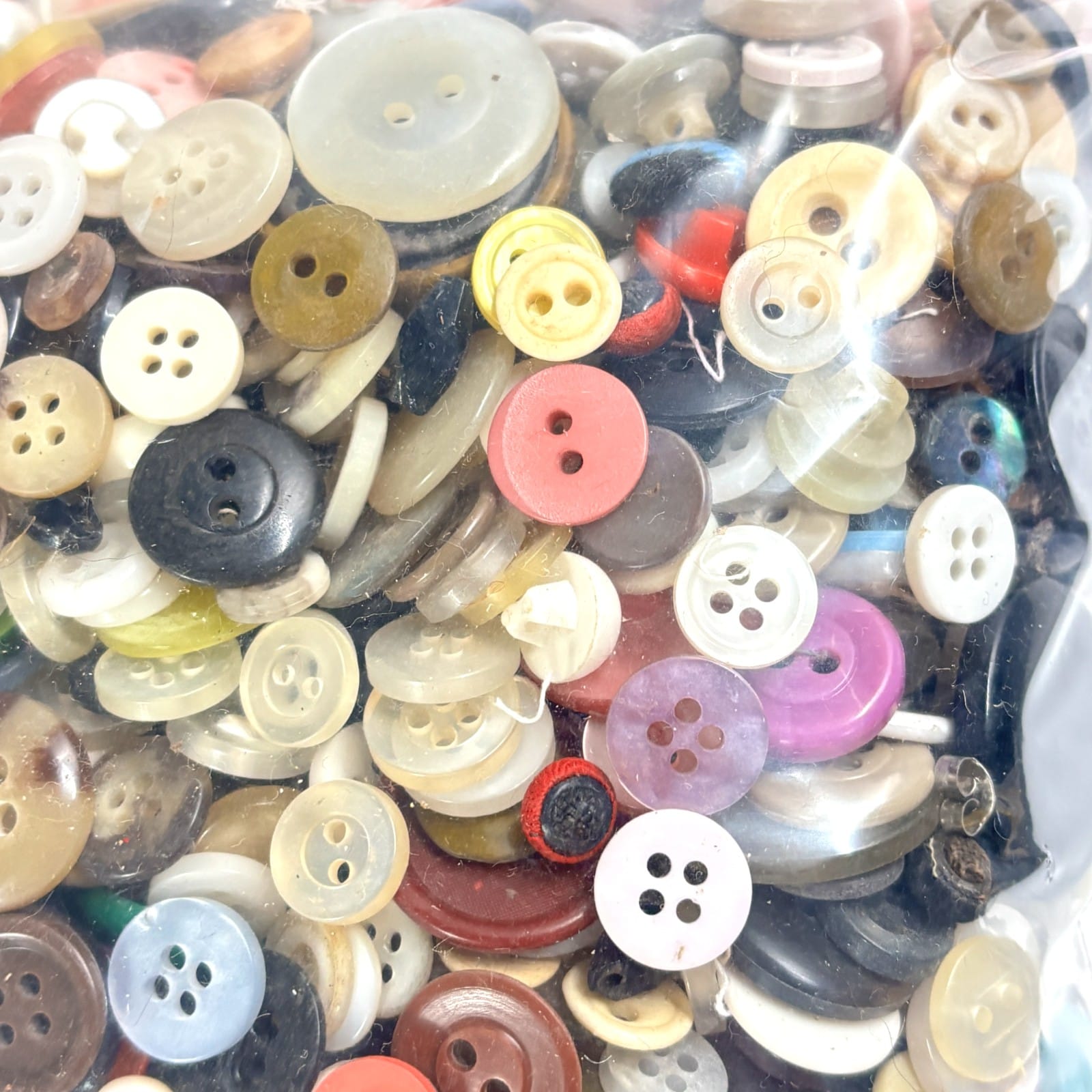 This mixed lot of sew-through (and a few shank) buttons dates to the mid-century era, c.1955, and consists primarily of molded plastic buttons in a wide range of colors and sizes suitable for sewing, mending, and craft use. The assortment reflects common utilitarian button production of the mid-20th century and includes varied finishes and forms typical of household and garment applications from the period.