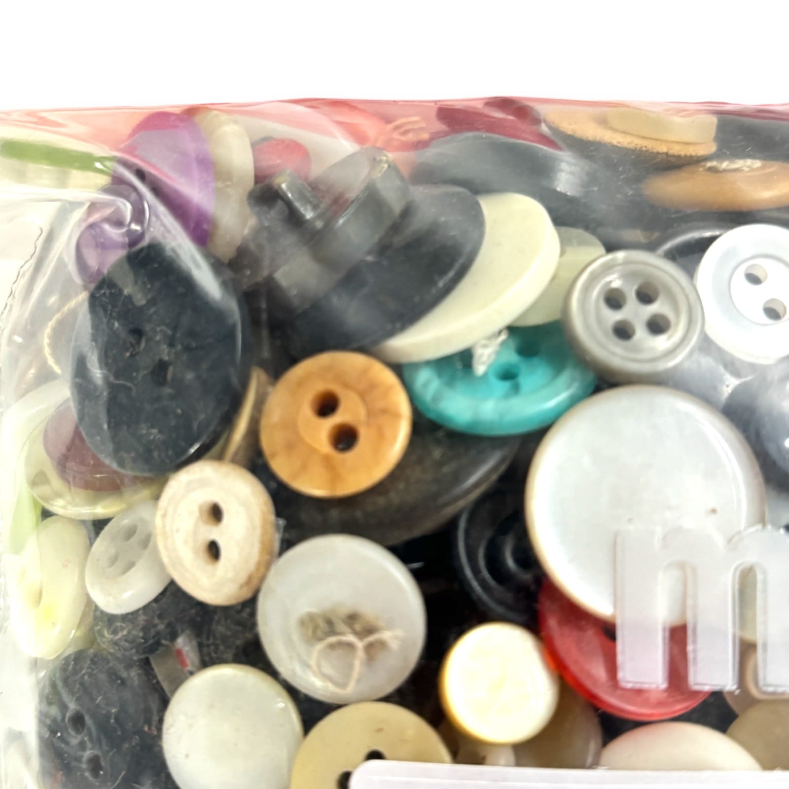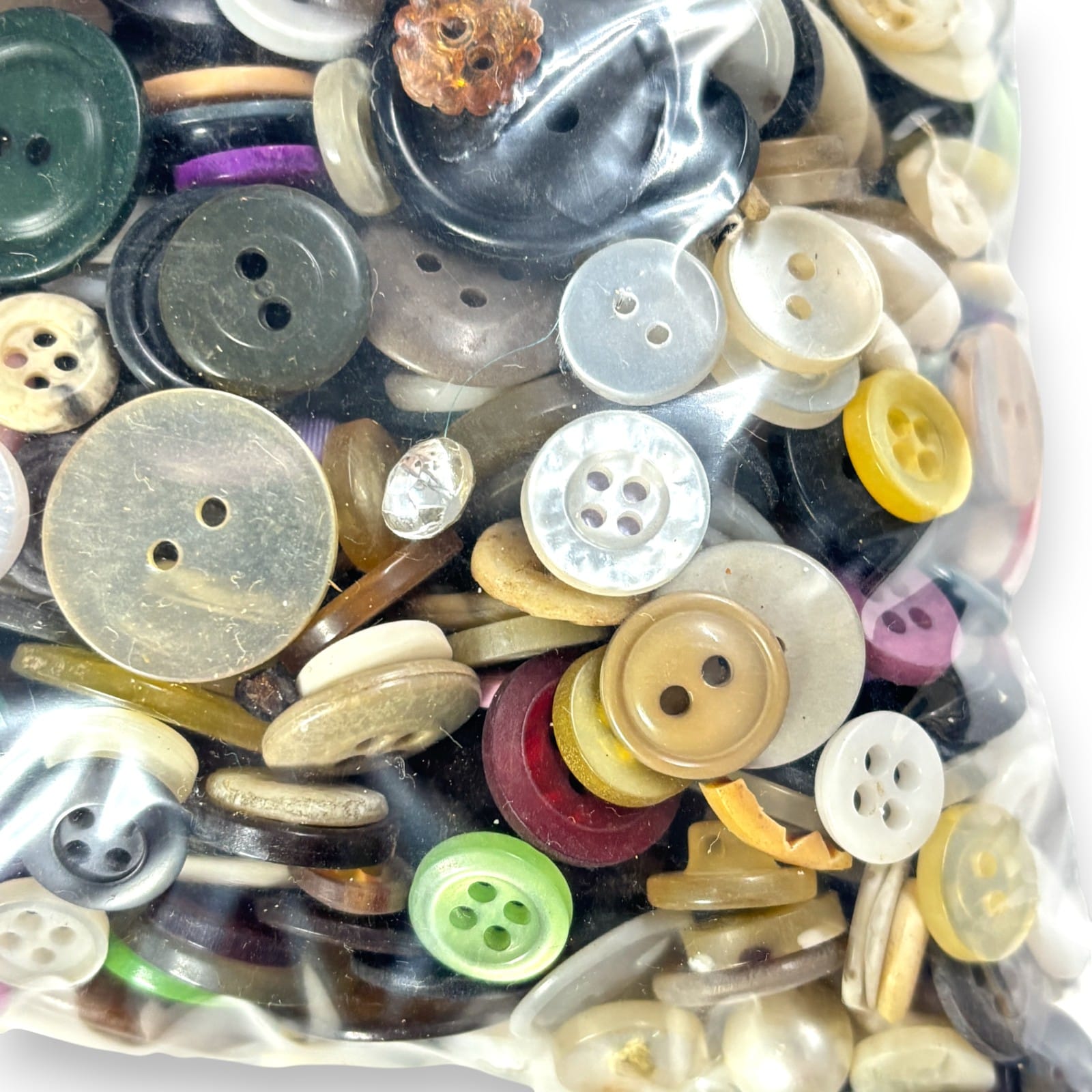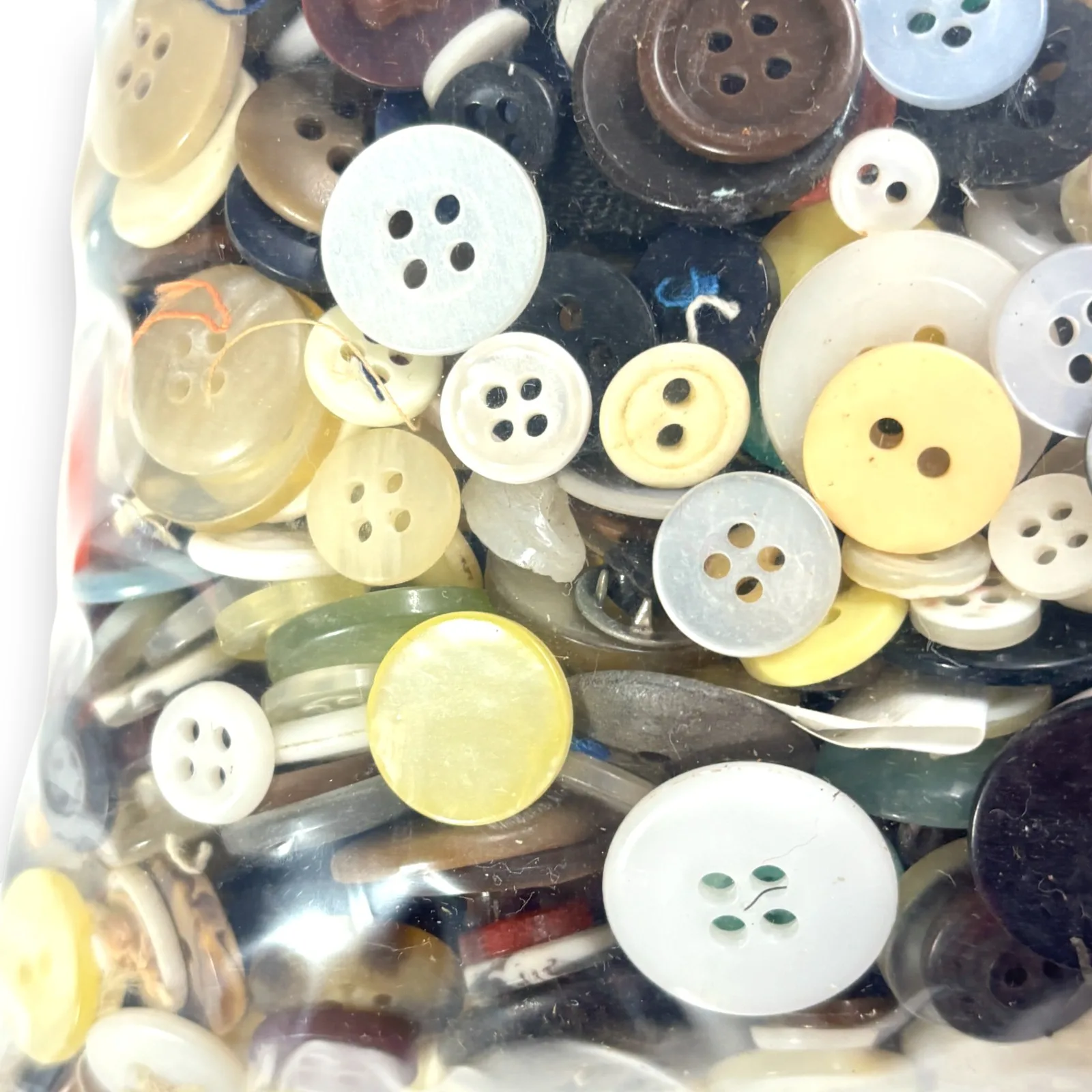 This mixed lot of sew-through (and a few shank) buttons dates to the mid-century era, c.1955, and consists primarily of molded plastic buttons in a wide range of colors and sizes suitable for sewing, mending, and craft use. The assortment reflects common utilitarian button production of the mid-20th century and includes varied finishes and forms typical of household and garment applications from the period.