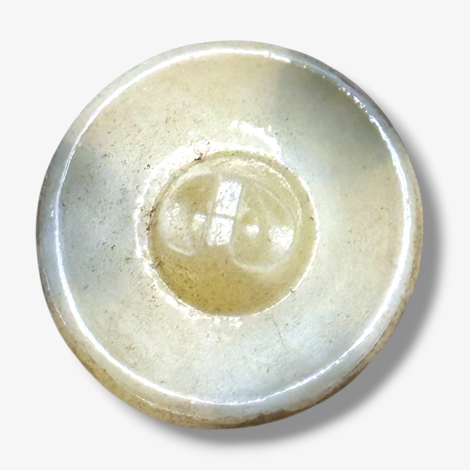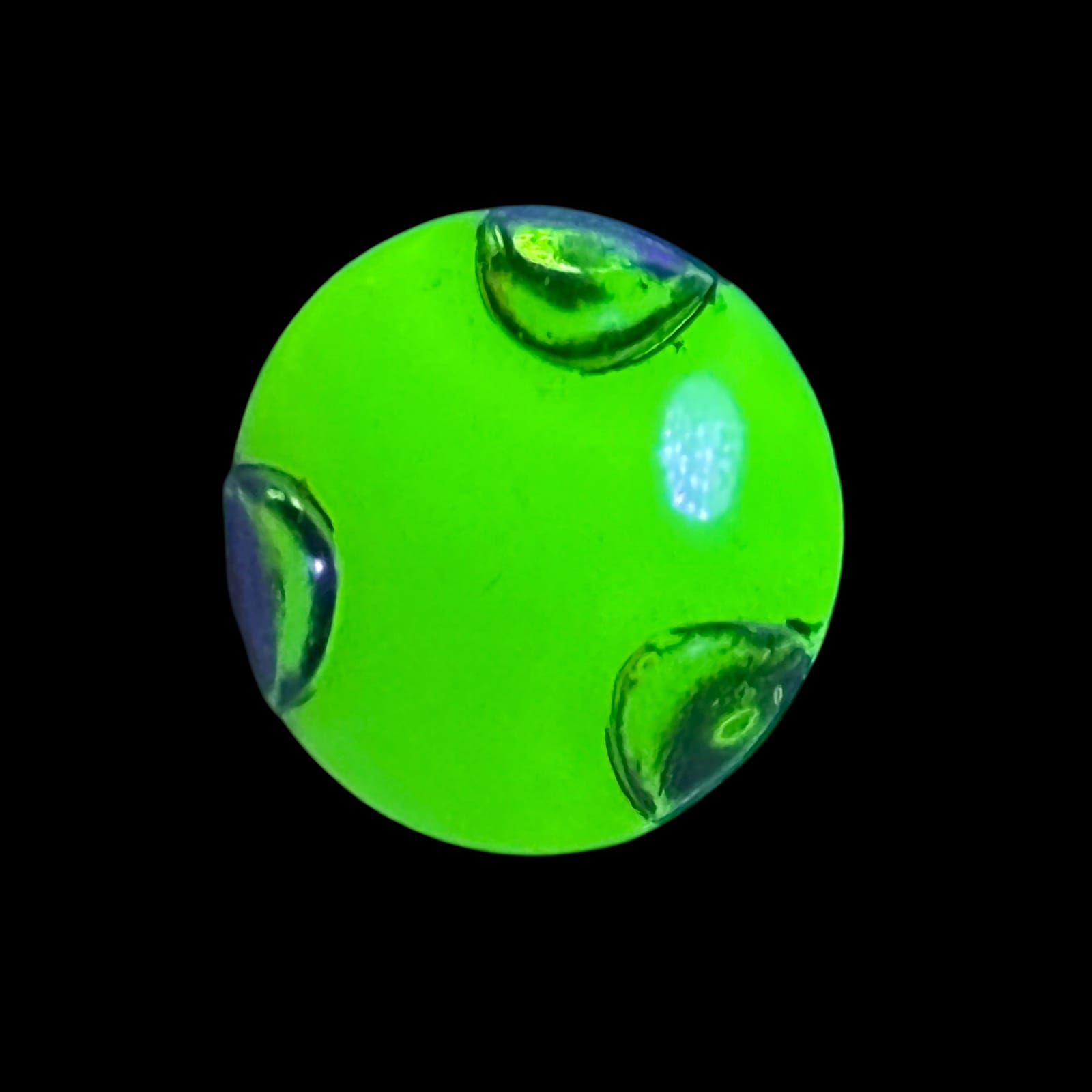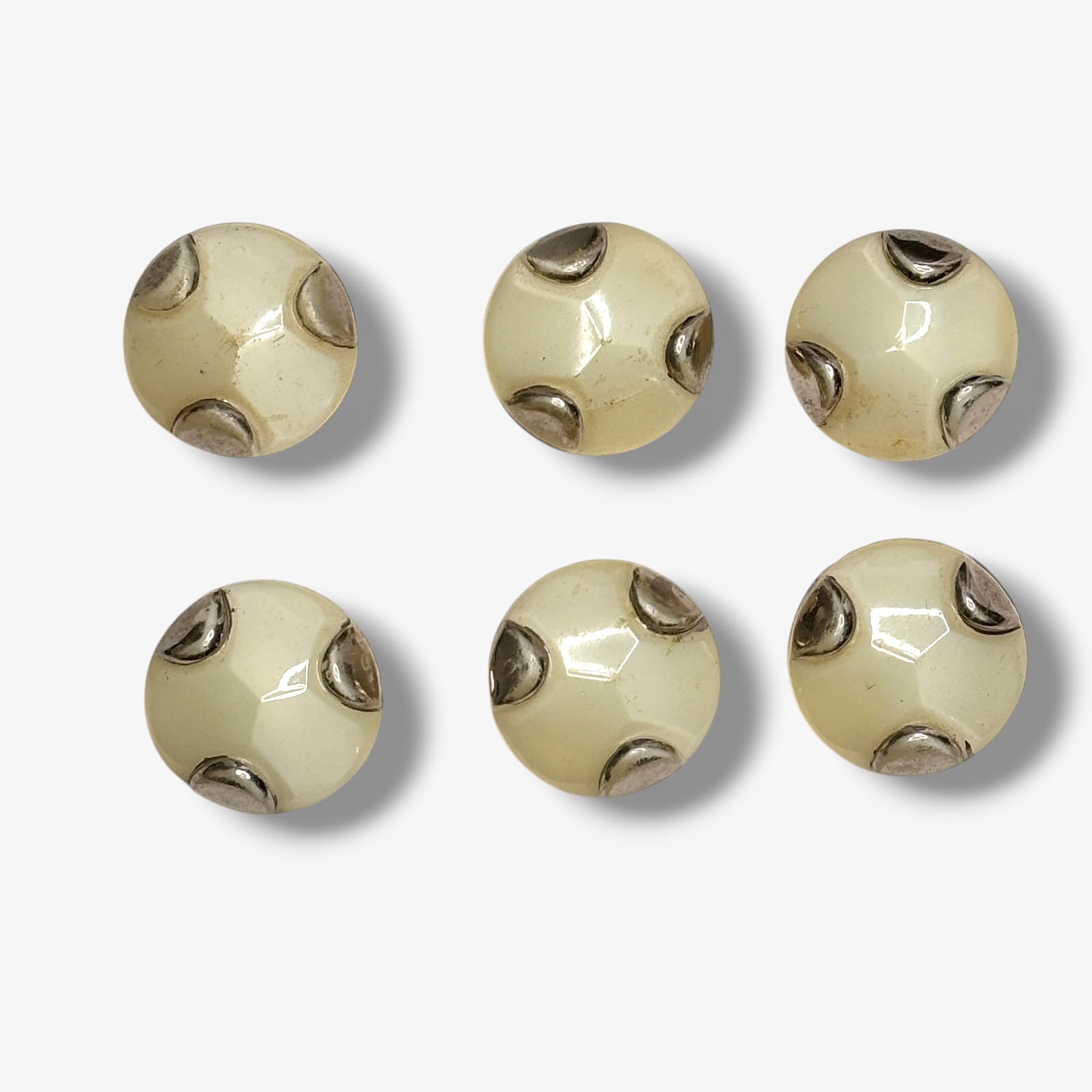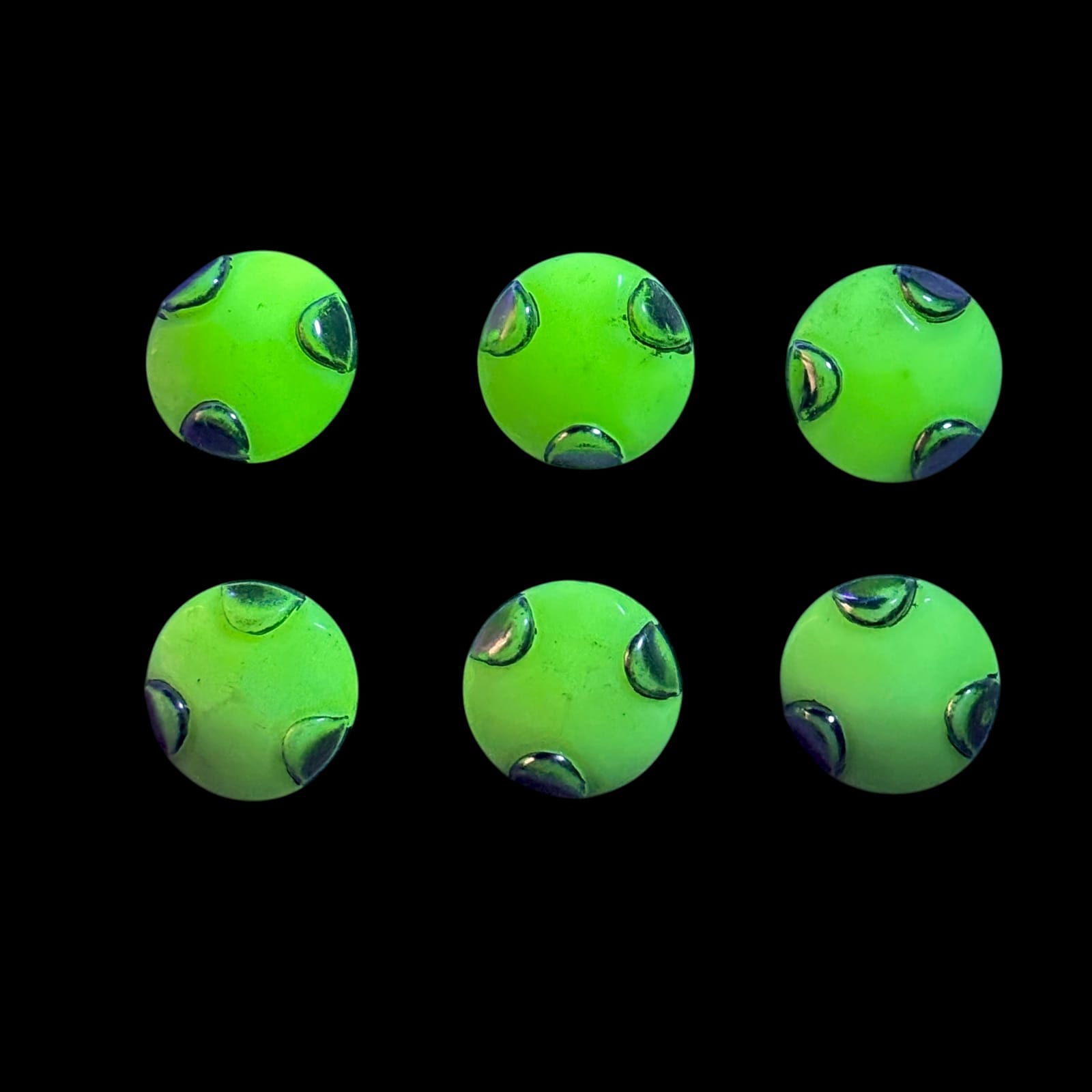 Set of six mid-20th century molded Vaseline glass buttons featuring domed tops with four silver-toned accents around the edge. Each measures approximately 1 inch in diameter and glows vividly under ultraviolet light, confirming uranium glass content typical of 1930s–1950s Bohemian or German manufacture. These display beautifully for collectors of vintage glass or sewing notions.
