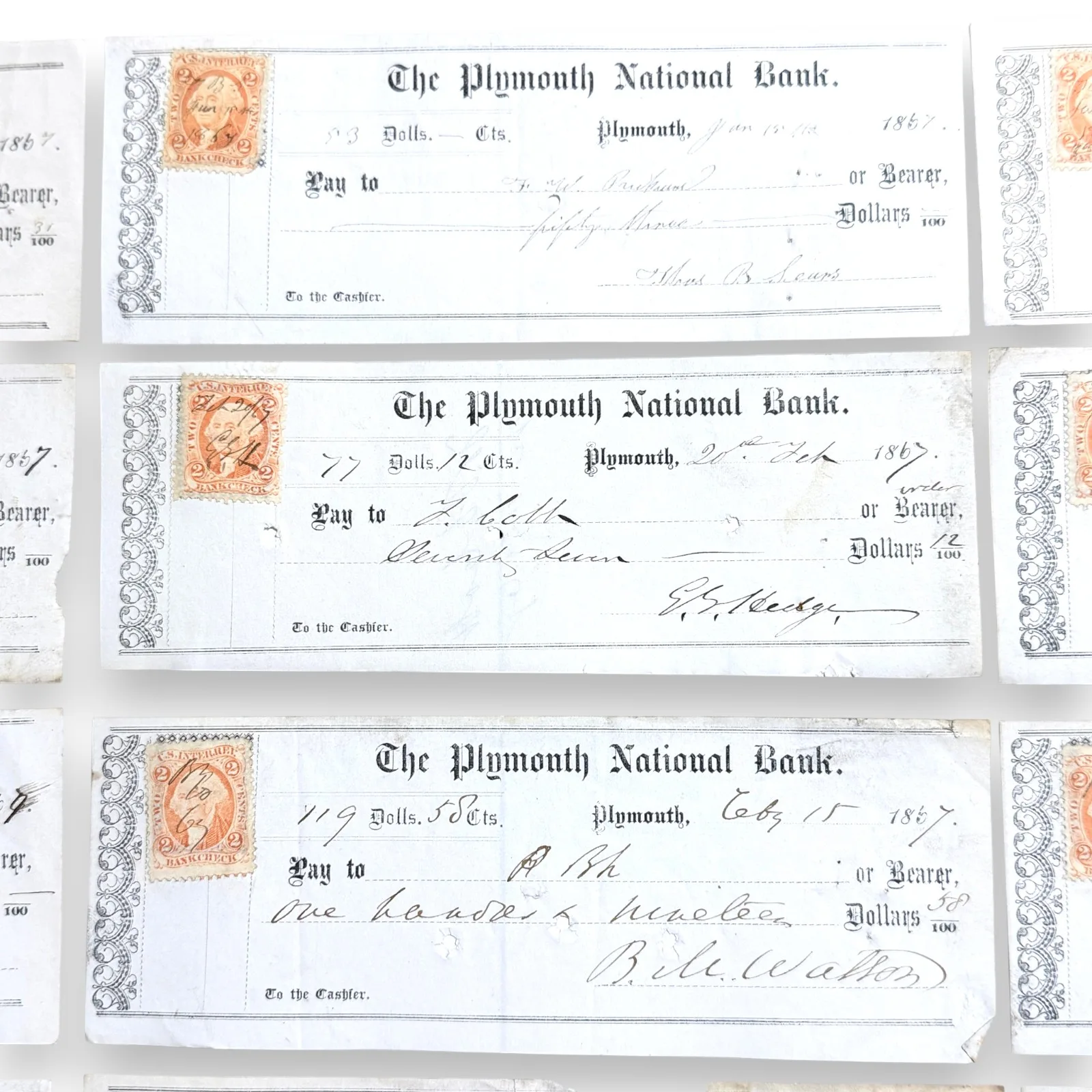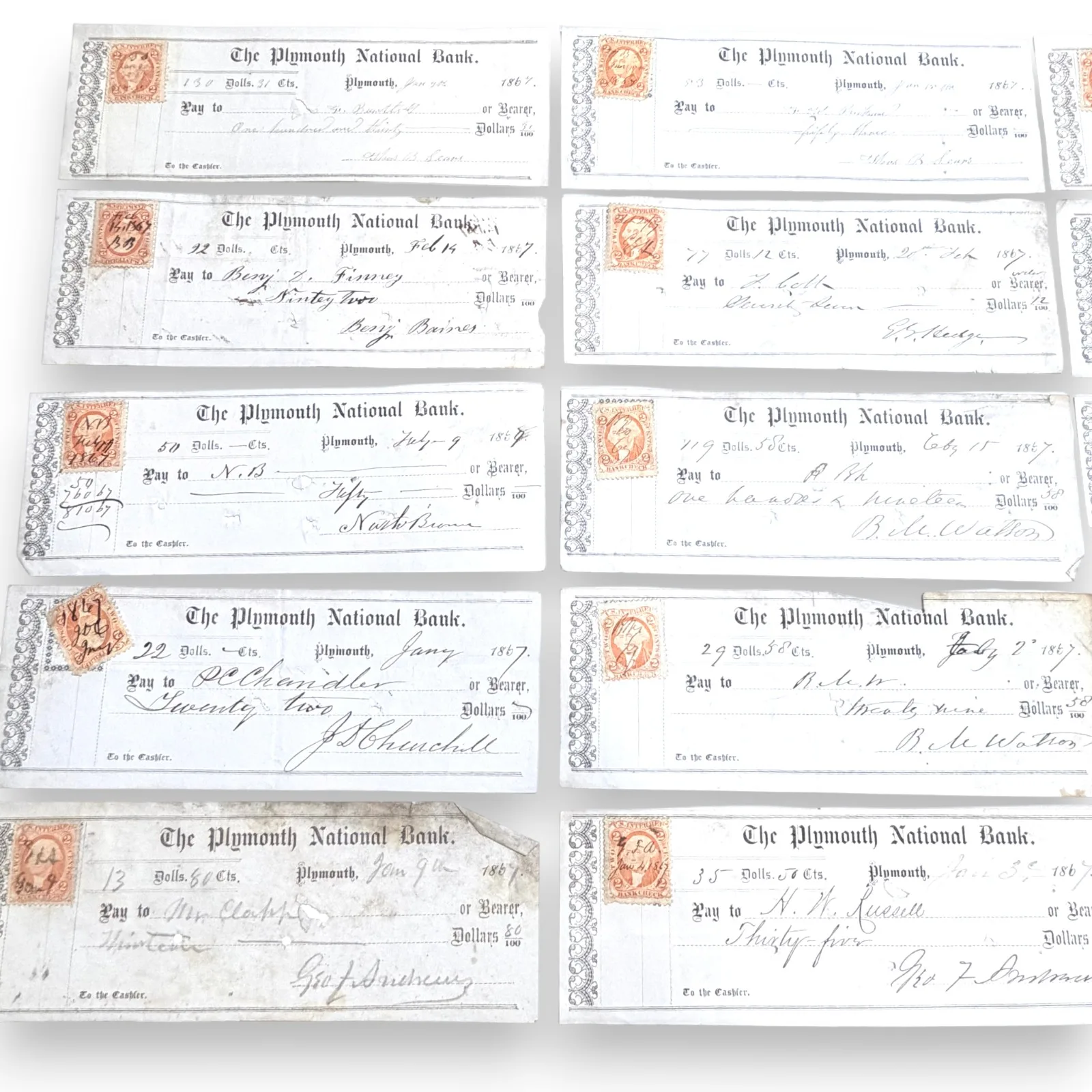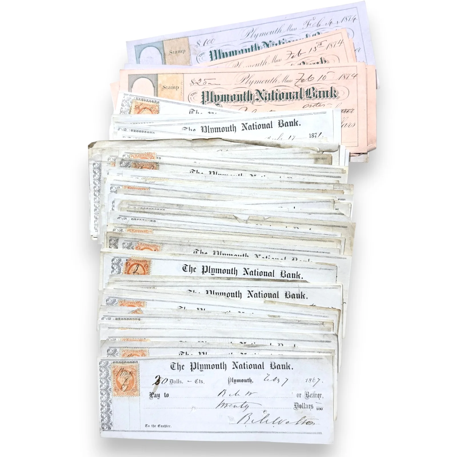 Group of 75 original Plymouth National Bank cancelled checks issued in Plymouth, Massachusetts and dated 1867 to 1874, with the majority from 1867. This lot represents post-Civil War New England banking ephemera in two period formats, including the smaller engraved checks and a small number of larger later examples. Most retain orange U.S. revenue stamps and many are endorsed on the reverse, reflecting period financial transactions and regional commerce.
