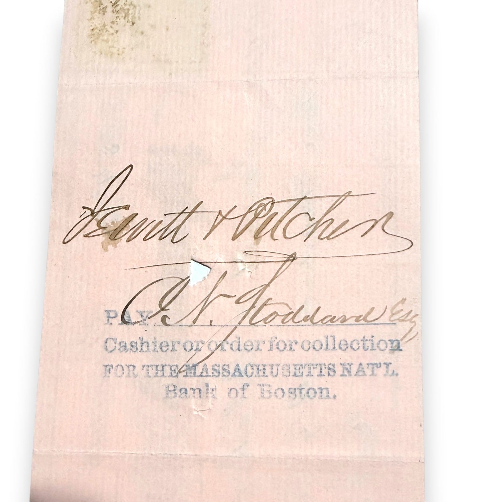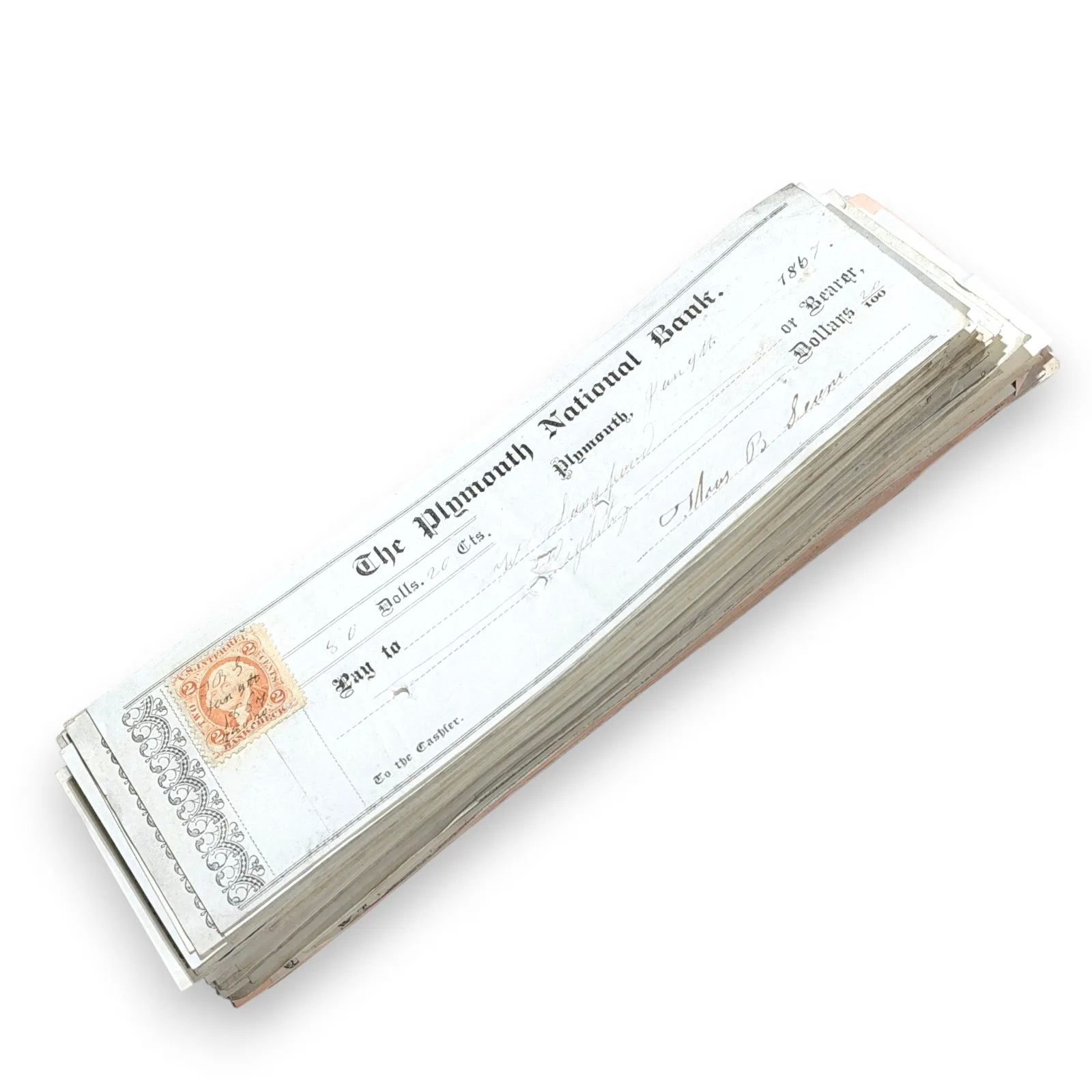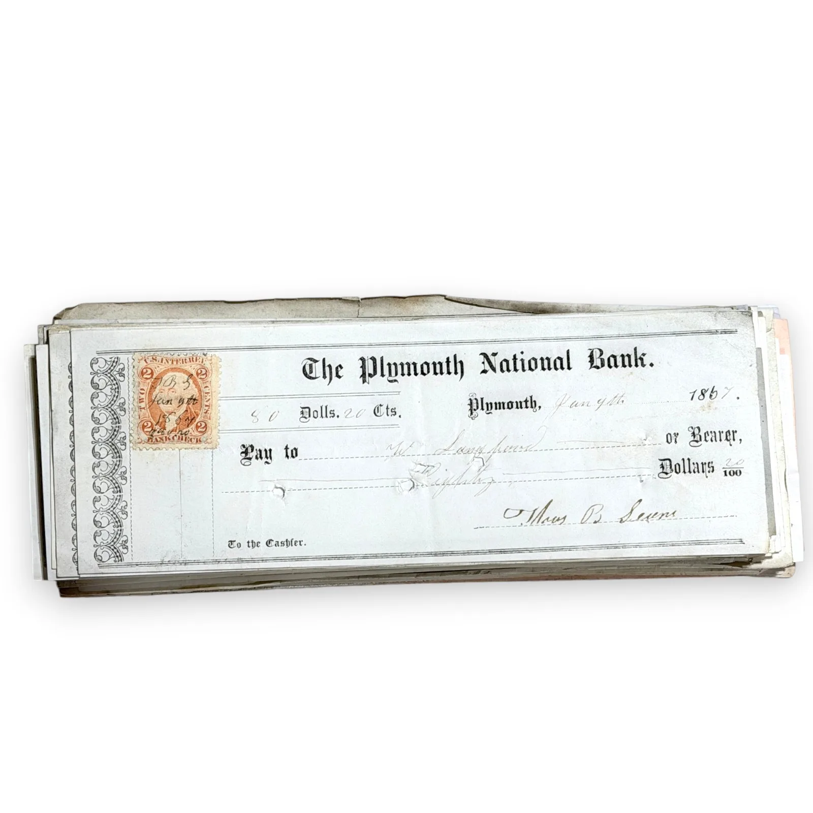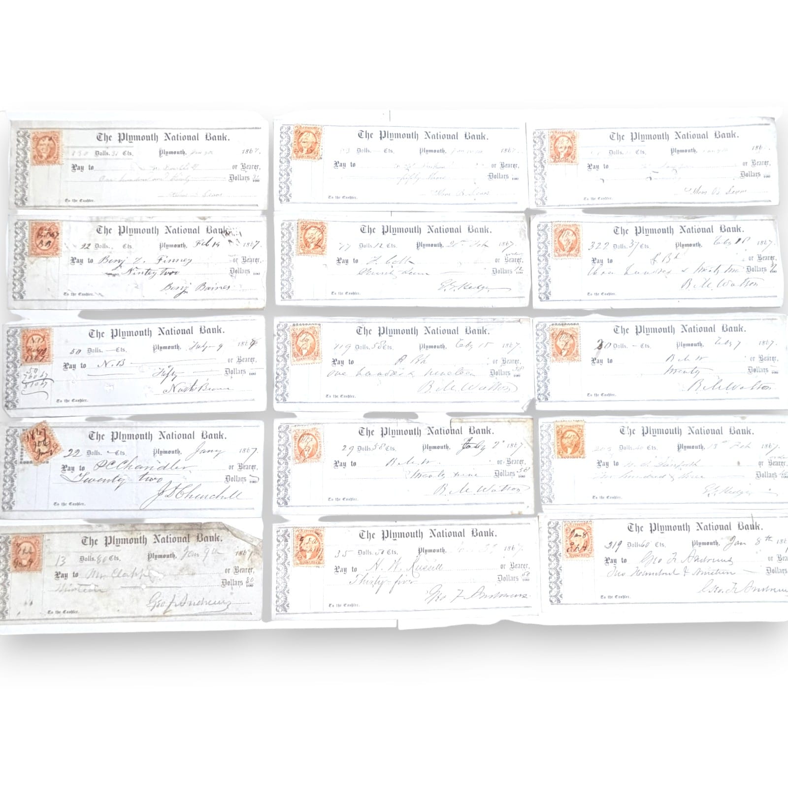 Group of 75 original Plymouth National Bank cancelled checks issued in Plymouth, Massachusetts and dated 1867 to 1874, with the majority from 1867. This lot represents post-Civil War New England banking ephemera in two period formats, including the smaller engraved checks and a small number of larger later examples. Most retain orange U.S. revenue stamps and many are endorsed on the reverse, reflecting period financial transactions and regional commerce.