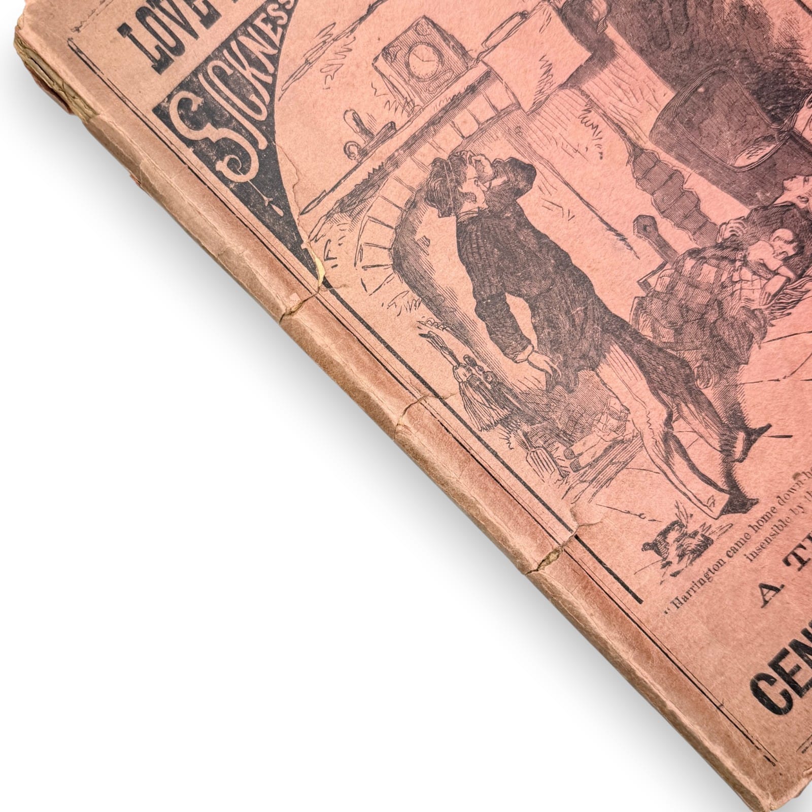 Issued in 1876 by the Old Franklin Publishing House of Philadelphia, this Victorian story booklet is a scarce example of Centennial-era popular print culture. The pamphlet contains Love and Death in a Barn together with a second story, Bertha Barton or The Coney Island Mystery, and features dramatic woodcut illustrations and a striking printed wrapper tied to the phrase Centennial City Life.