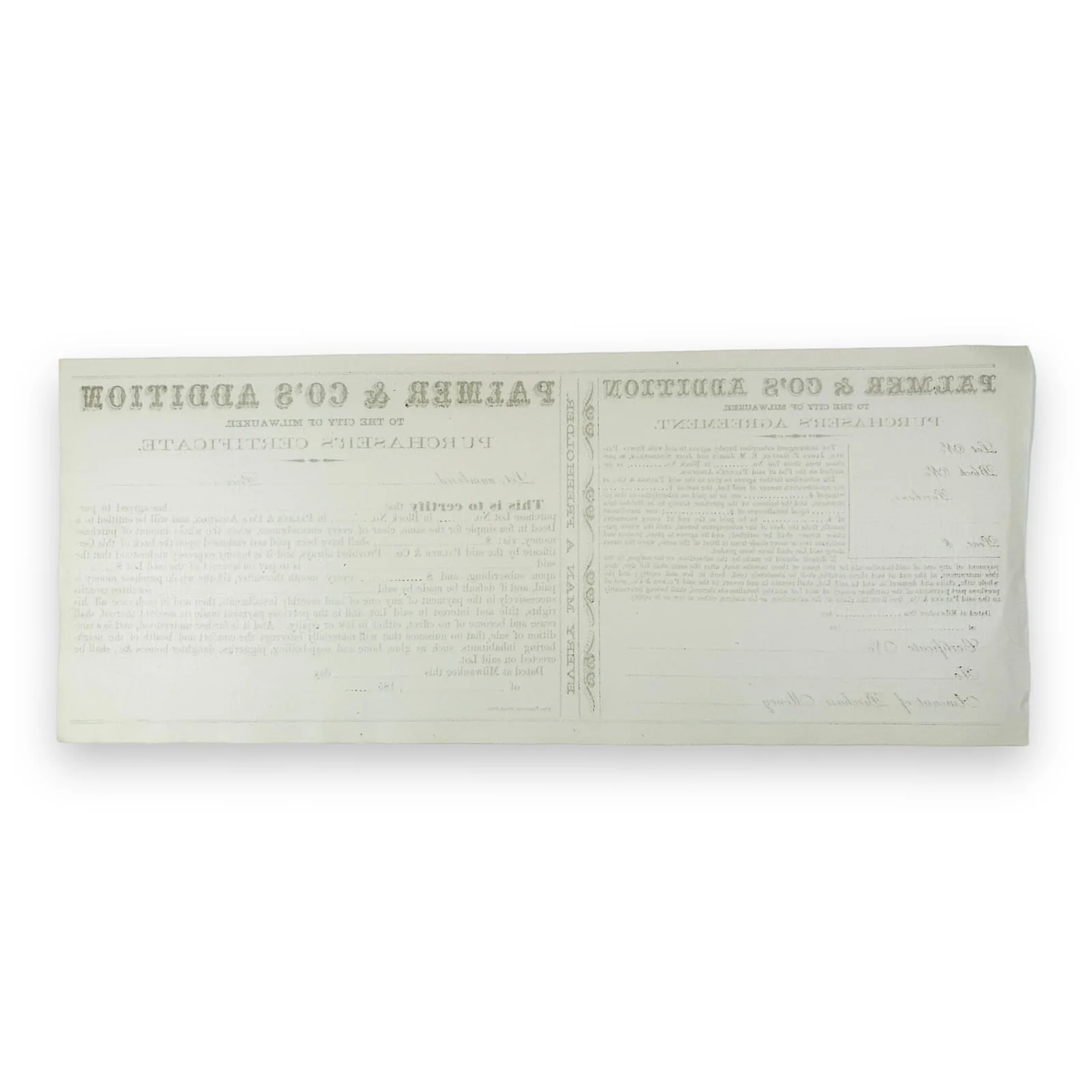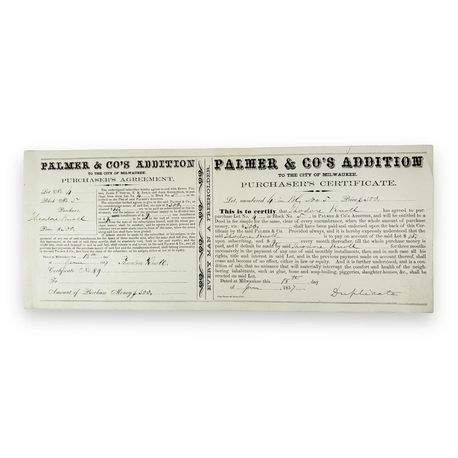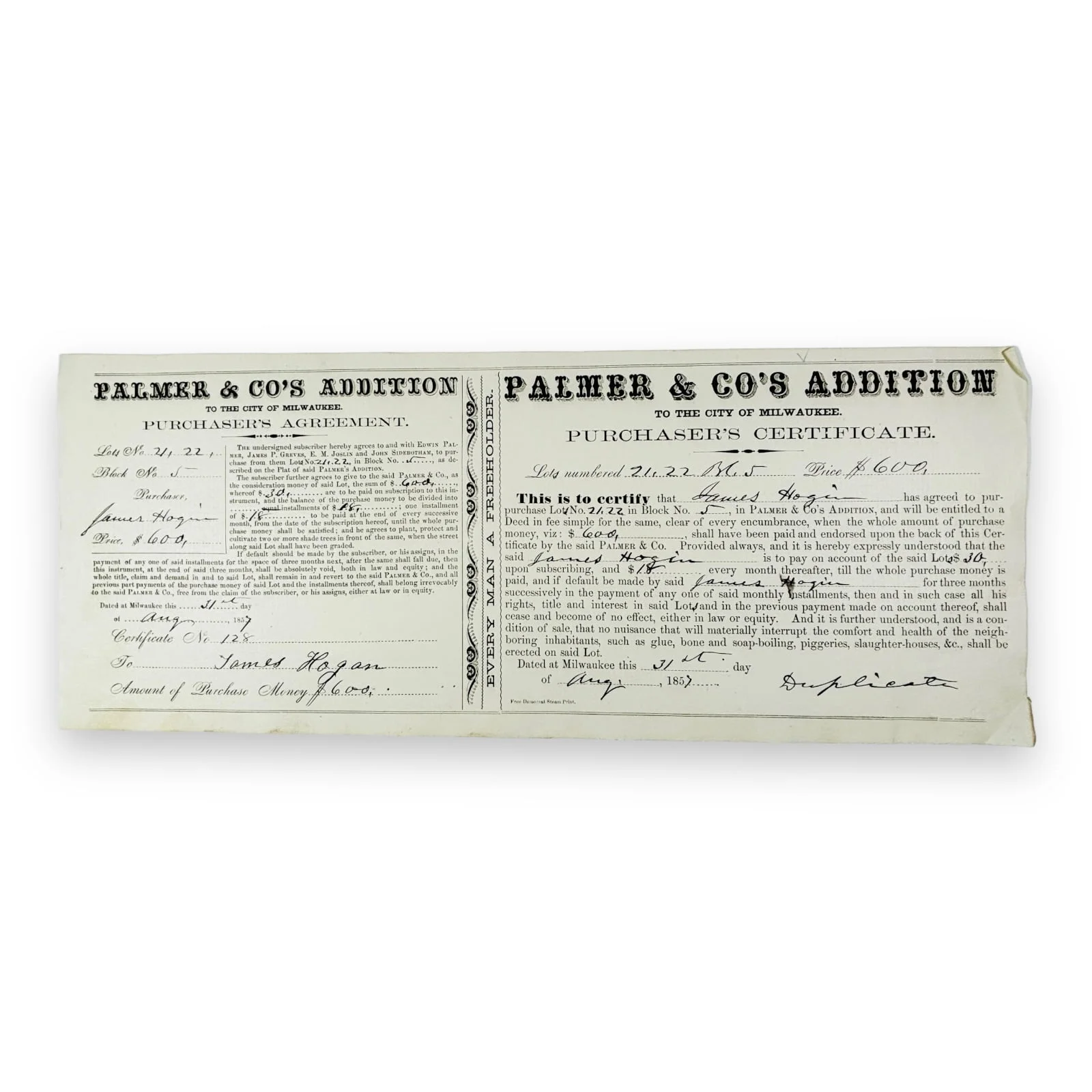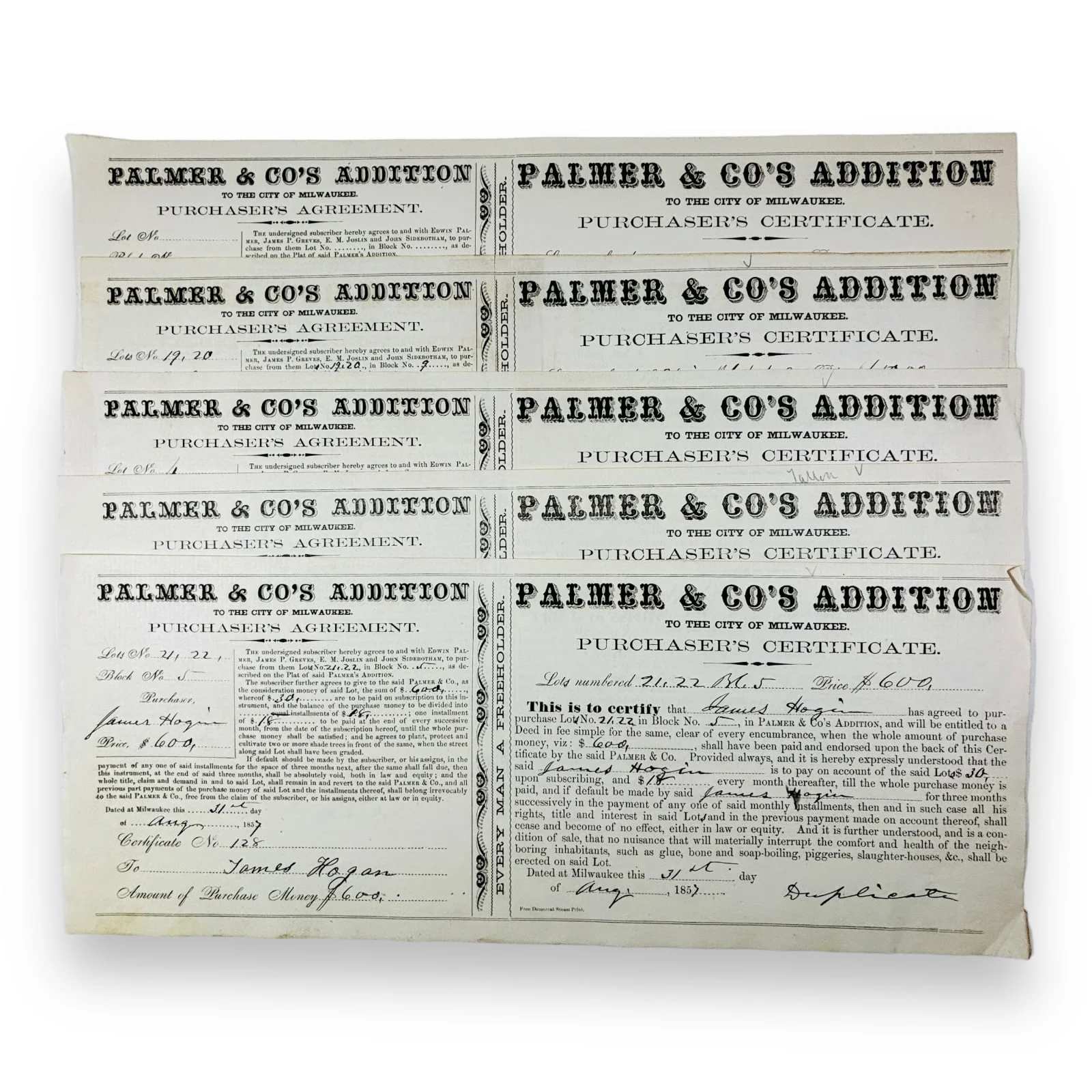This lot is a group of five 1857 land purchase receipts for property in the Palmer and Company Addition of Milwaukee, Wisconsin. Four of the documents are completed with a purchaser’s information and the fifth one is a blank copy. Each document is approximately 5.5″ tall by 13.75″ wide.