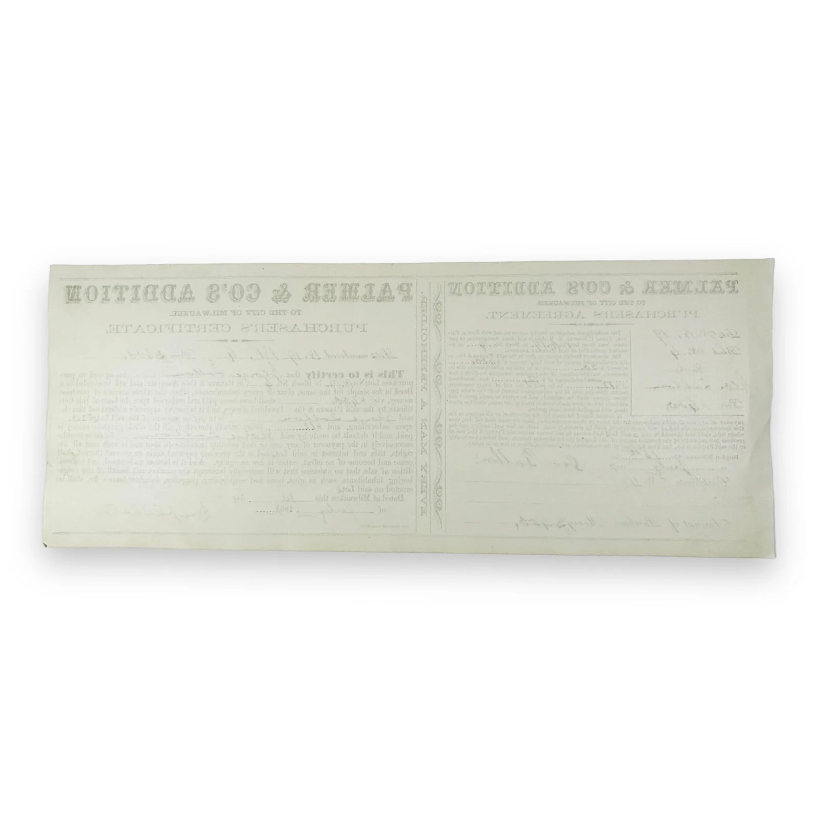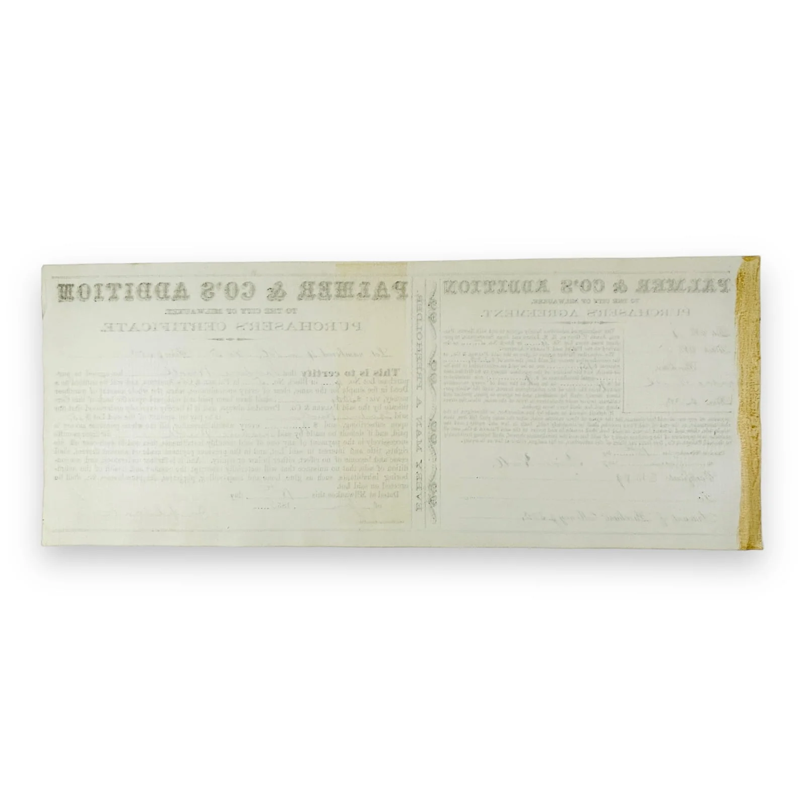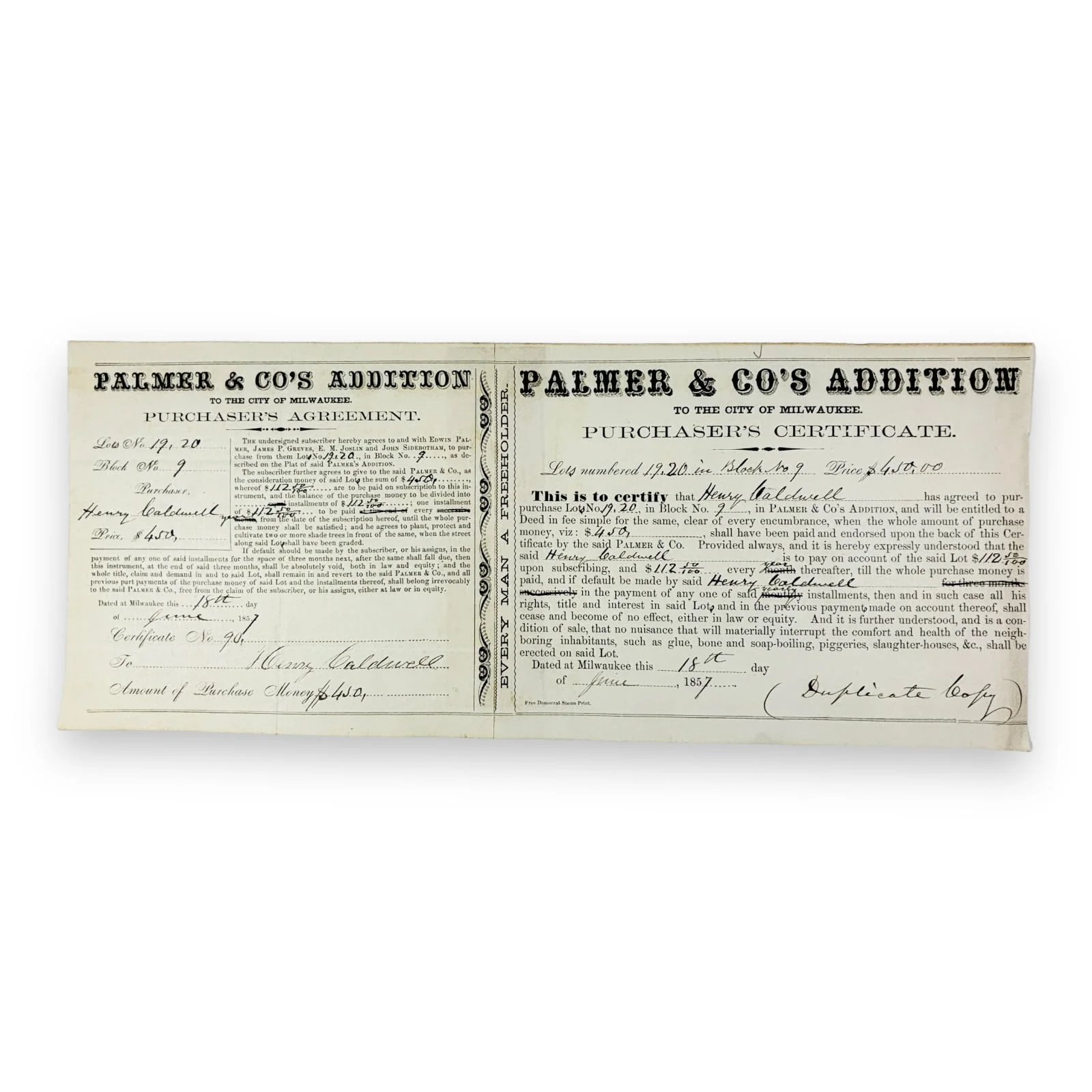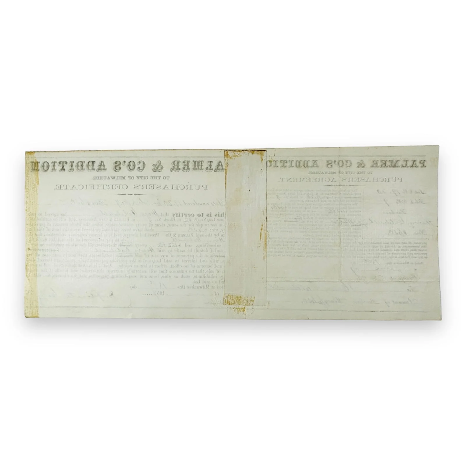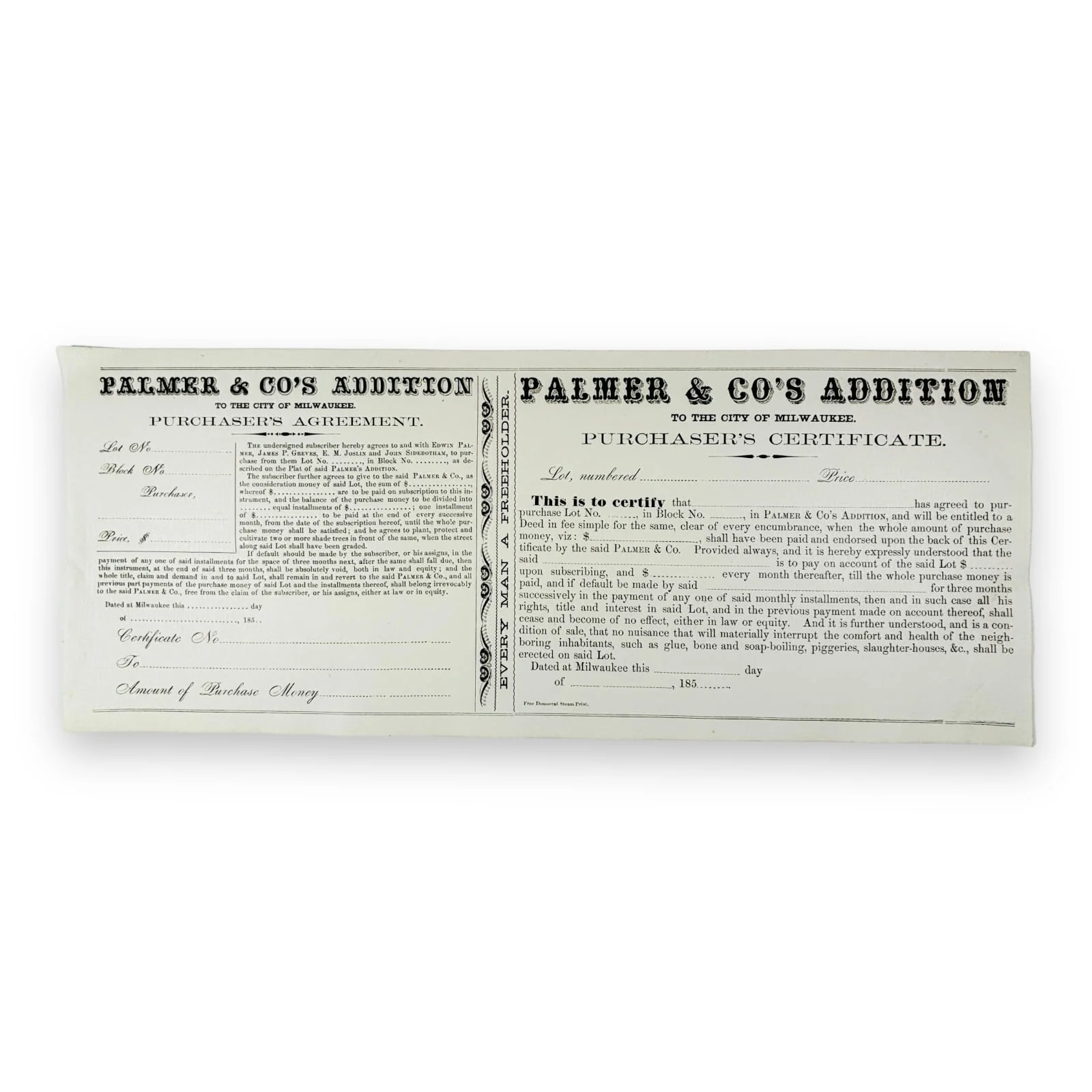 This lot is a group of five 1857 land purchase receipts for property in the Palmer and Company Addition of Milwaukee, Wisconsin. Four of the documents are completed with a purchaser’s information and the fifth one is a blank copy. Each document is approximately 5.5″ tall by 13.75″ wide.