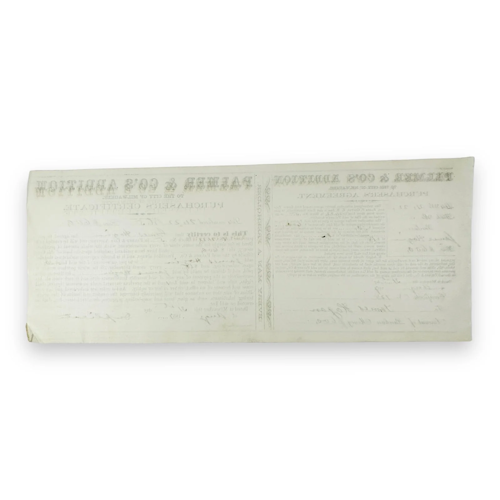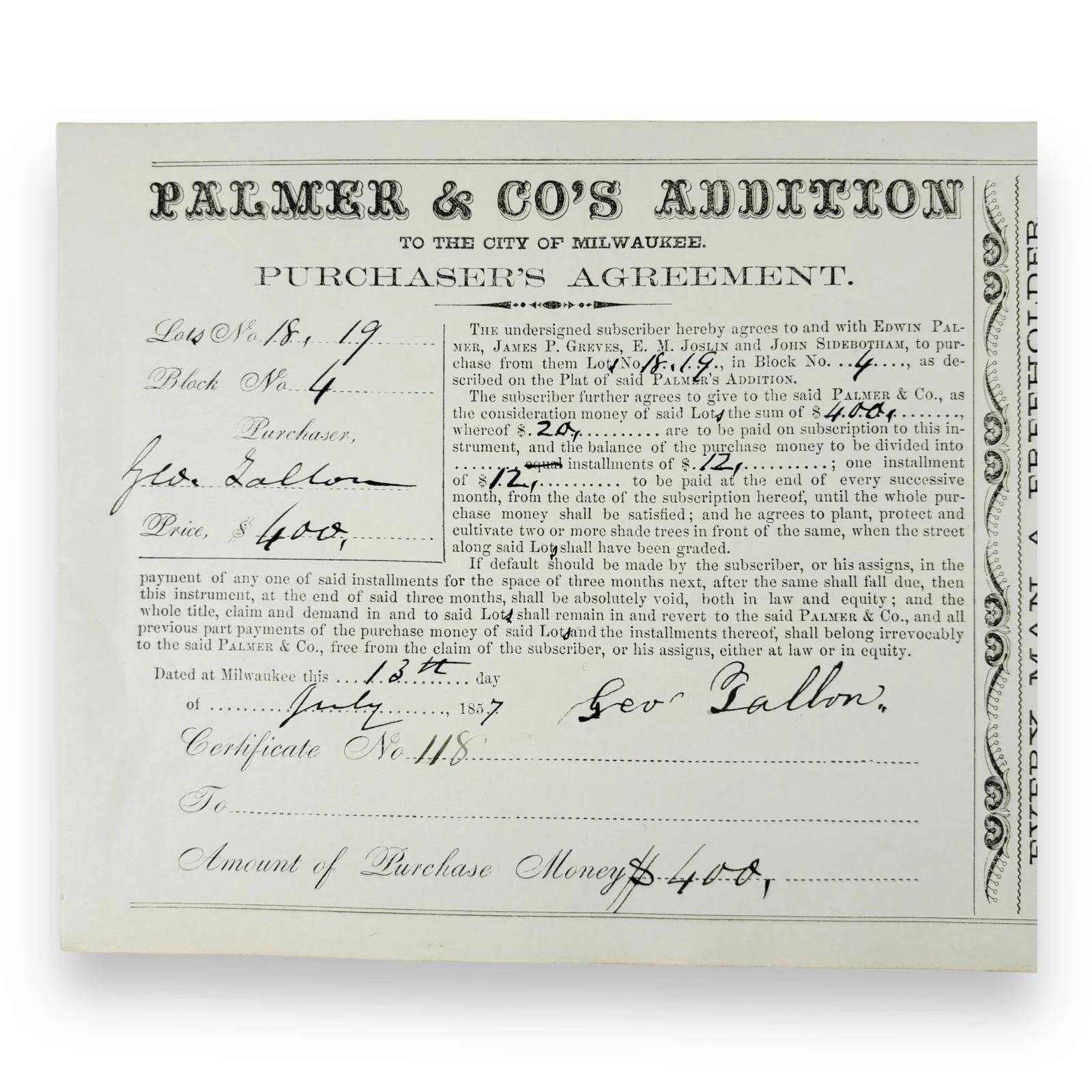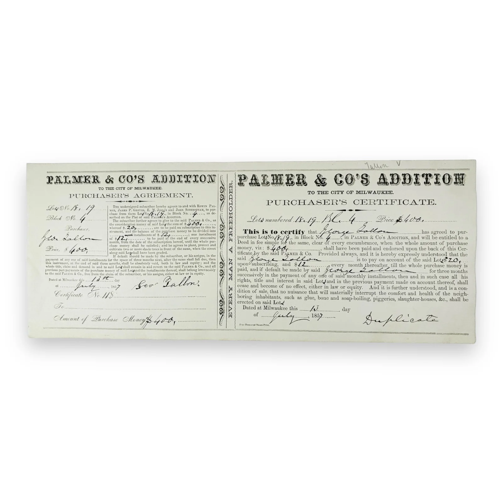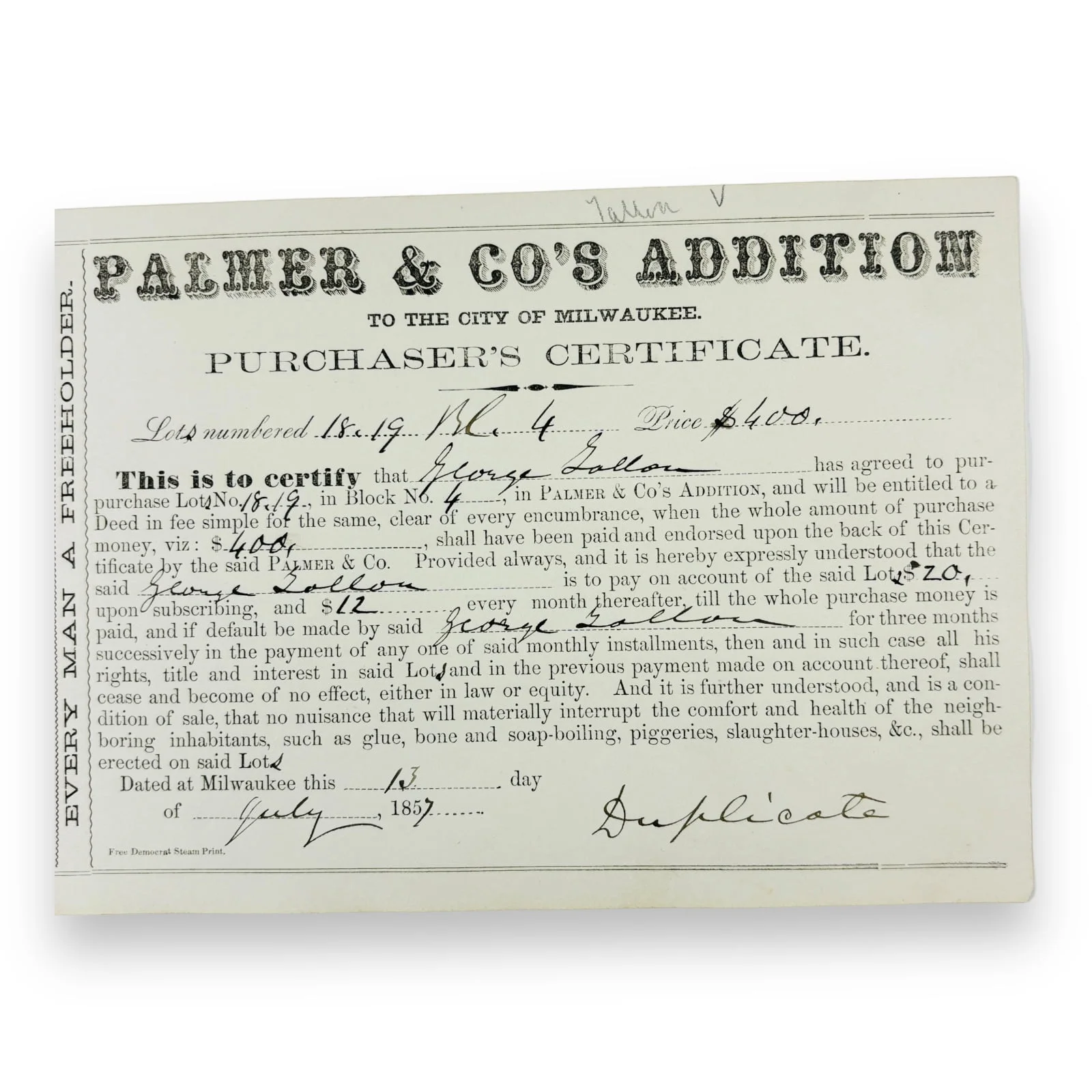 This lot is a group of five 1857 land purchase receipts for property in the Palmer and Company Addition of Milwaukee, Wisconsin. Four of the documents are completed with a purchaser’s information and the fifth one is a blank copy. Each document is approximately 5.5″ tall by 13.75″ wide.