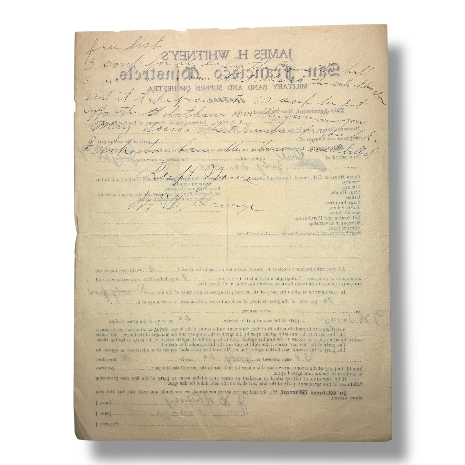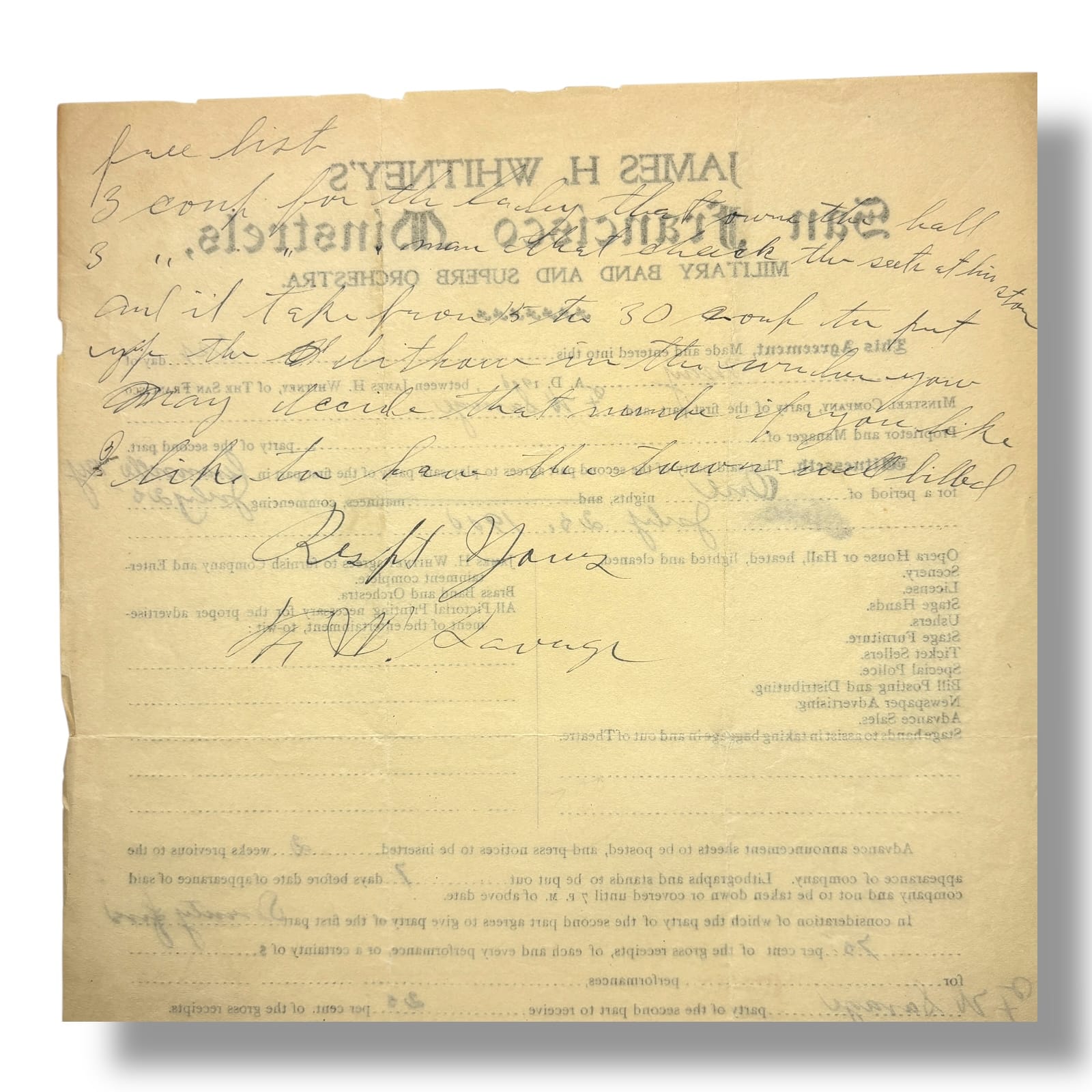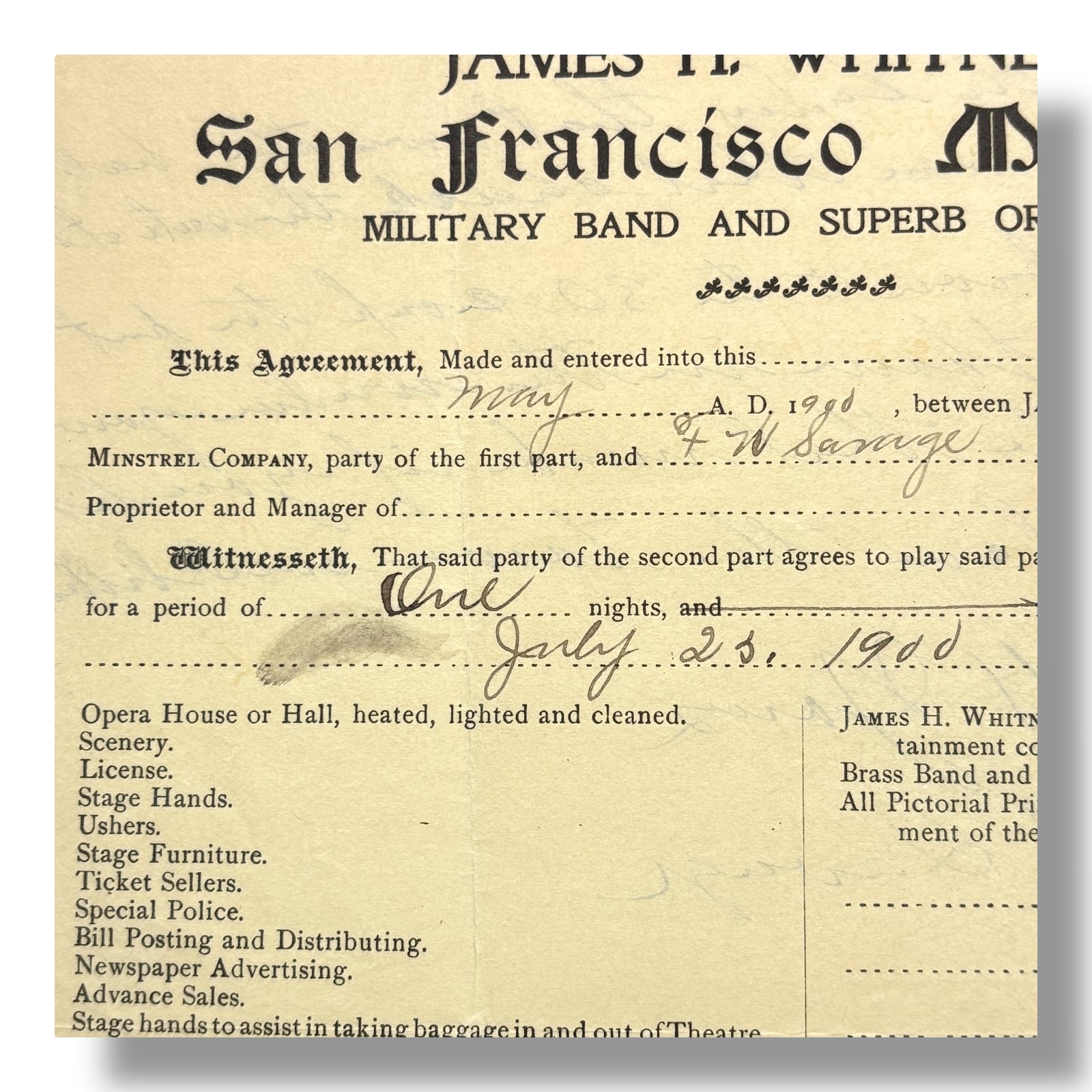 Original 1905 contract between James H. Whitney of the San Francisco Minstrels and F. W. Savage of Greeneville, New York. This one-page printed and manuscript agreement outlines the terms for a single performance on July 28, 1905, including payment, venue requirements, and promotional obligations. The document is printed on pre-typed contract stationery for James H. Whitney’s Minstrels, with handwritten insertions for dates, locations, financial amounts, and signatures. Notably, the contract includes provisions for a brass band, orchestra, and advertising expectations. Signed by both James H. Whitney and F. W. Savage at the bottom. The reverse contains additional handwritten notes referencing ticket comps and logistical matters.