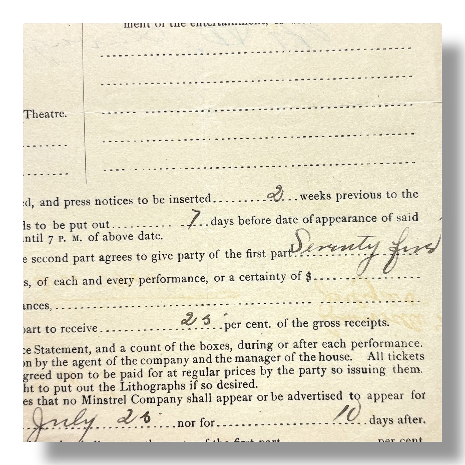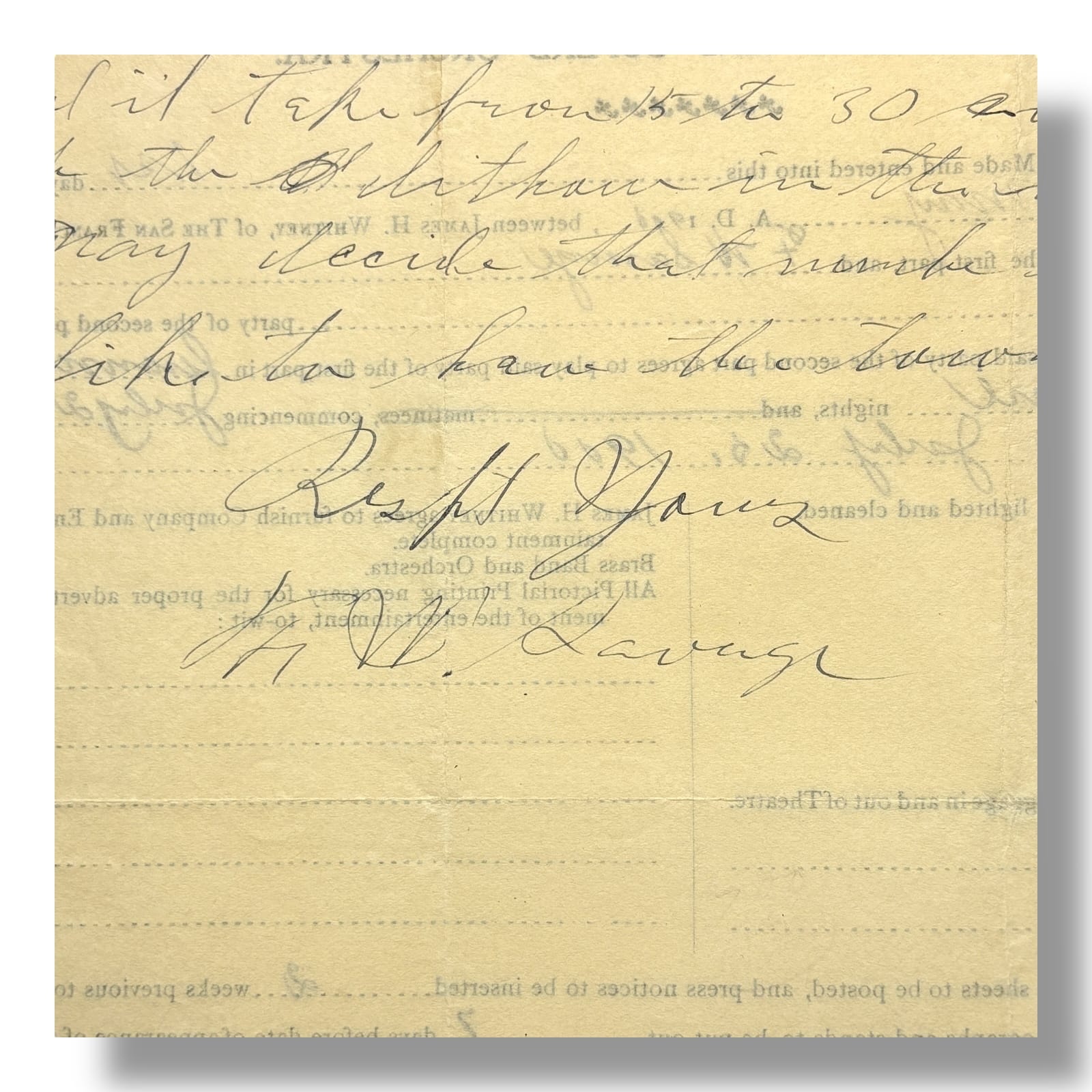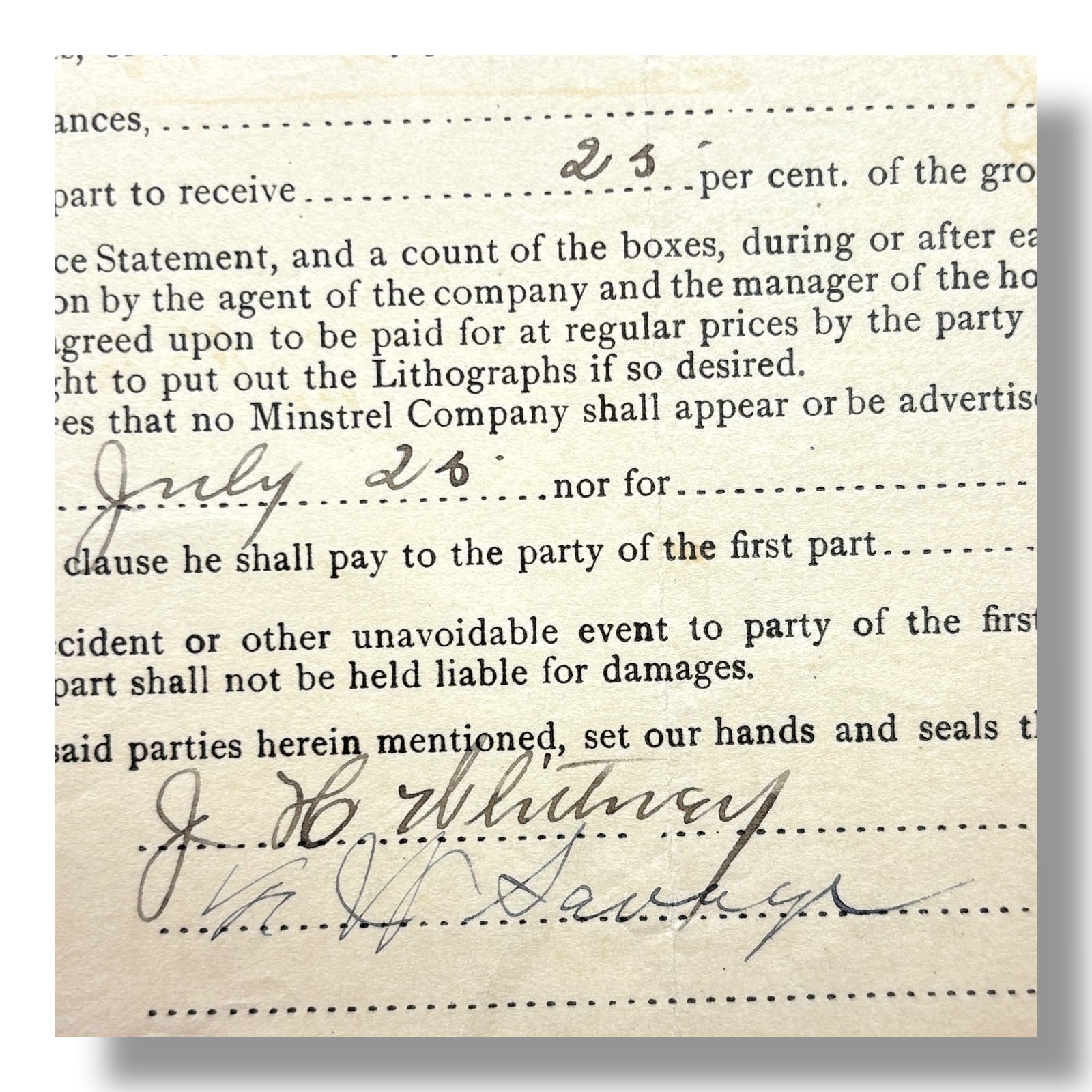 Original 1905 contract between James H. Whitney of the San Francisco Minstrels and F. W. Savage of Greeneville, New York. This one-page printed and manuscript agreement outlines the terms for a single performance on July 28, 1905, including payment, venue requirements, and promotional obligations. The document is printed on pre-typed contract stationery for James H. Whitney’s Minstrels, with handwritten insertions for dates, locations, financial amounts, and signatures. Notably, the contract includes provisions for a brass band, orchestra, and advertising expectations. Signed by both James H. Whitney and F. W. Savage at the bottom. The reverse contains additional handwritten notes referencing ticket comps and logistical matters.