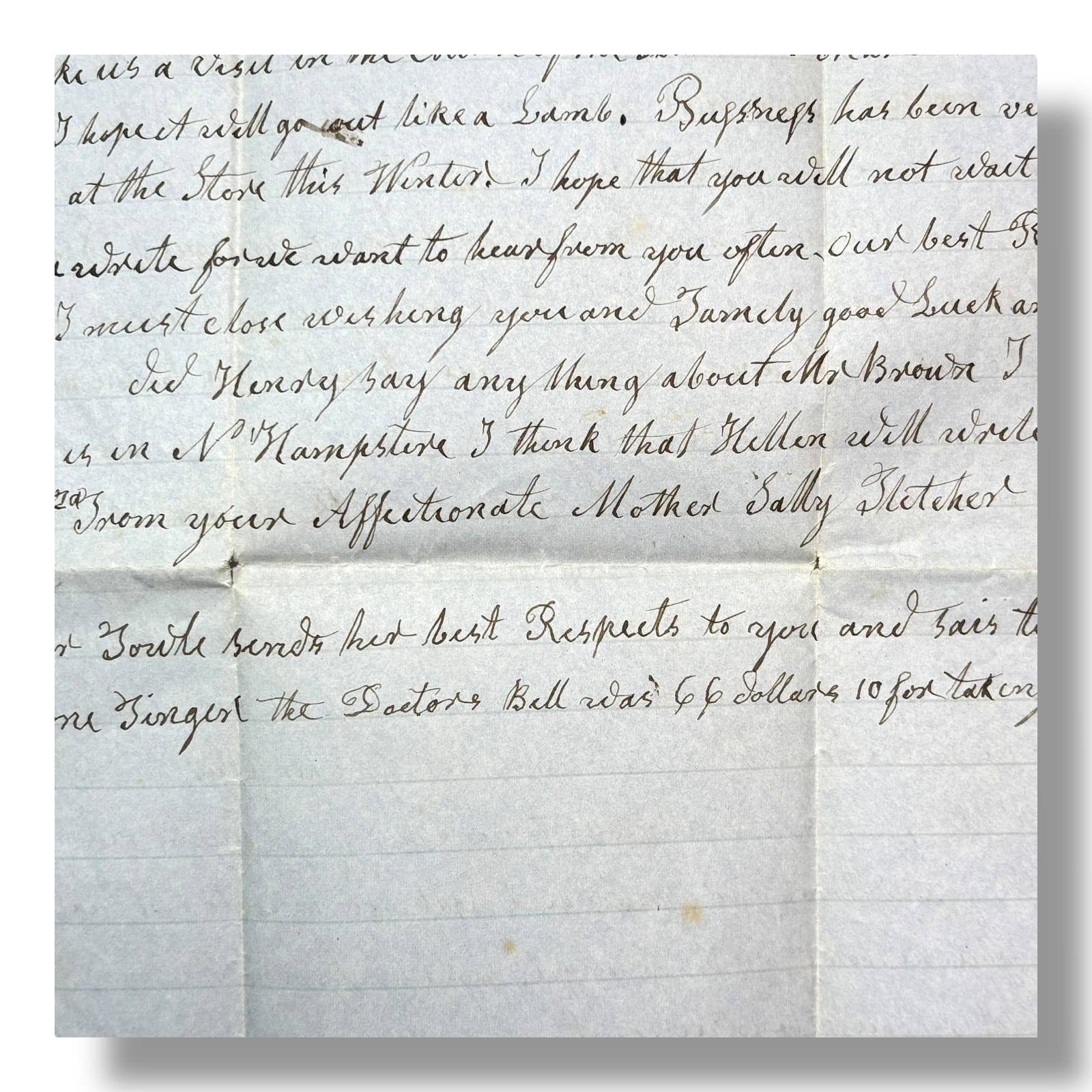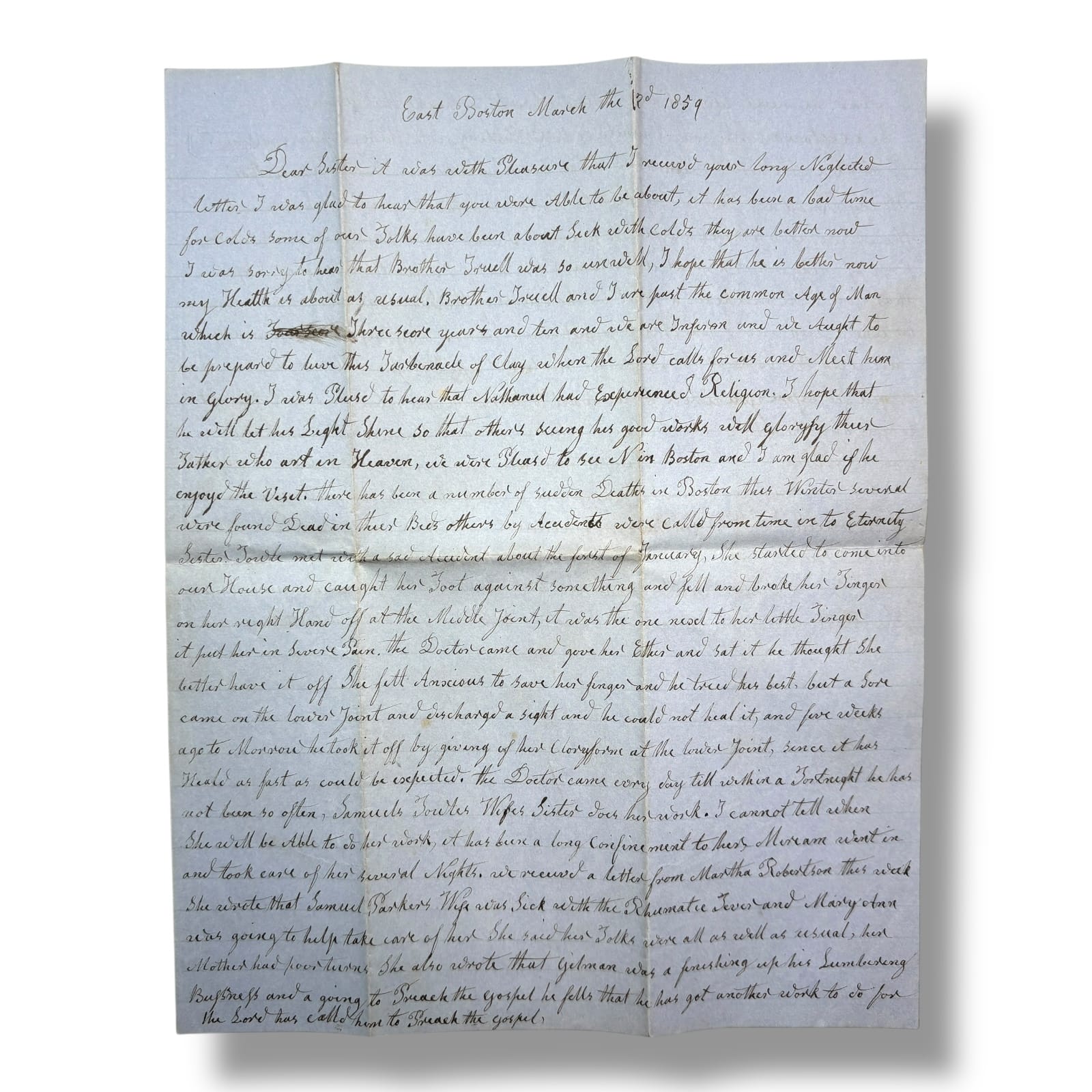 This authentic 1859 handwritten letter from Sally Fletcher in East Boston offers a vivid glimpse into family life, sudden tragedy, and religious reflections in pre-Civil War America. Key highlights include: