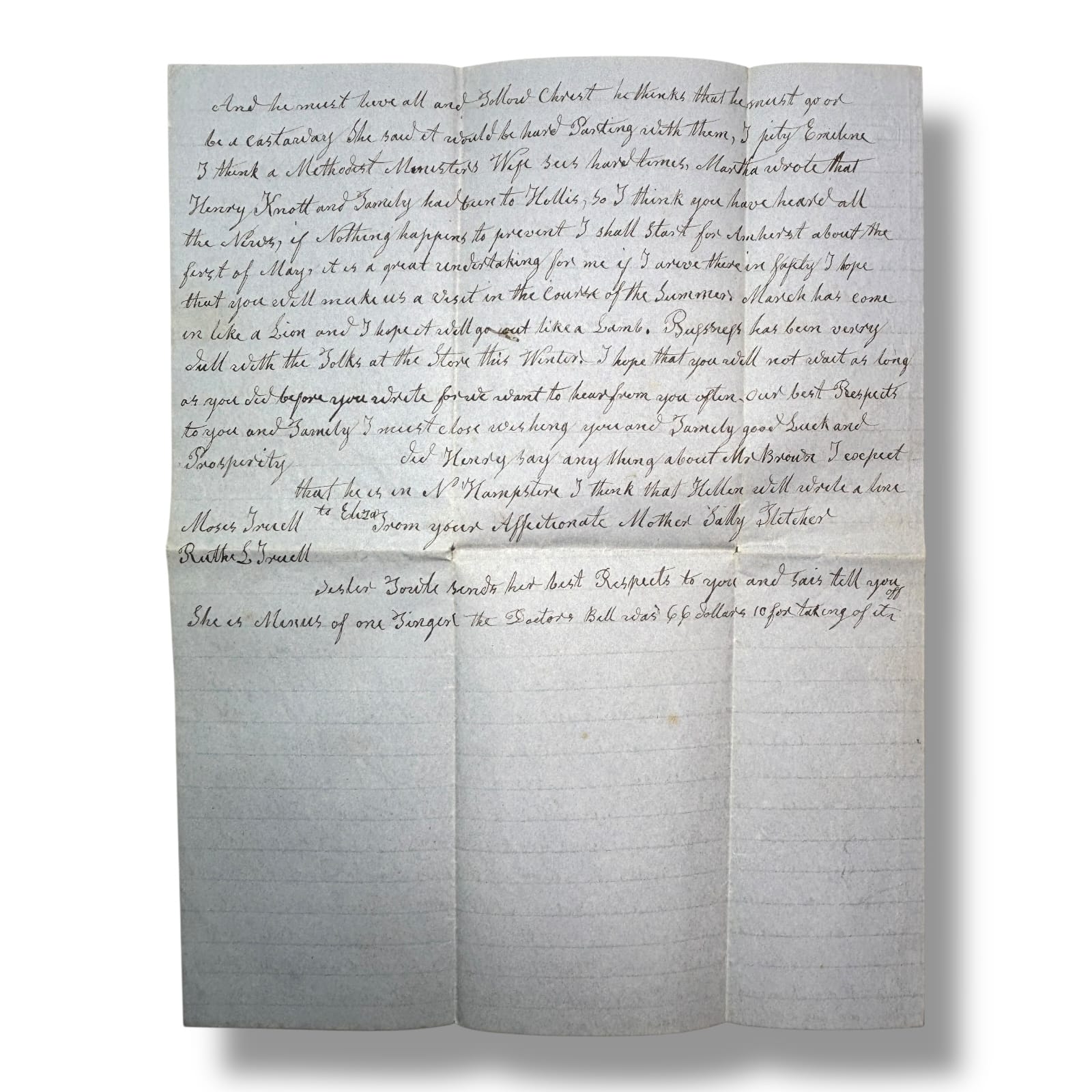 This letter captures the blend of hardship, faith, and resilience typical of the era. Written in neat cursive and preserved in its original folded form, it’s a valuable piece for collectors of ephemera, genealogy enthusiasts, or history buffs interested in Boston’s past.