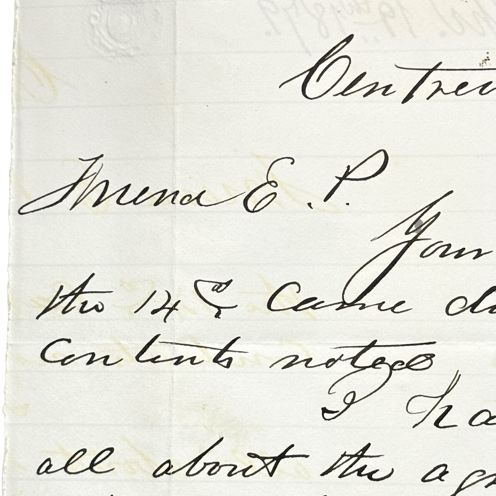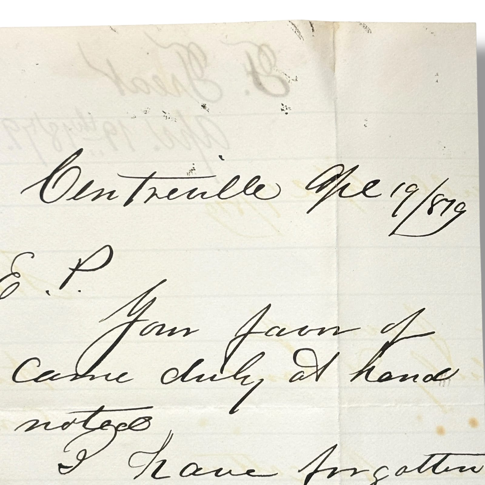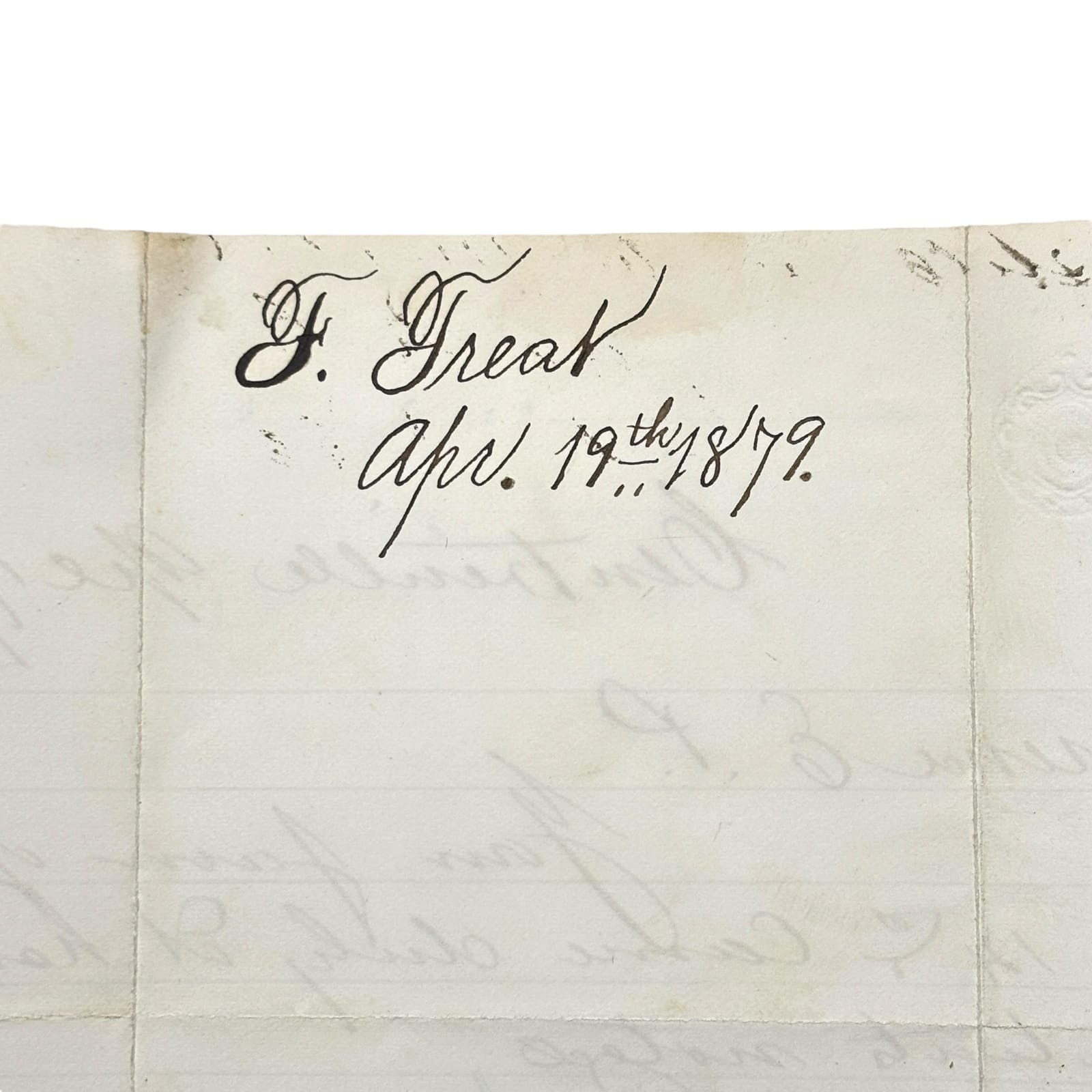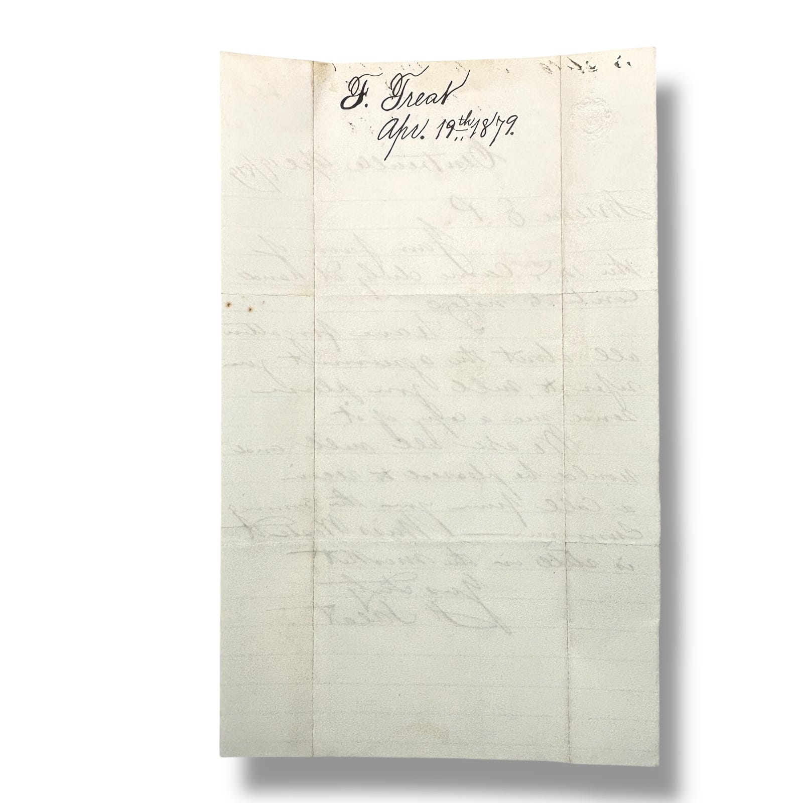Original handwritten letter dated April 19, 1879 from F. Treat to E.P. Treat in Frankfort, Maine. The letter is written from Centreville, Maine — a township that existed in Washington County at the time but was later disincorporated. Edwin P. Treat was a prominent figure in Frankfort, Maine, involved in shipping, general store management, and other businesses. Penobscot Marine Museum says his business, E.P. Treat & Co., had a diverse range of activities, including assembling cargoes of lumber and hay, manufacturing barrel staves, and managing rental properties. Mystic Seaport Museum says he was also involved in the transportation of goods, with records indicating his involvement in shipping to Boston, Prince Edward Island, and the West Indies.