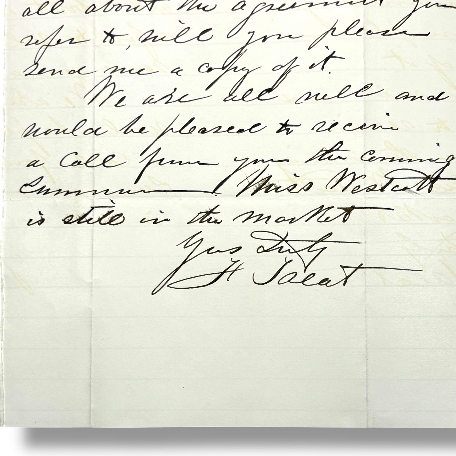 The letter briefly discusses an earlier agreement the sender cannot recall and requests a copy. It includes personal updates and mentions a “Miss Westcott” still being “in the market,” likely a social or matchmaking reference.