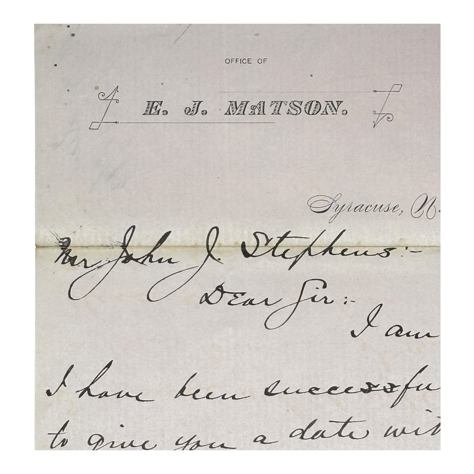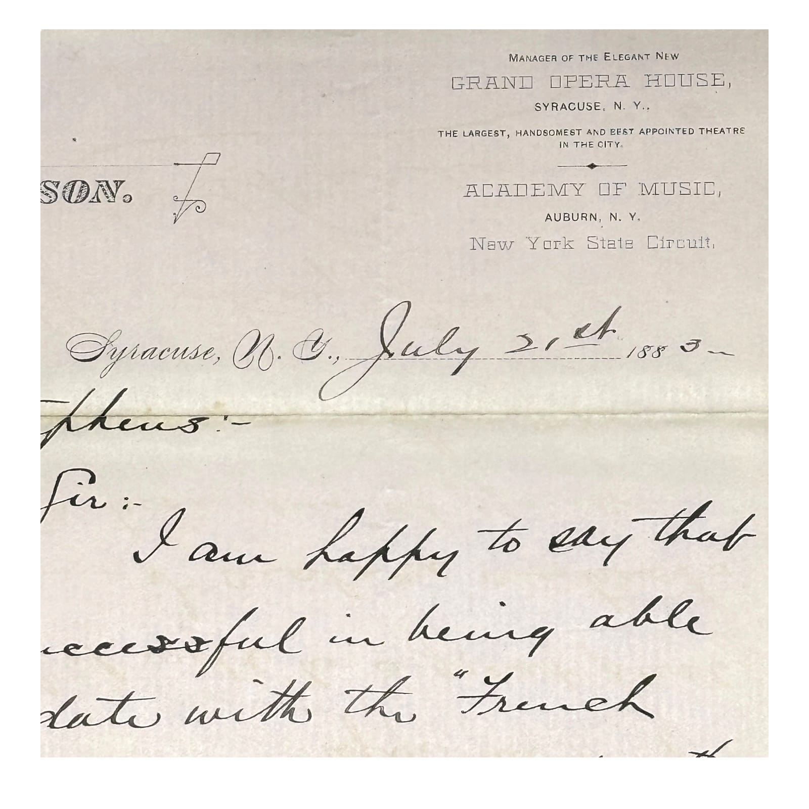 This original 1883 letter on E. J. Matson’s Grand Opera House letterhead was written by W. G. Rice to John J. Stephens, proprietor of the Stephens Opera House in Fulton, New York. Dated July 21, 1883, it confirms a scheduled performance by the French Comedy Company for Tuesday, October 9, a few days after their Syracuse engagement. The letter illustrates how theatrical managers coordinated bookings along the New York State Circuit that linked major opera houses in Syracuse, Auburn, and Fulton.