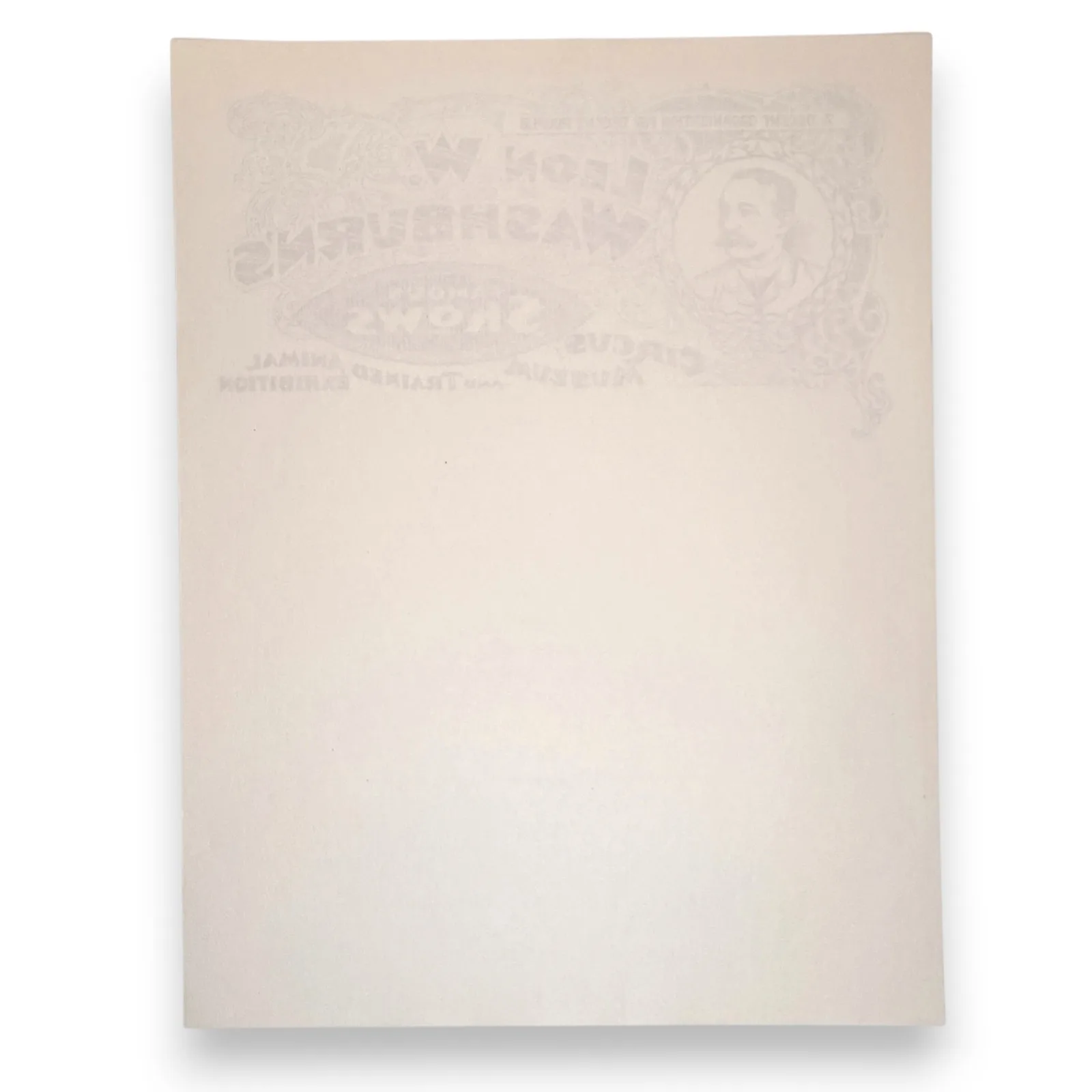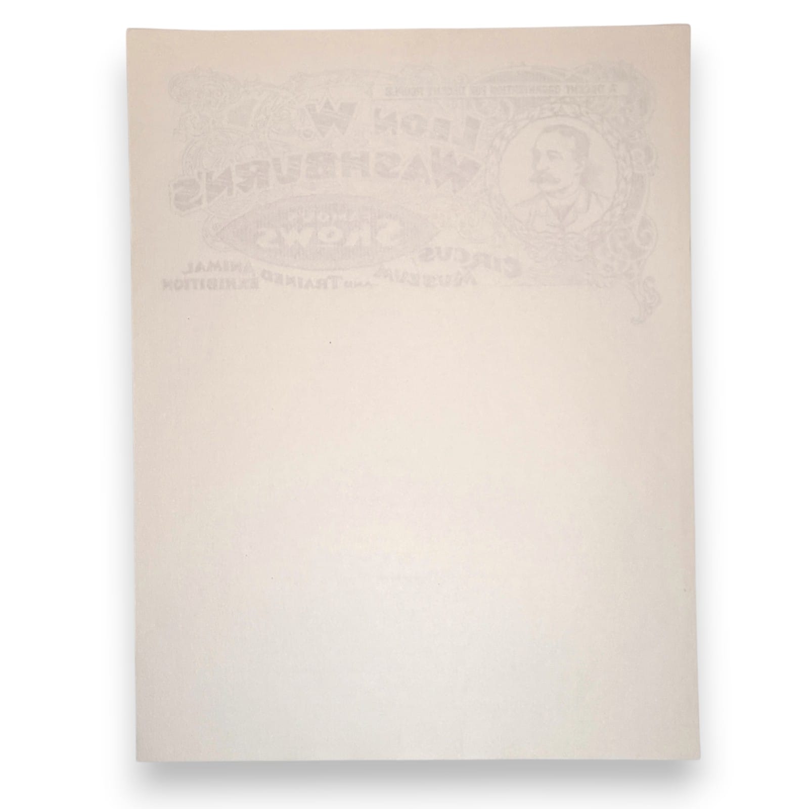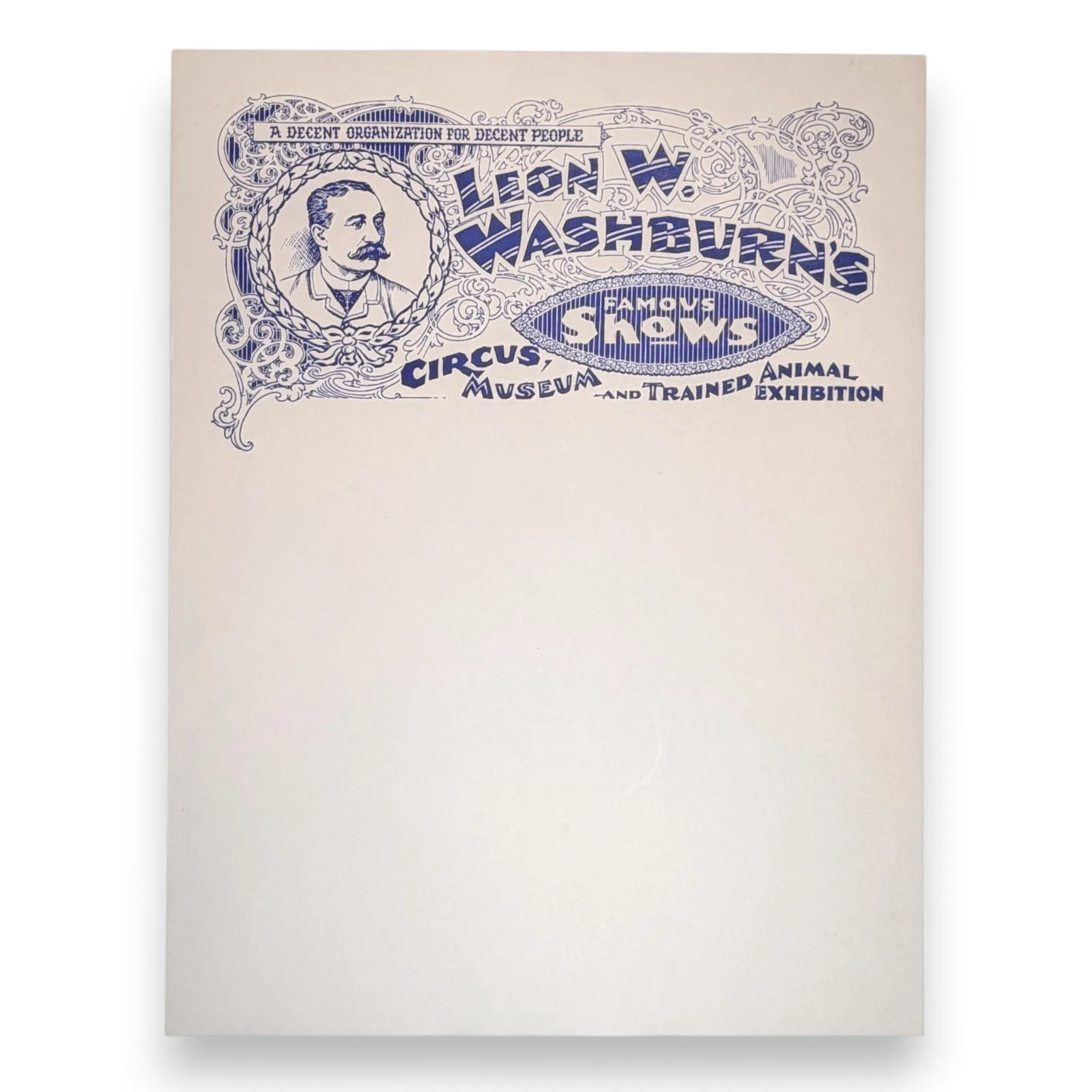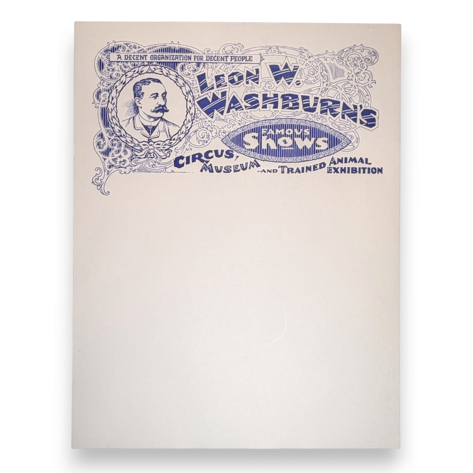 Original circa 1892 blank letterhead for Leon W. Washburn’s Famous Shows, promoting a circus, museum, and trained animal exhibition. The sheet features an ornate blue Victorian-era masthead with portrait medallion and strong advertising typography associated with late 19th-century traveling show ephemera.
