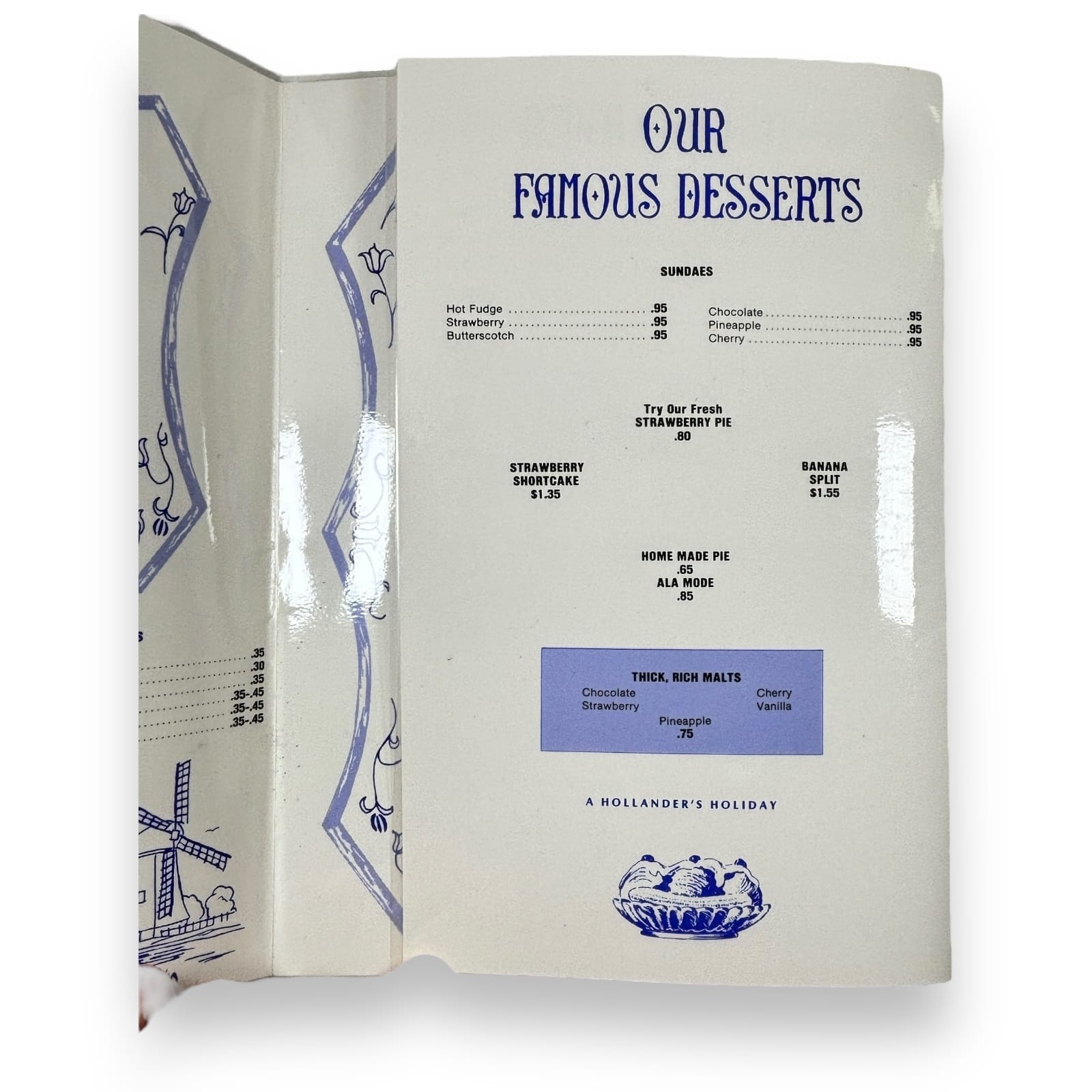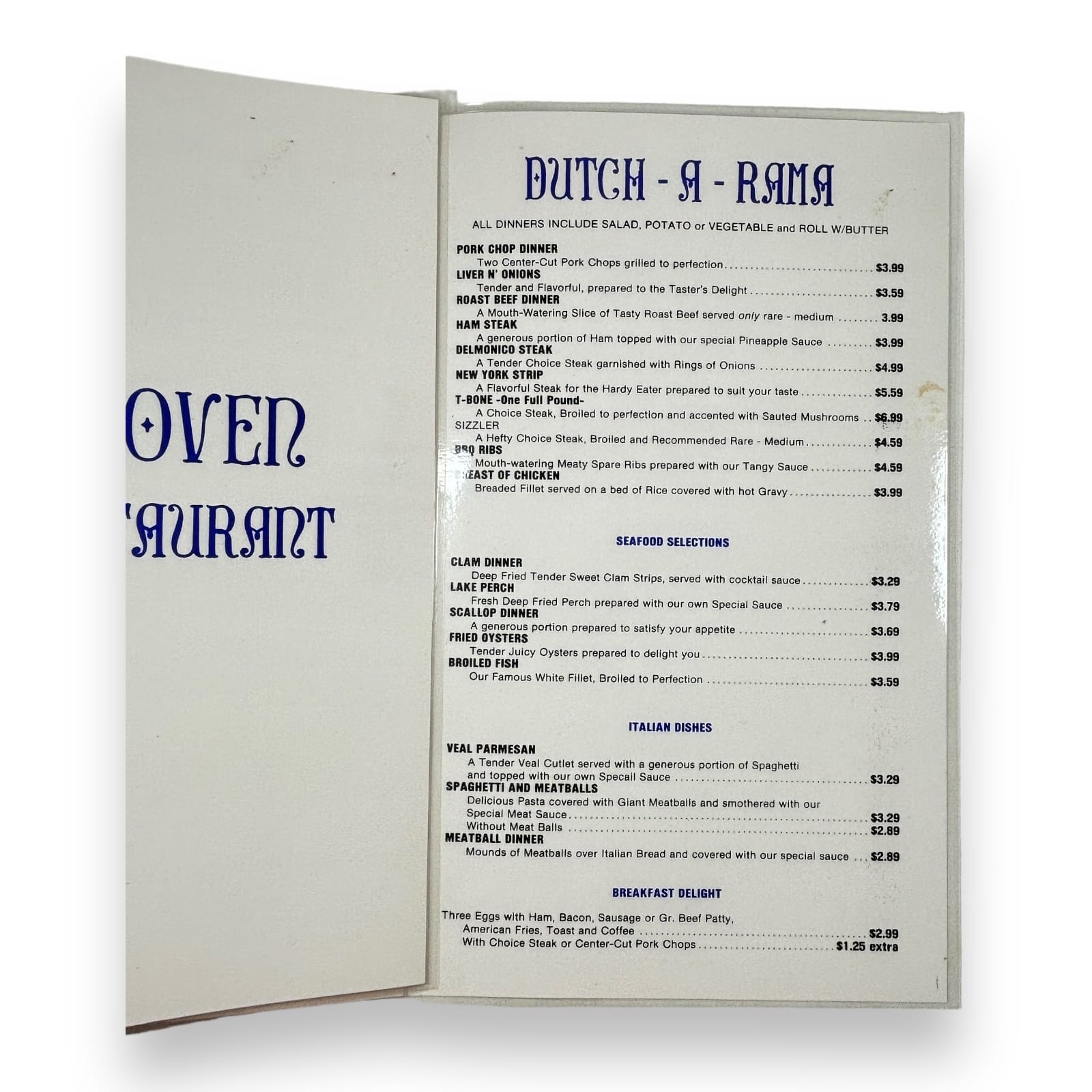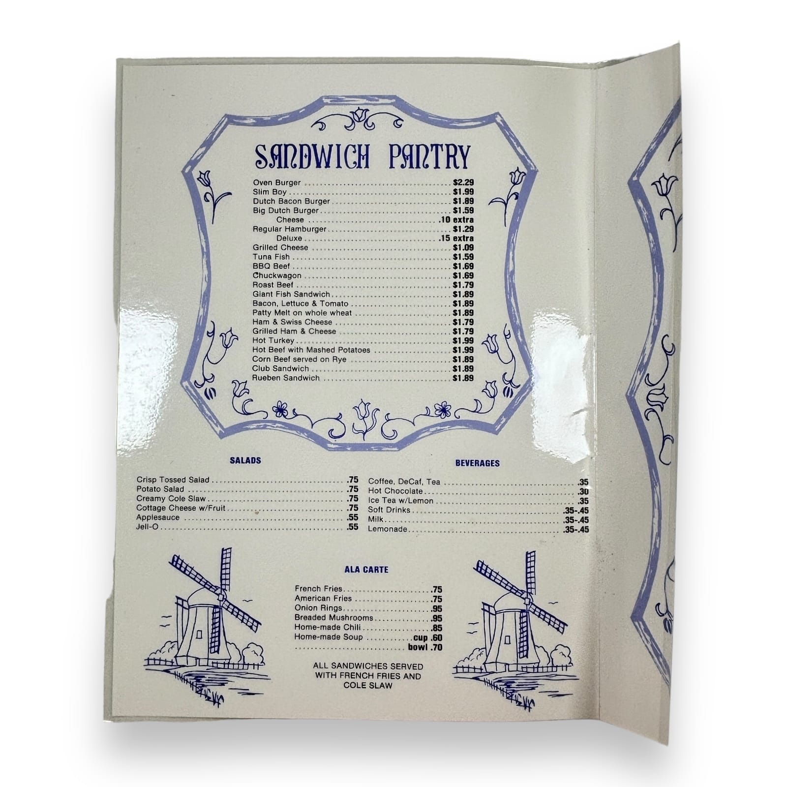 This lot is a printed restaurant menu from the Dutch Oven Family Restaurant. The menu gives no indication of a location, but the only possible connection found is the Dutch Oven Family Restaurant in Jamestown, Pennsylvania. This six-panel menu is a laminated tri-fold of a large 11.5″ tall by 23.5″ wide sheet. It is extremely scarce, especially since the restaurant is no longer in business.