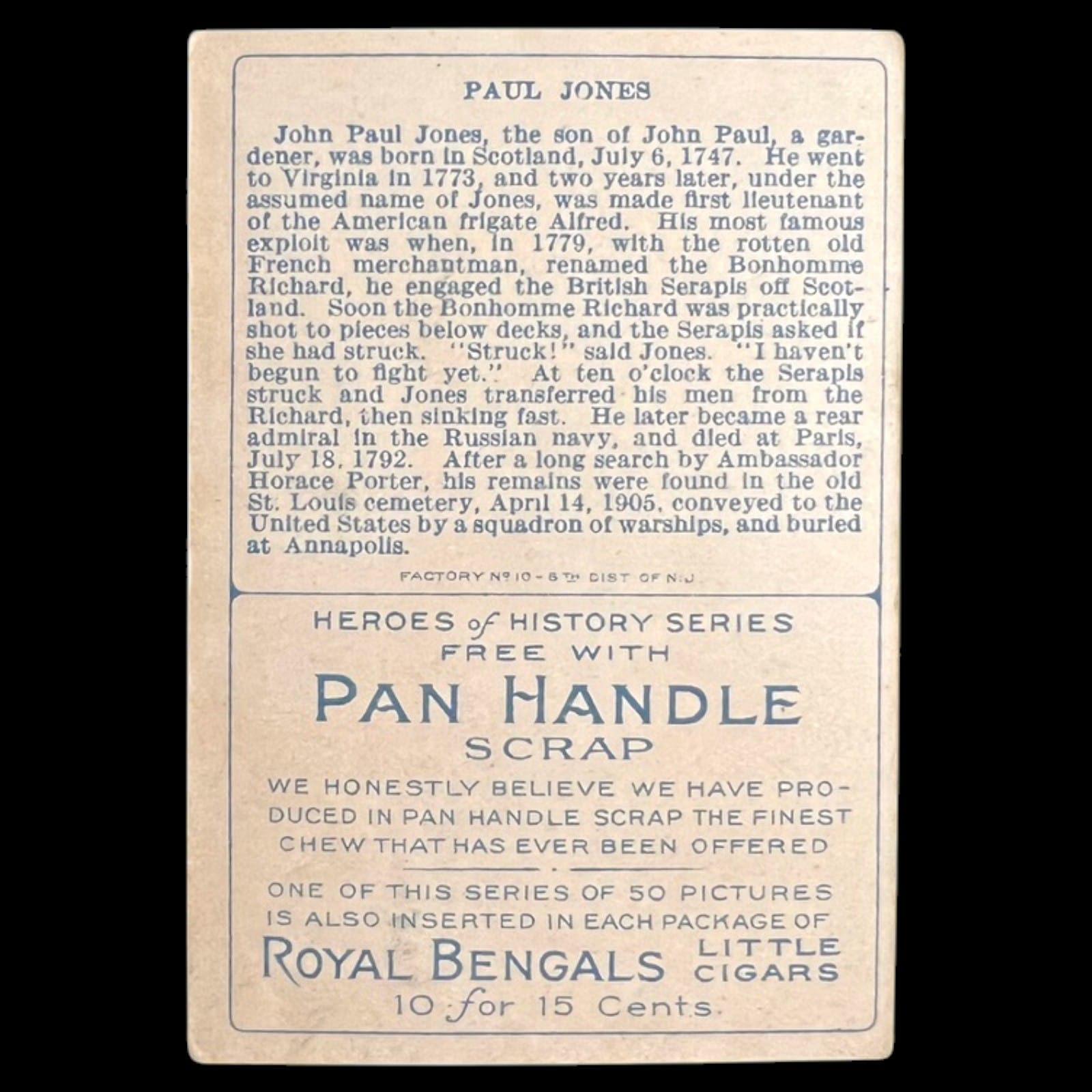 Original circa 1911 Pan Handle Scrap Heroes of History Series tobacco card featuring John Paul Jones, identified on the front as “The Naval Hero”. This early American Tobacco Company non-sport issue combines portraiture, biography, and tobacco advertising, making it a solid crossover piece for collectors of vintage tobacco cards, communications history, and historical figure memorabilia.