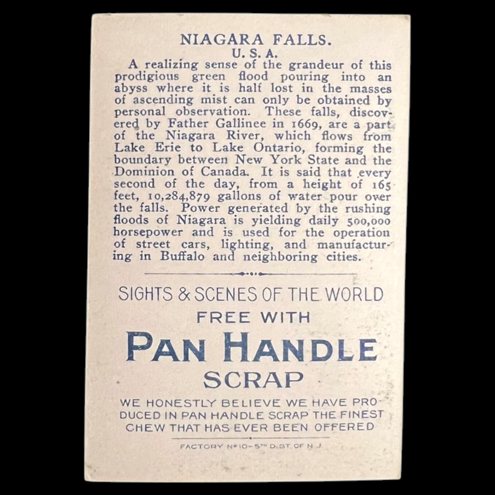 Original circa 1911 Pan Handle Scrap Sights and Scenes of the World Series tobacco card featuring the Niagara Falls between the United States and Canada. This early American Tobacco Company non-sport issue combines major attractions, historical information, and tobacco advertising, making it a solid crossover piece for collectors of vintage tobacco cards and travel memorabilia.