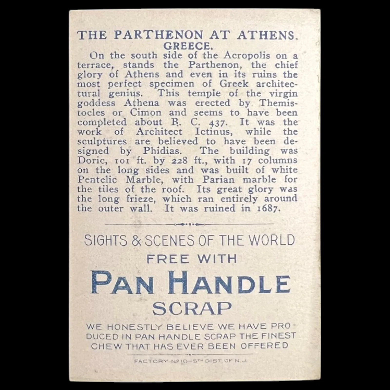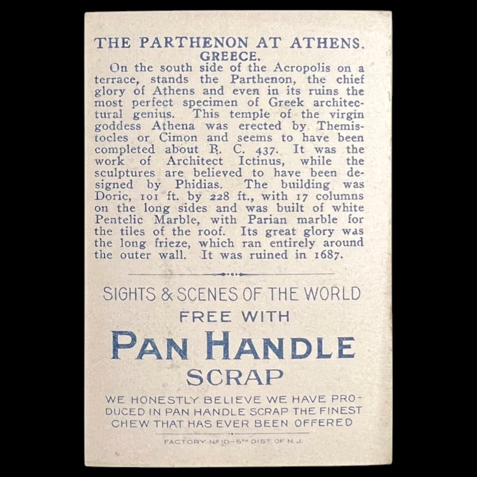 Original circa 1911 Pan Handle Scrap Sights and Scenes of the World Series tobacco card featuring the Parthenon in Athens, Greece. This early American Tobacco Company non-sport issue combines major attractions, historical information, and tobacco advertising, making it a solid crossover piece for collectors of vintage tobacco cards and travel memorabilia.