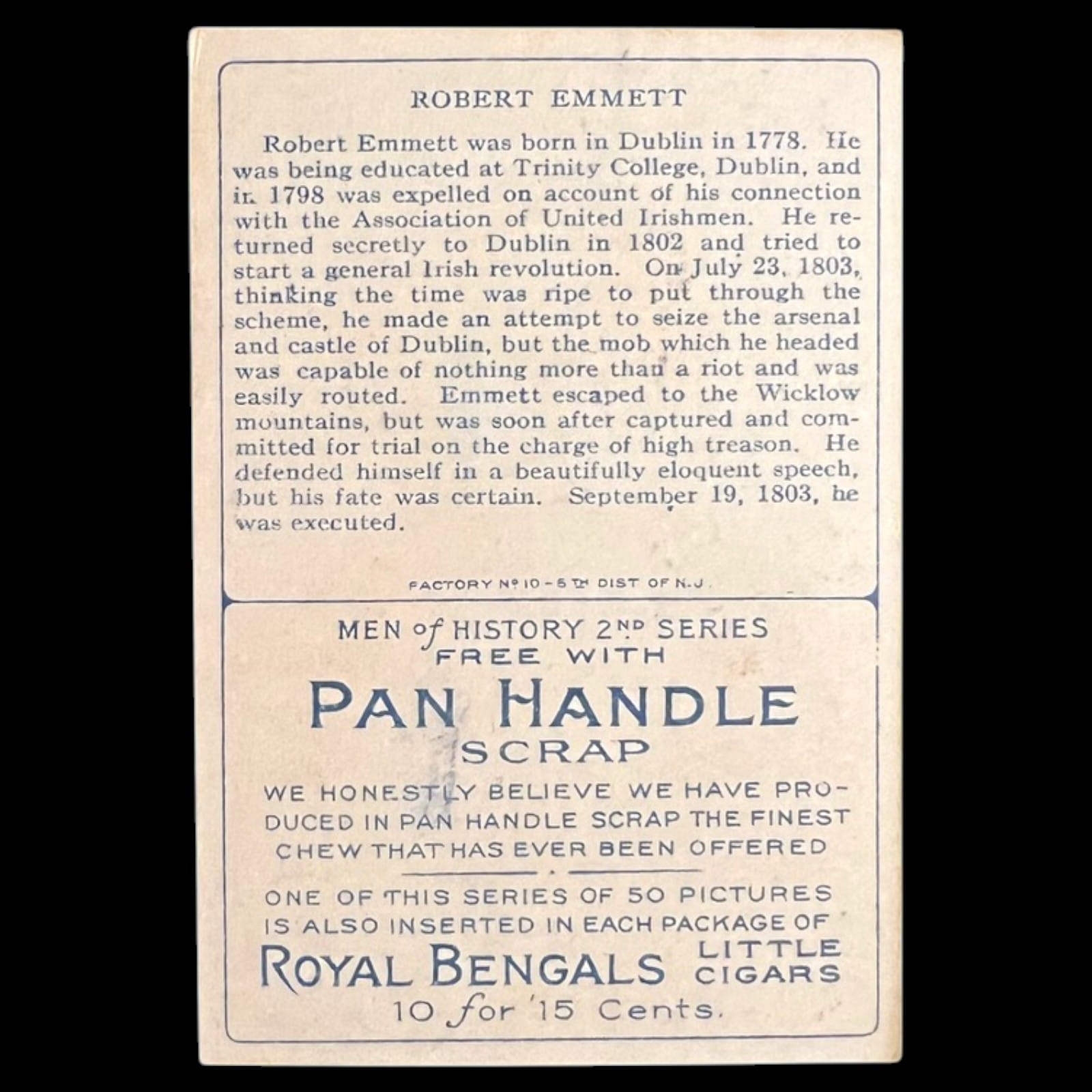 Original circa 1911 Pan Handle Scrap Men of History 2nd Series tobacco card featuring Robert Emmett, identified on the front as “The Italian Patriot”. This early American Tobacco Company issue combines period portrait illustration, historical biography, and tobacco advertising, making it a crossover collectible for tobacco card enthusiasts and historical figure collectors.
