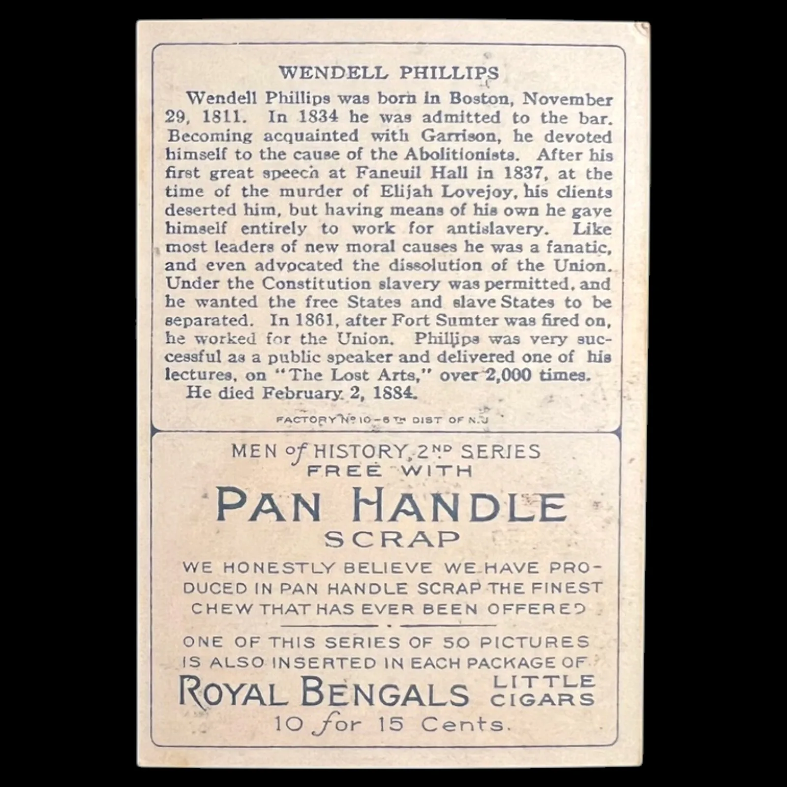Original circa 1911 Pan Handle Scrap Men of History 2nd Series tobacco card featuring Wendell Phillips, identified on the front as “The Abolitionist Orator”. This early American Tobacco Company issue combines period portrait illustration, historical biography, and tobacco advertising, making it a crossover collectible for tobacco card enthusiasts and historical figure collectors.