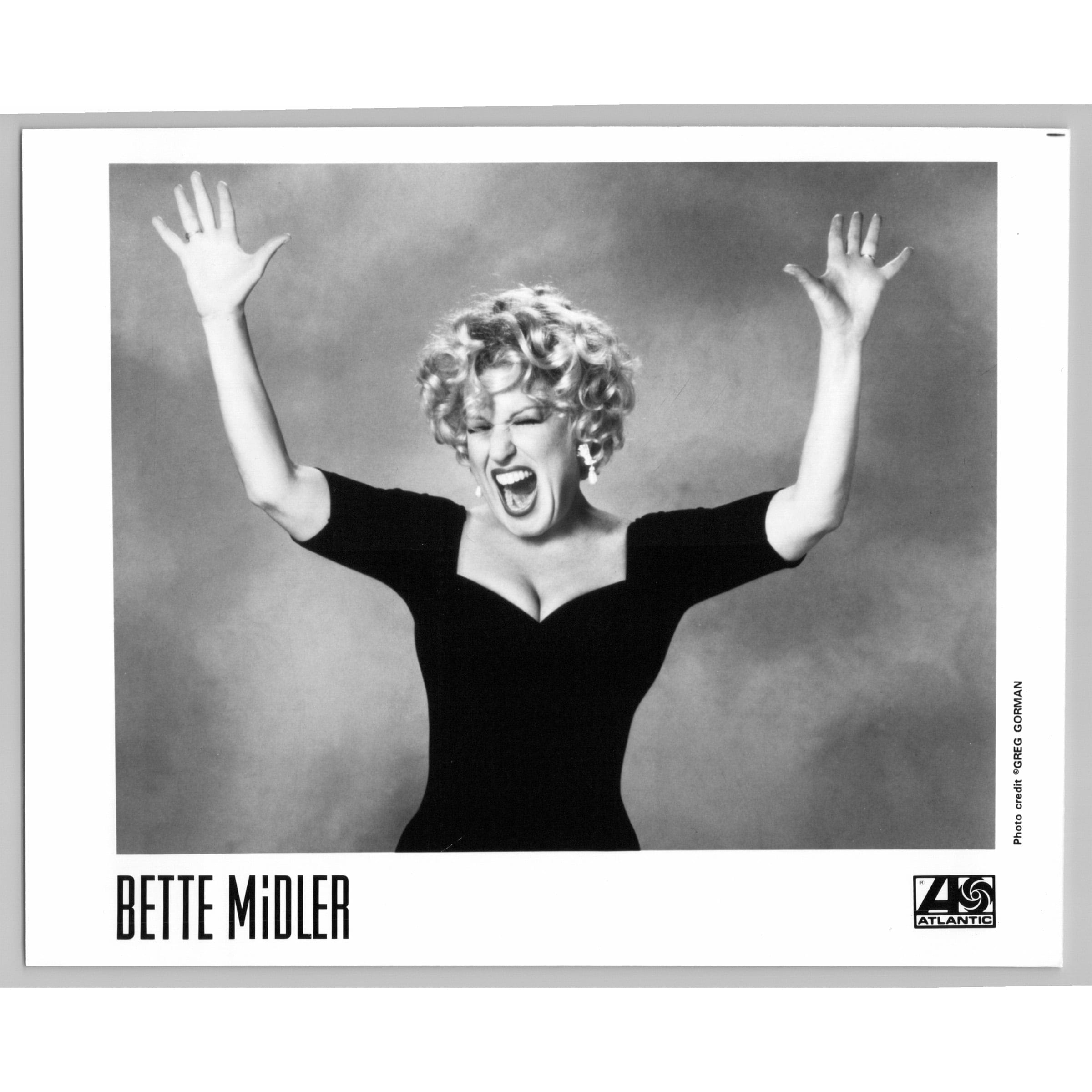This lot is a vintage glossy music press photo of the American singer, actress, comedian, and author, Bette Midler.