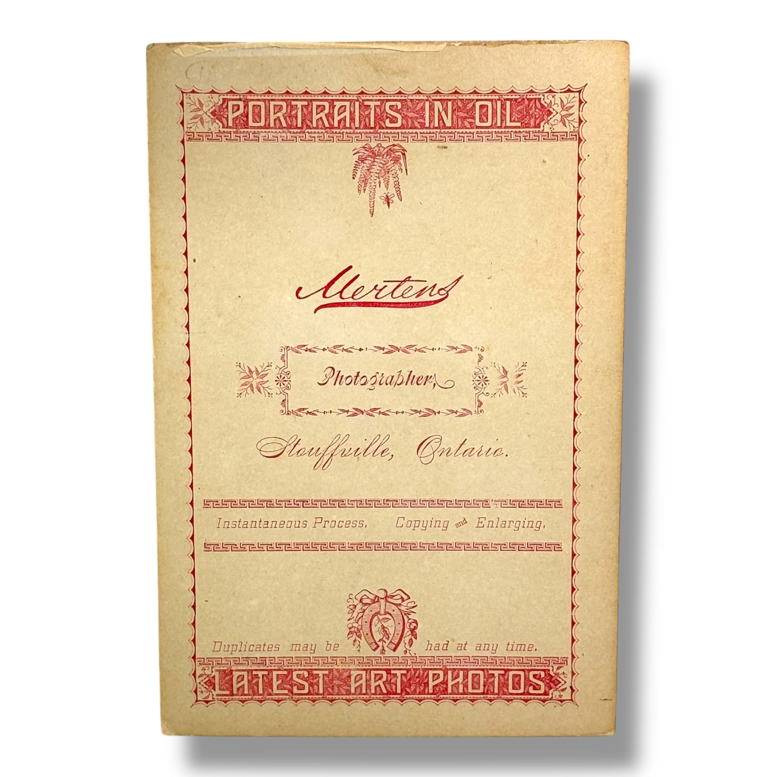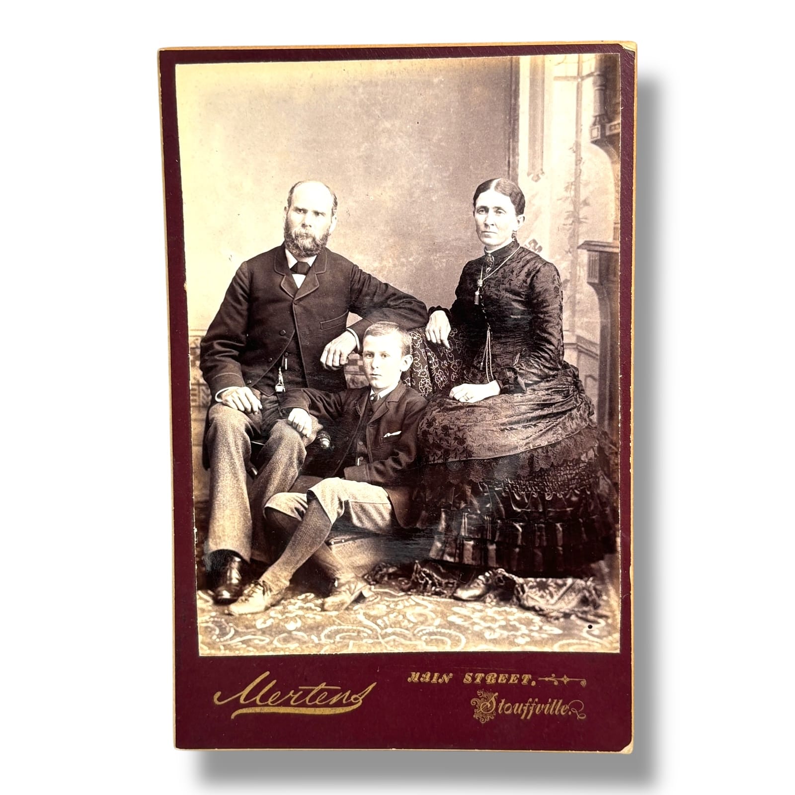 Original late 19th century cabinet card photograph showing a seated family portrait of a man, woman, and young boy. The mount is marked “Mertens, Main Street, Stouffville, Ontario” with an ornate photographer’s backmark.