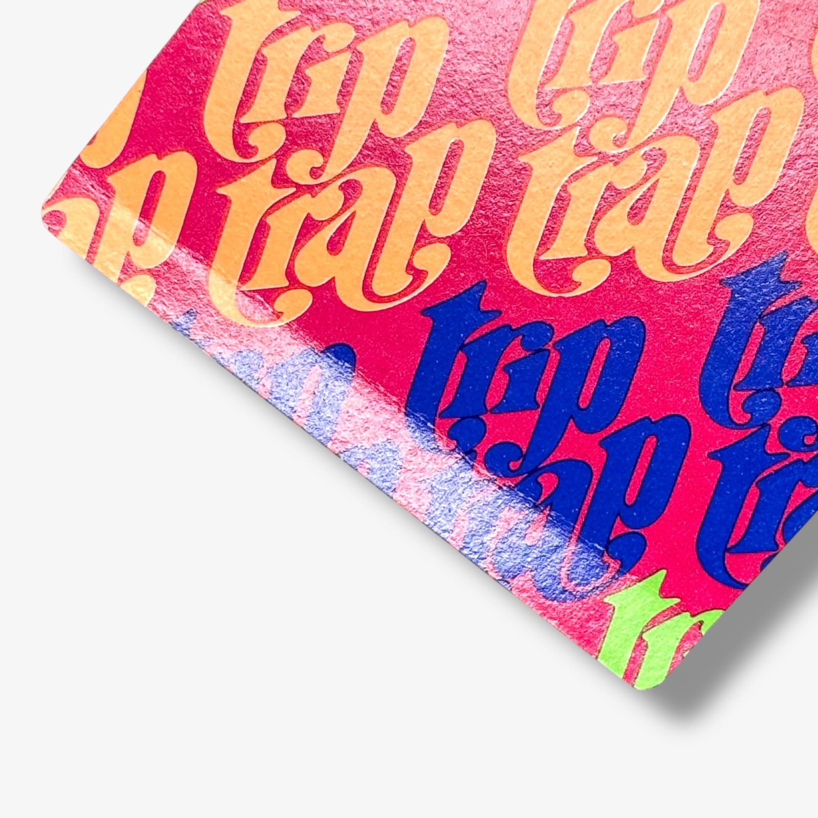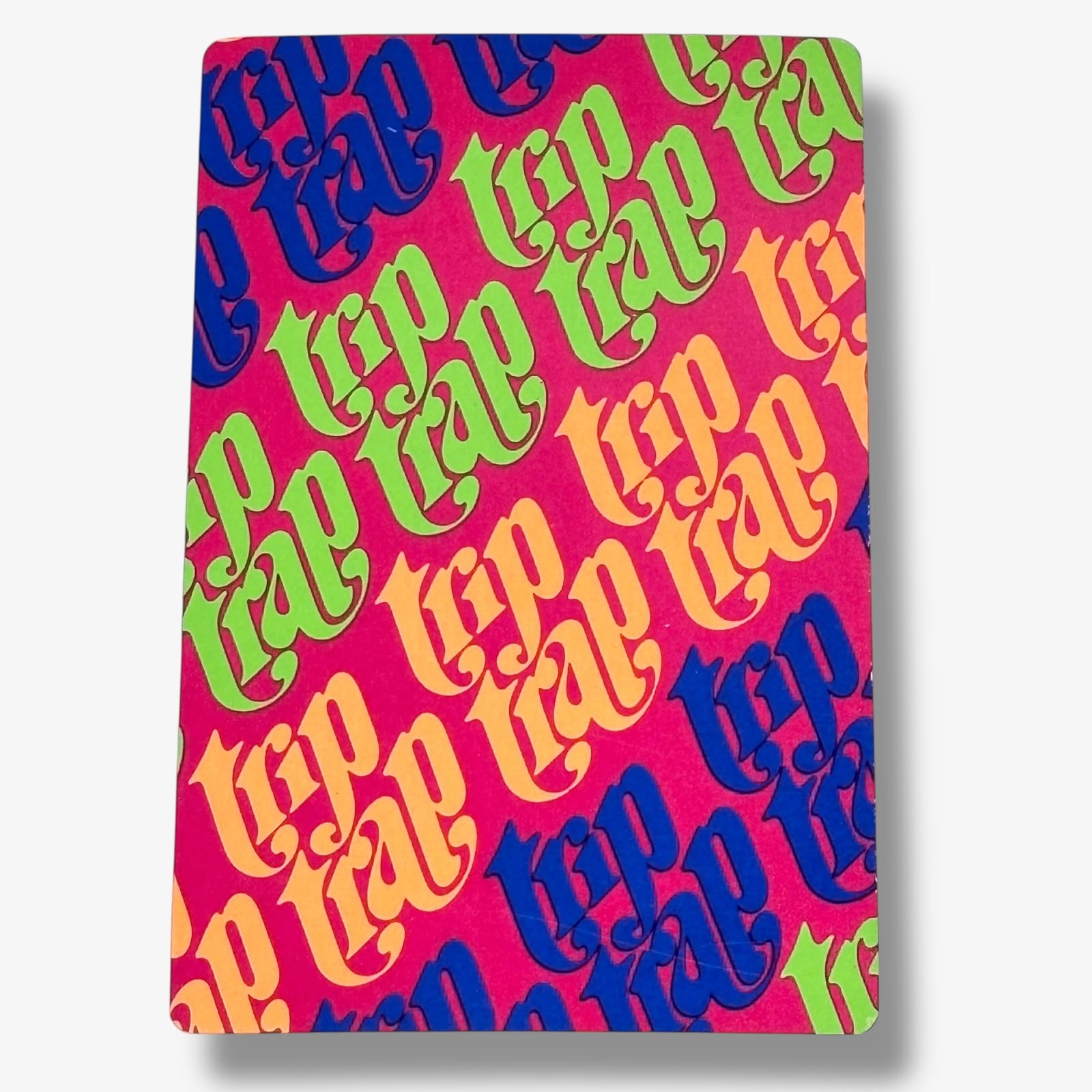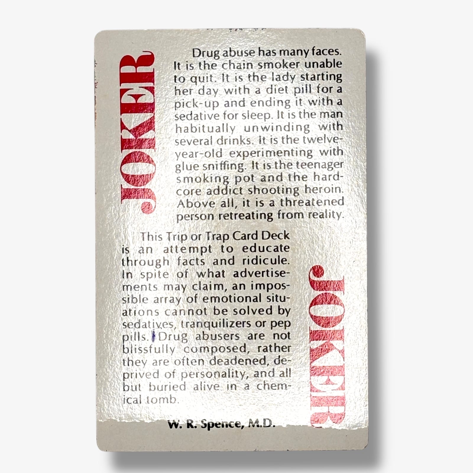 Original 1970 āTrip or Trapā educational playing card deck by W.R. Spence, M.D., published by Spenco Corp. Each card features information on prescription and illicit drugs including slang names, medical uses, and symptoms of abuse, combining psychedelic pop art style with early anti-drug messaging. The complete deck retains its gold-gilded edges and original clear plastic storage case, showing minimal wear consistent with age.