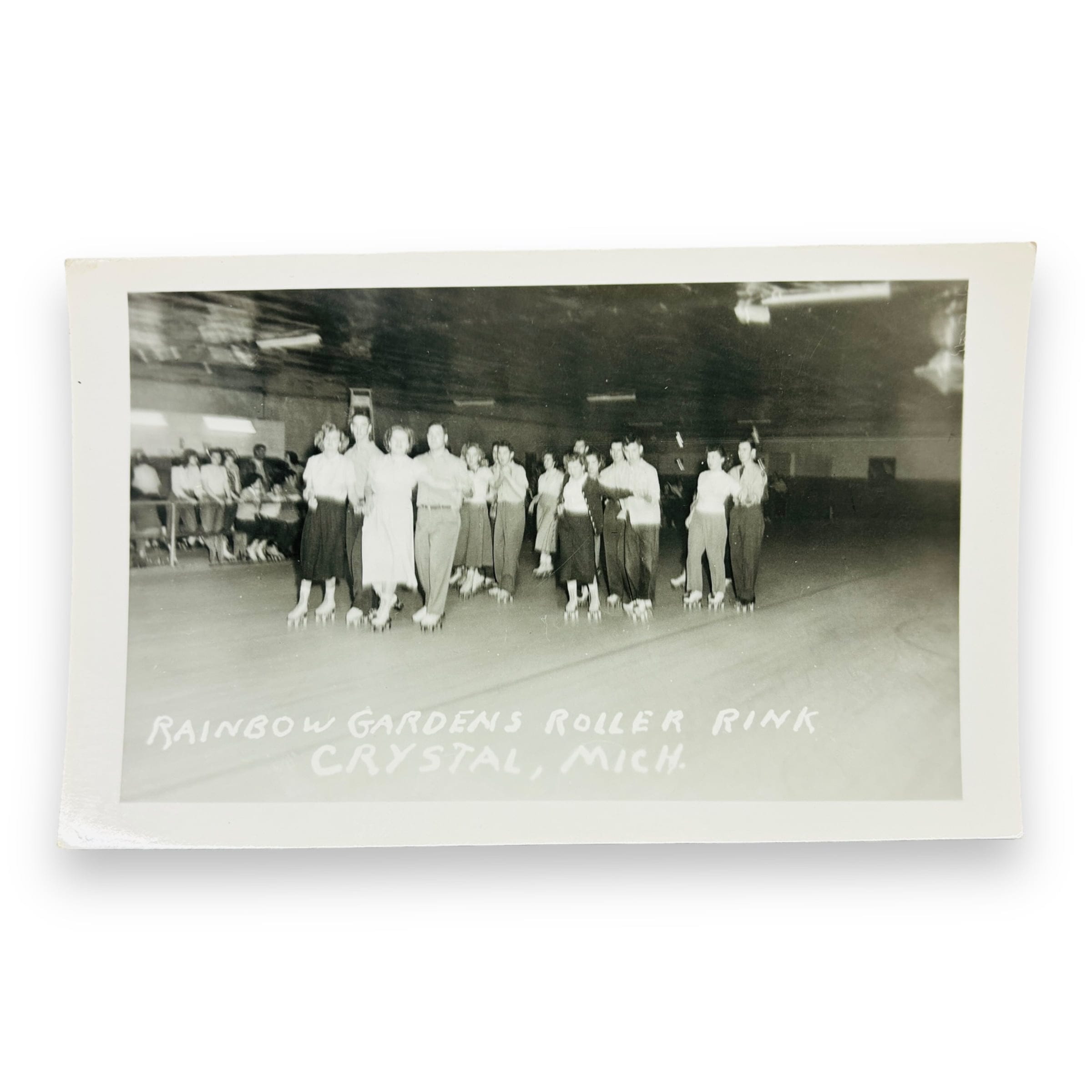 This lot is a real photo postcard (RPPC) showing couples and singles skating at Rainbow Gardens Roller Rink in Crystal, Michigan. Judging from the stamp box on the back of the postcard, this photo was taken around 1948 when the roller rink opened.