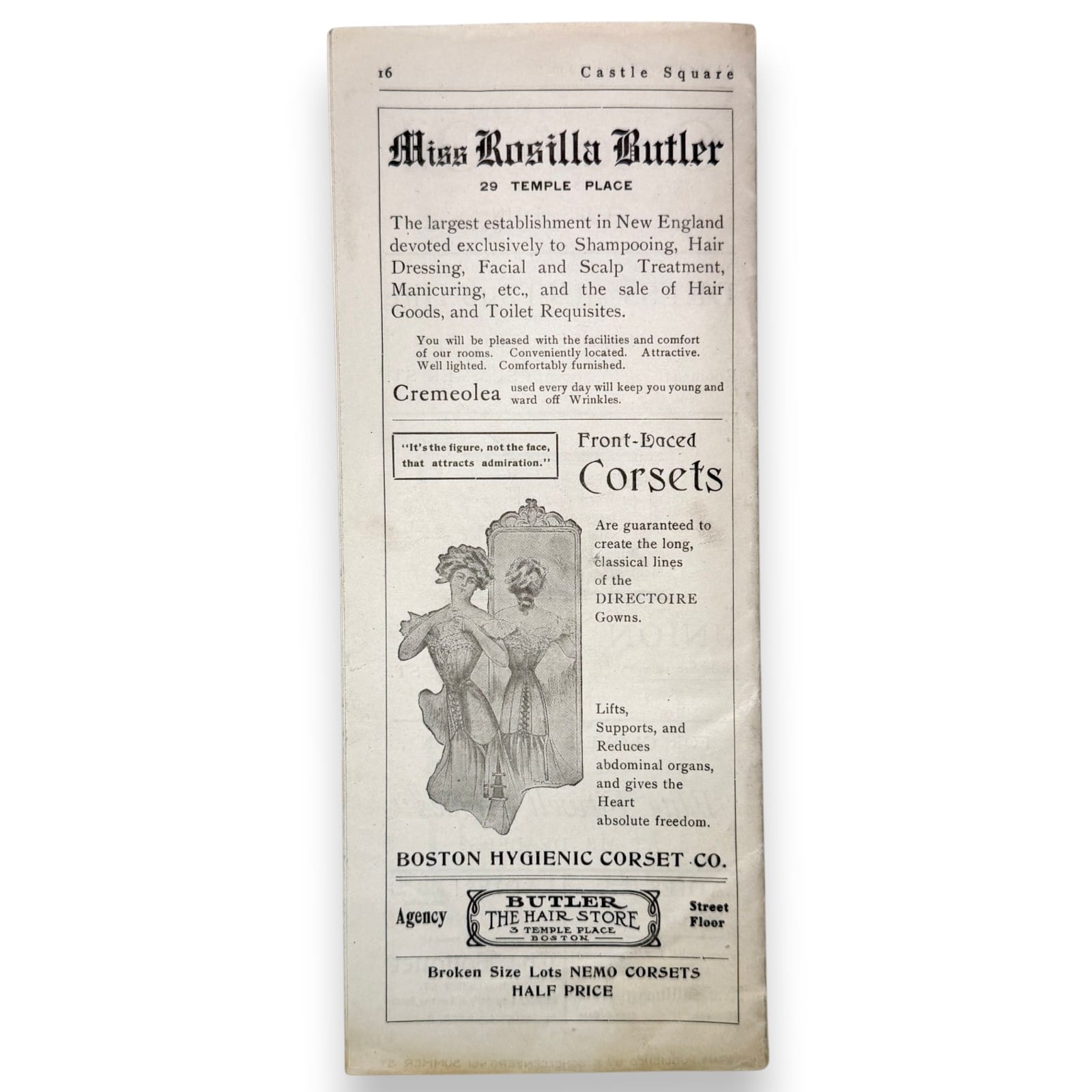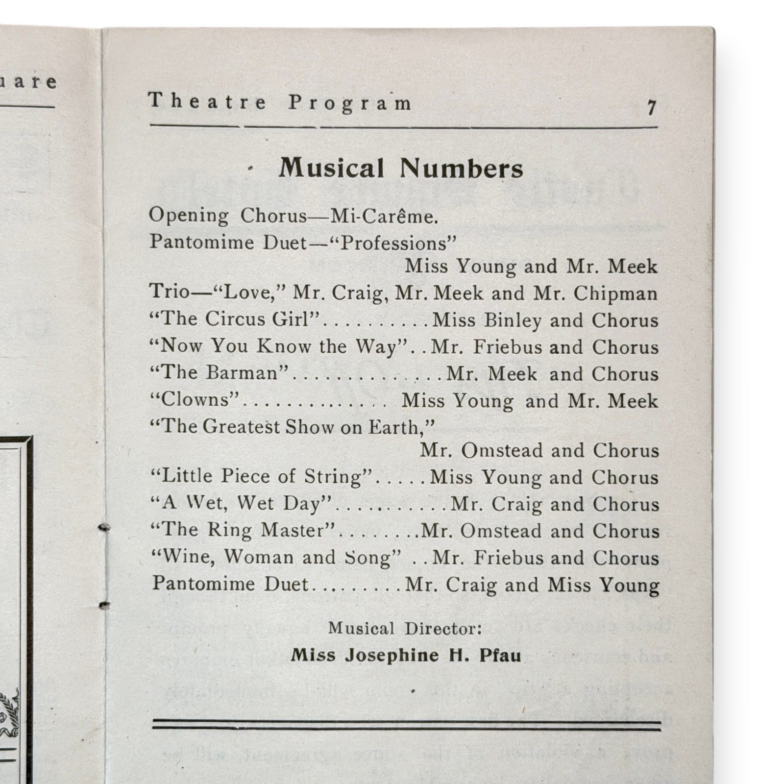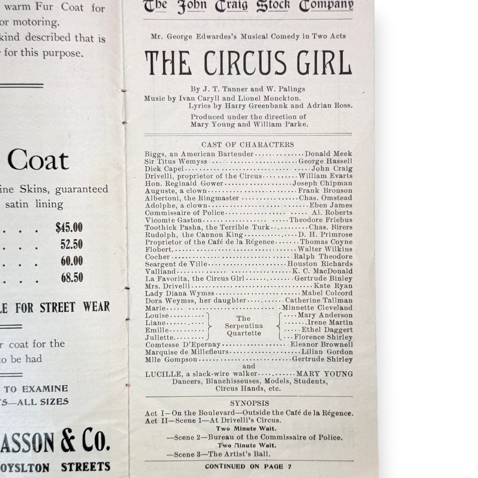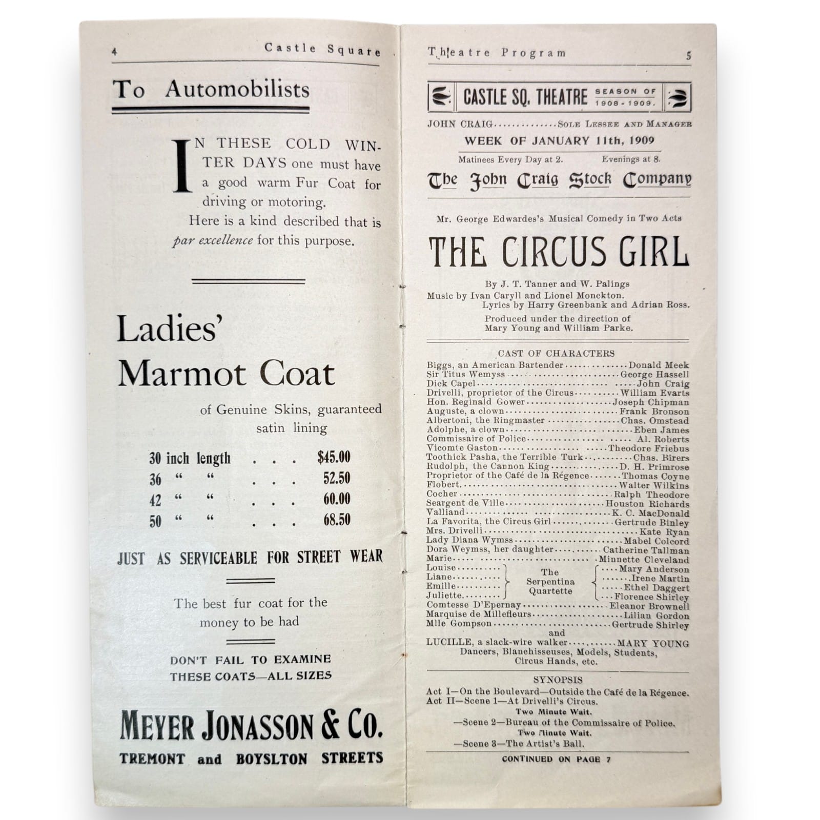 Original 1909 Castle Square Theatre program booklet from Boston for The John Craig Stock Company production of The Circus Girl. This tall-format Edwardian theatre program includes cast and musical listings, theatre information, and period local advertising, making it a solid piece of early Boston stage ephemera as well as a useful reference item for stock-company theatre history.
