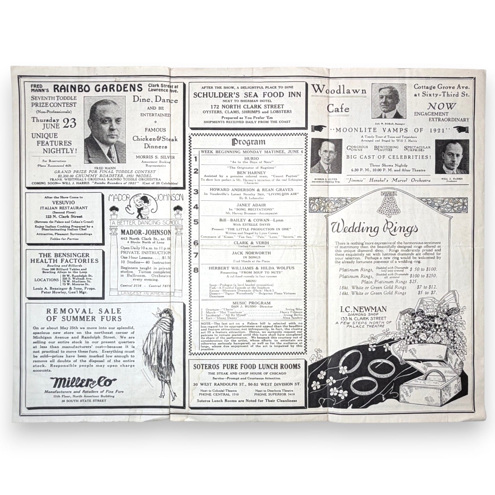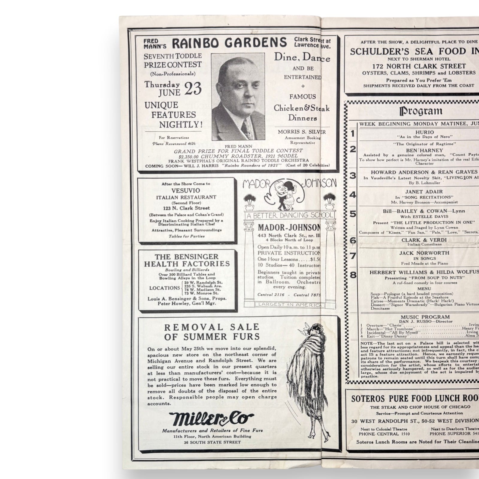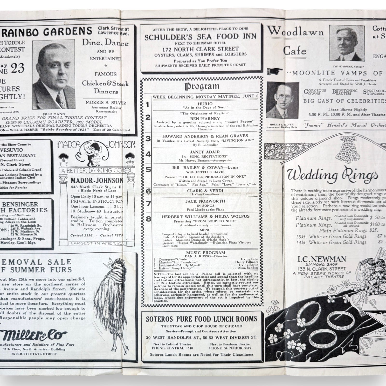 Original c.1921 Palace Music Hall Chicago tri-fold vaudeville program issued for the Orpheum Circuit. This folded theater program documents a week beginning Monday matinee June 6 and includes the Palace Music Hall house notice, weekly act lineup, Orpheum Circuit theater list, theater exit plan, and a wide range of Chicago advertising panels that capture the commercial and entertainment culture of the period.