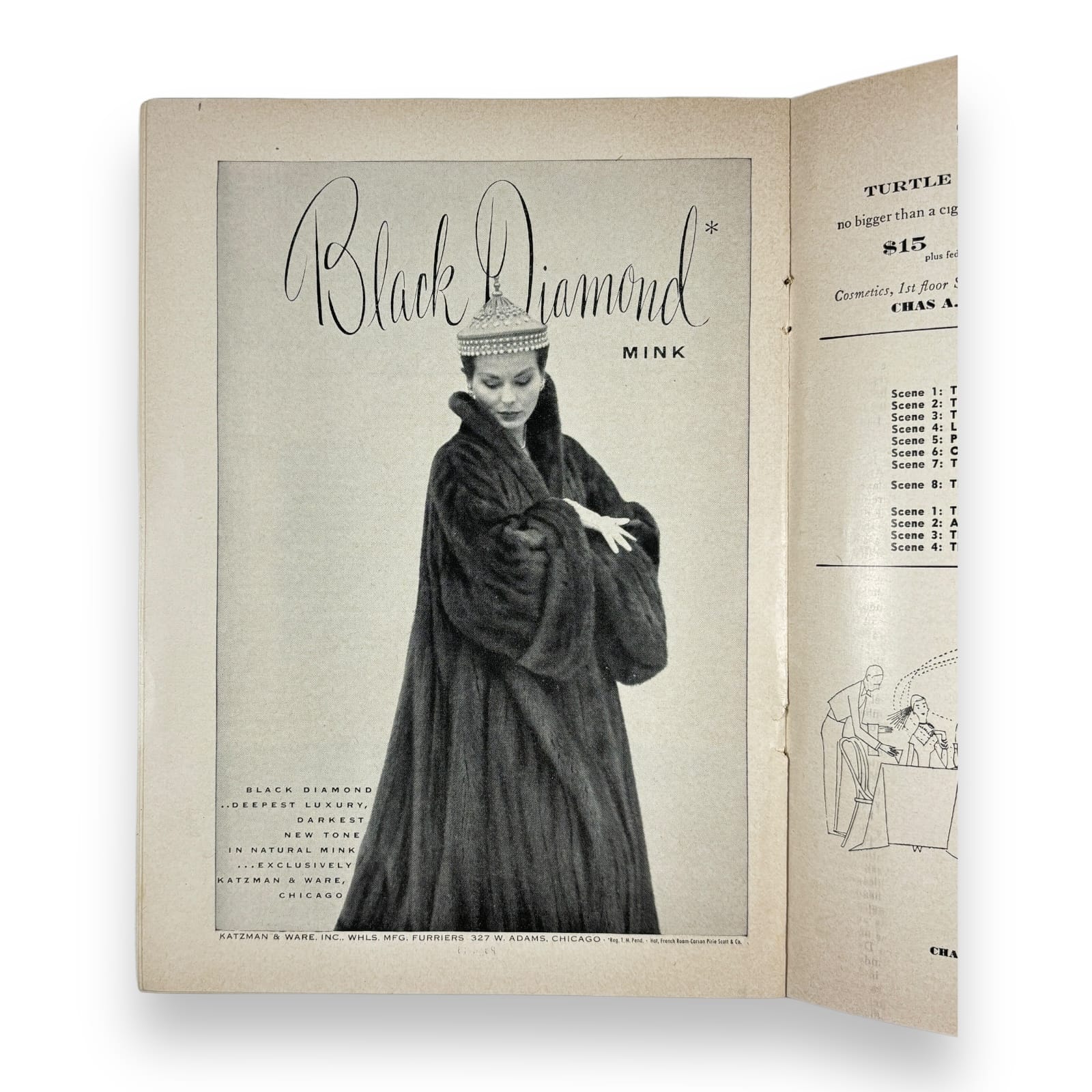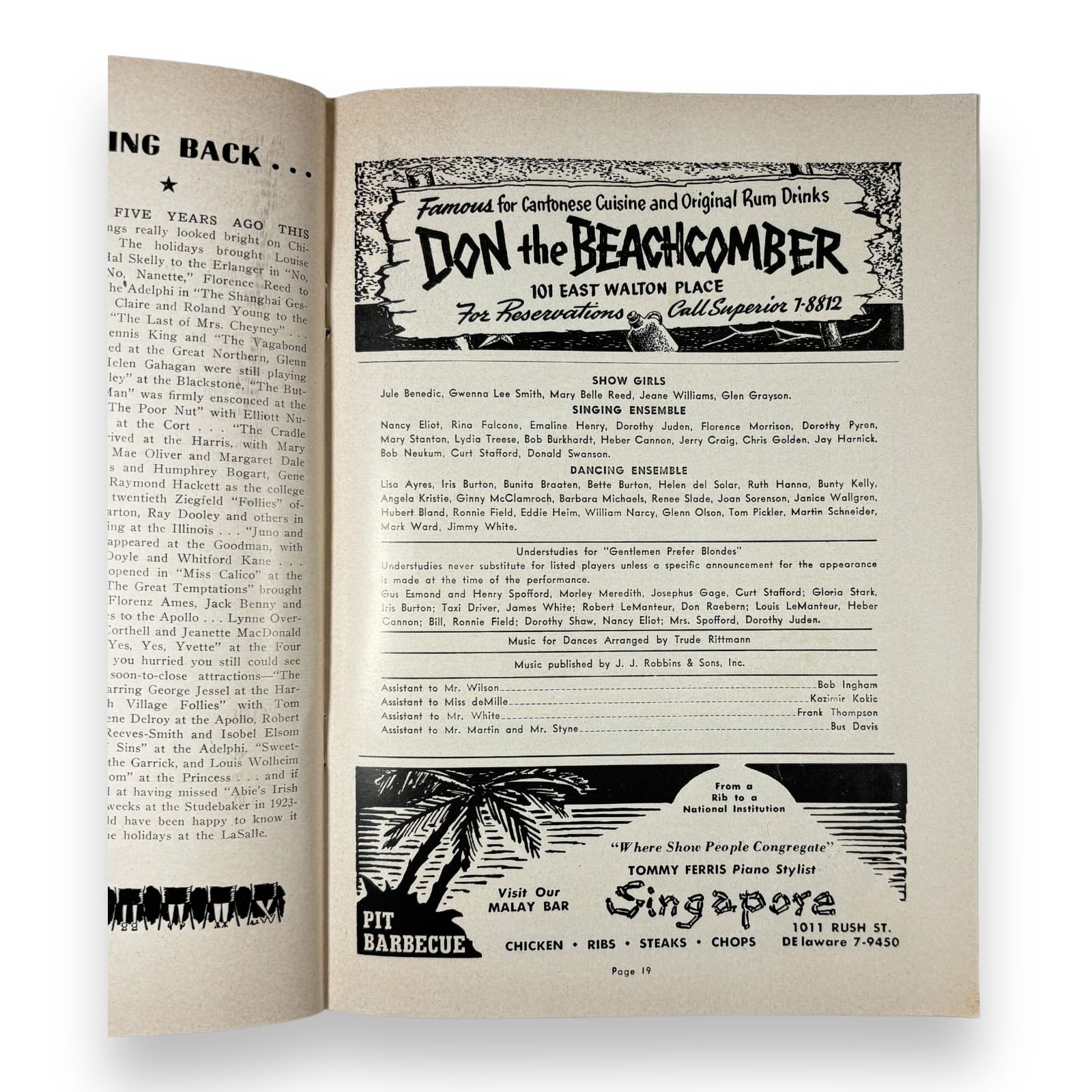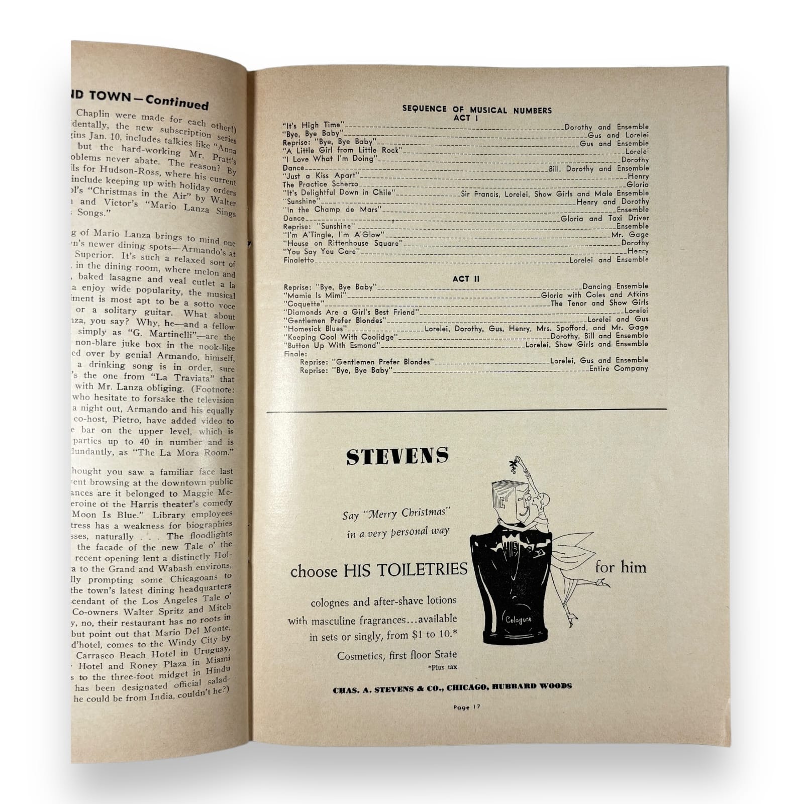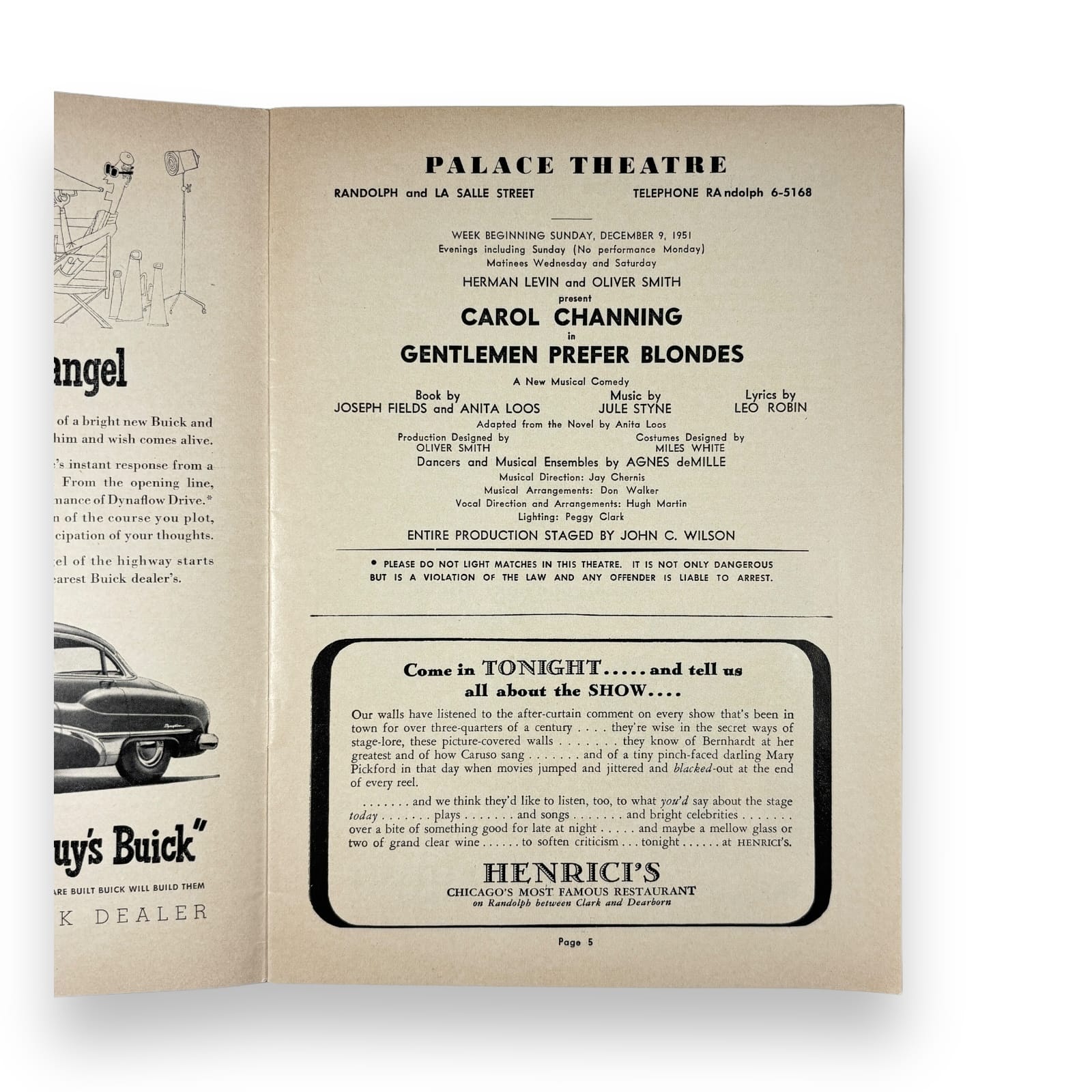 This lot is a vintage multi-page booklet promoting the play “Gentlemen Prefer Blondes” at the Palace Theatre in Chicago, Illinois in 1951. The show starred Carol Channing in the lead role. The booklet is approximately 9.25″ tall by 6.75″ wide and has 22 pages with some excellent vintage advertisements.