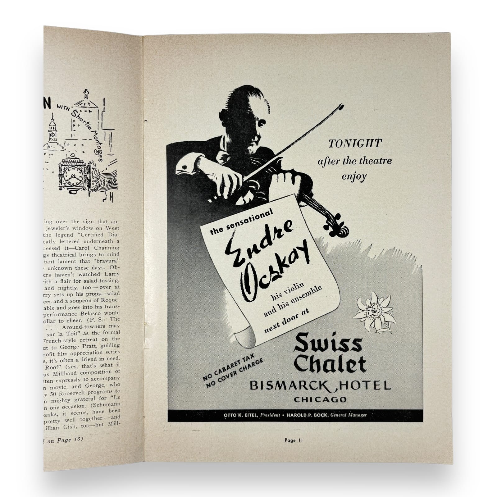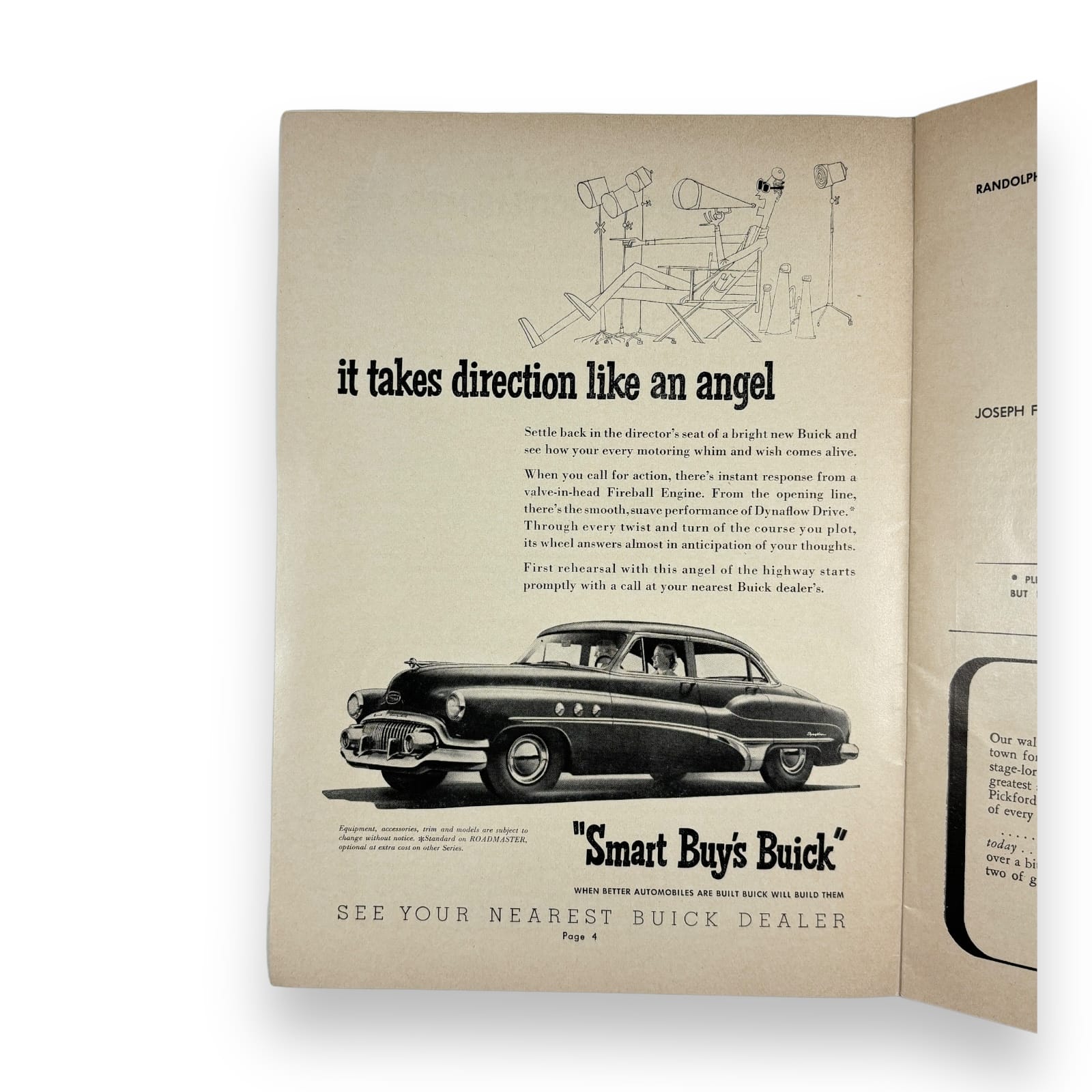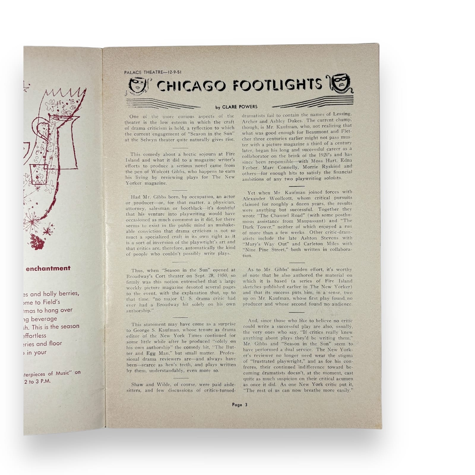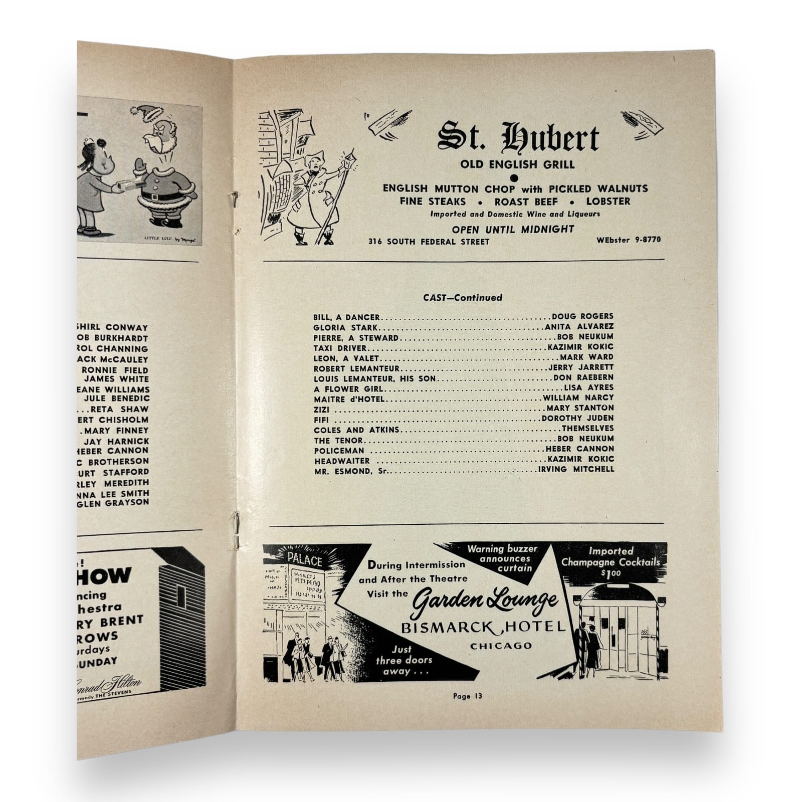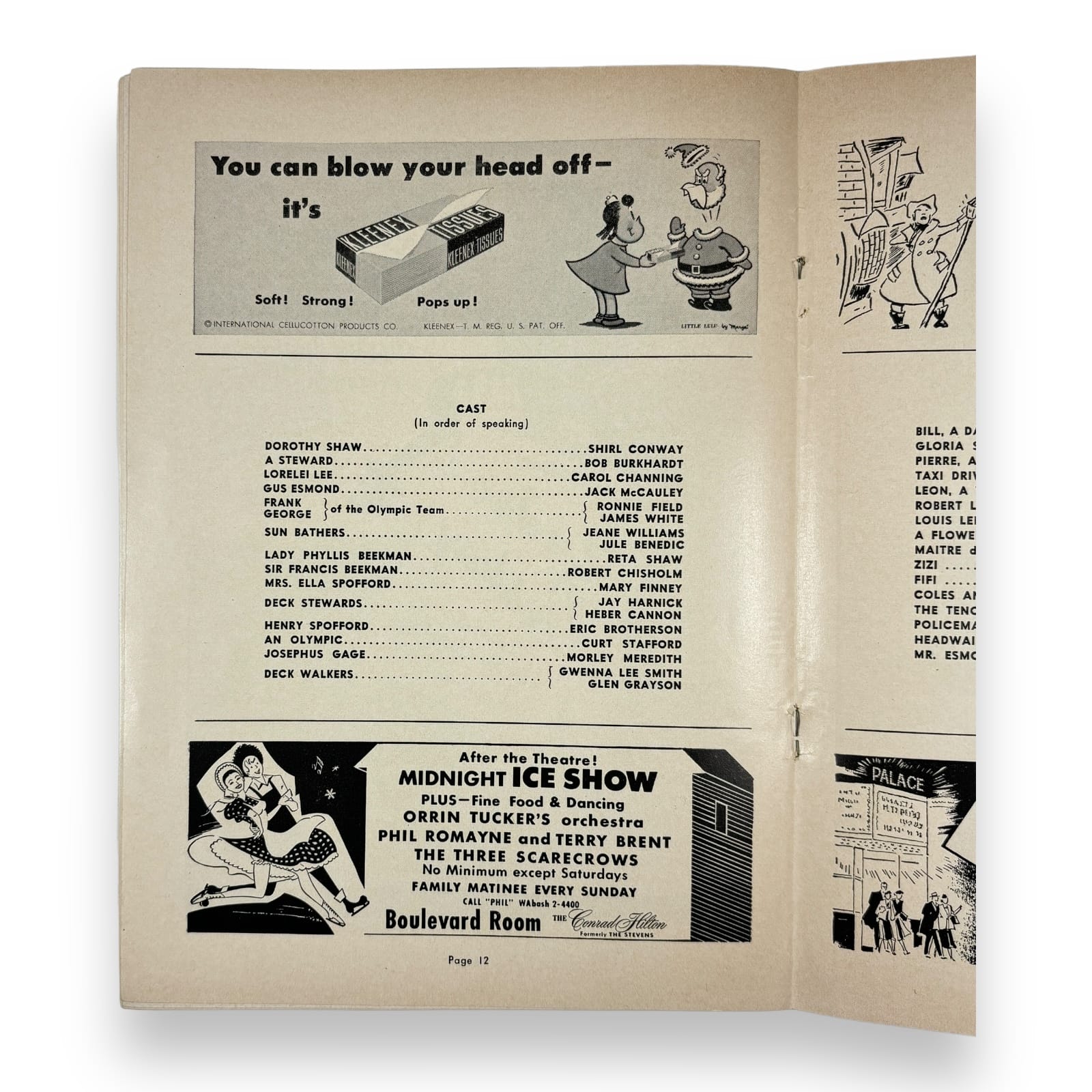 This lot is a vintage multi-page booklet promoting the play “Gentlemen Prefer Blondes” at the Palace Theatre in Chicago, Illinois in 1951. The show starred Carol Channing in the lead role. The booklet is approximately 9.25″ tall by 6.75″ wide and has 22 pages with some excellent vintage advertisements.