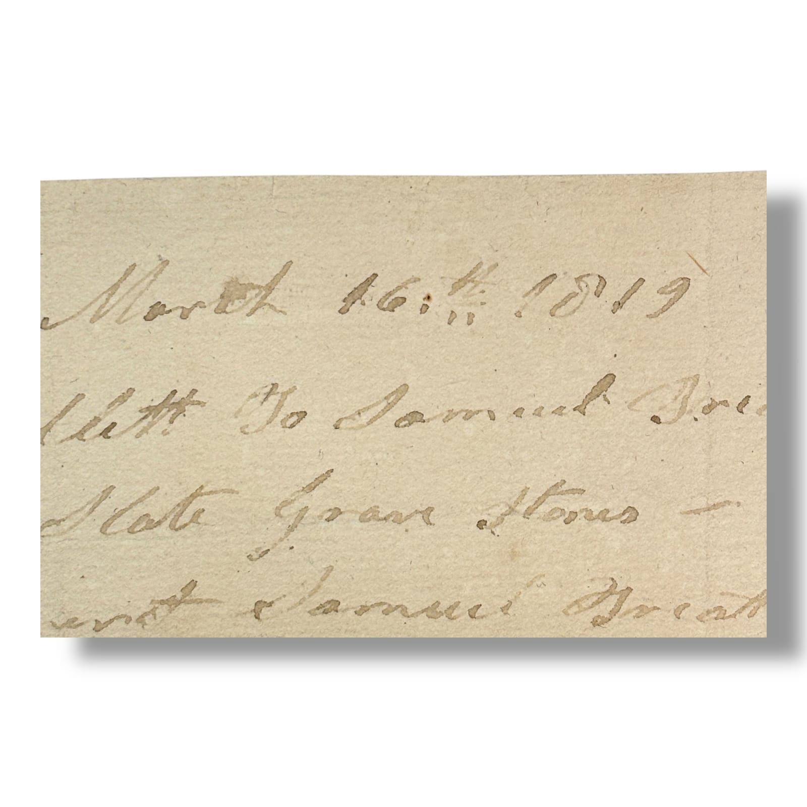 This lot is an authentic, original 1819 handwritten receipt from Portsmouth, New Hampshire documenting the purchase of a pair of slate gravestones by Mary Sollett from Samuel Treat, a well-known stonecutter in early 19th-century Portsmouth. The receipt is dated March 16, 1819 and reads: