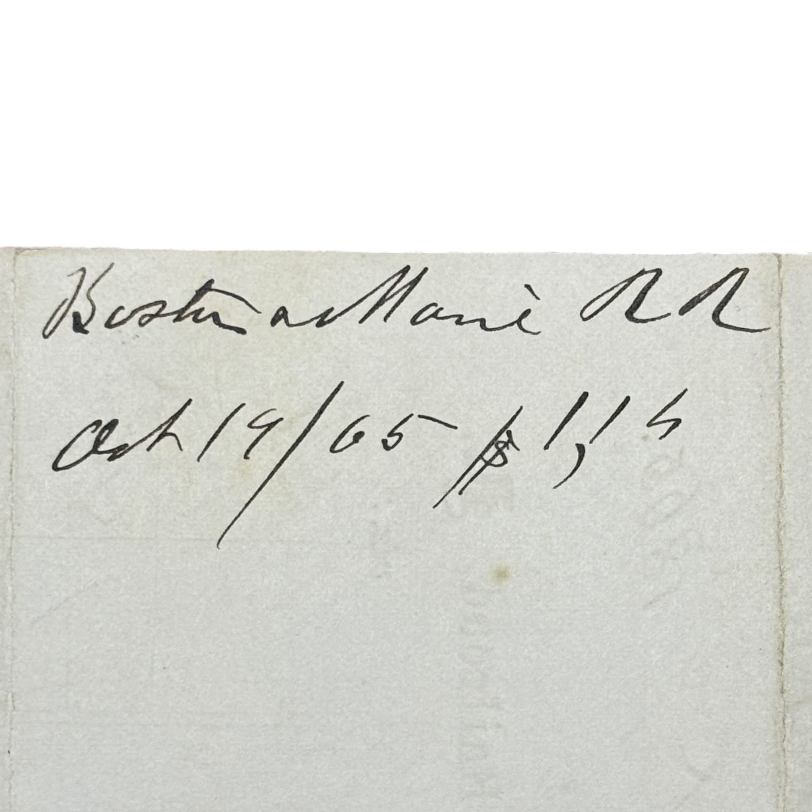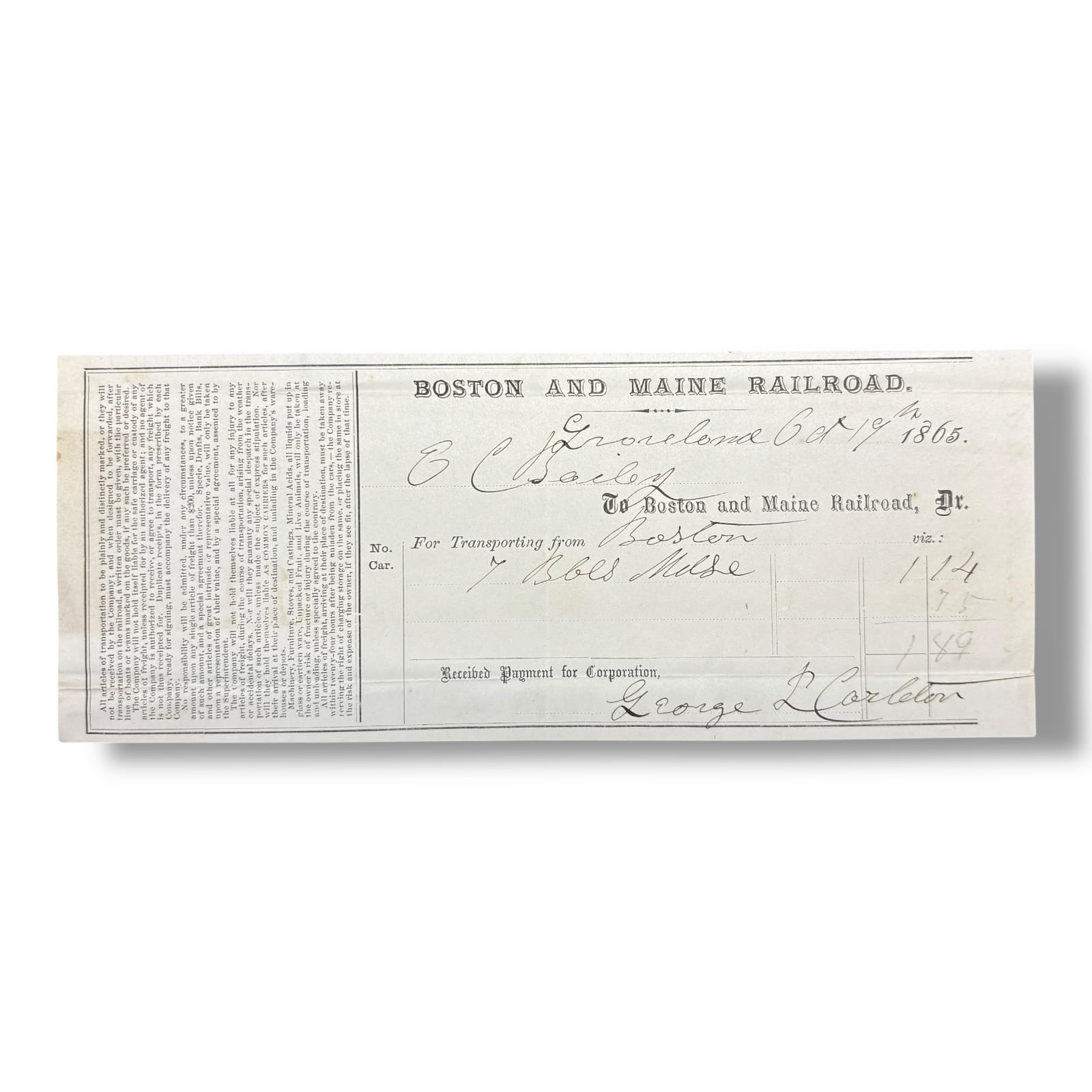 Original 1865 Boston and Maine Railroad freight receipt issued at Greenland, New Hampshire, documenting the transport of seven barrels of molasses from Boston. Dated October 19, 1865, just months after the Civil War’s end, this early shipping document records payment of $1.49 by E. C. Bailey and bears the signature of company representative George L. Carleton. The printed terms on the left outline the railroad’s liability limits, adding valuable insight into 19th-century freight practices in New England commerce.