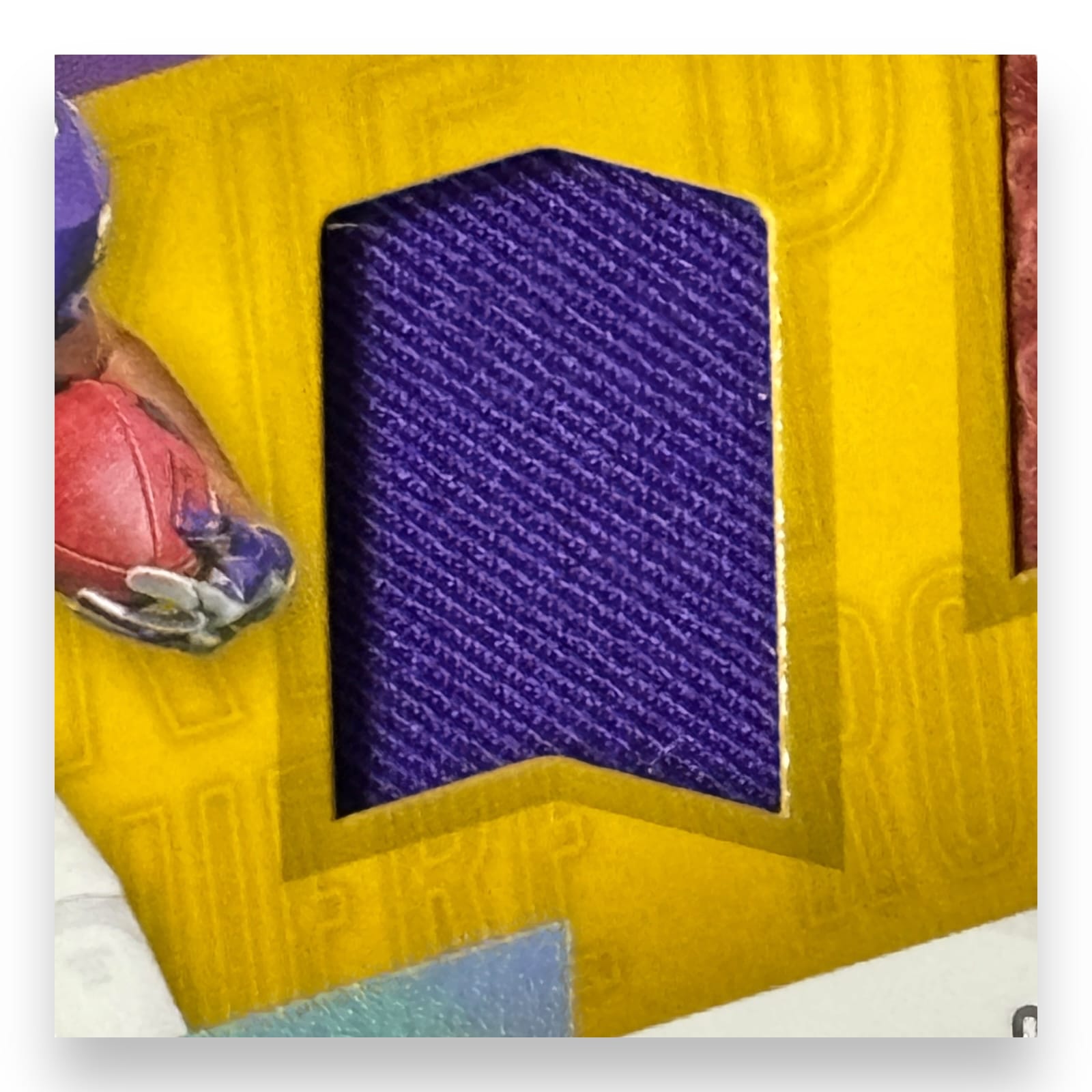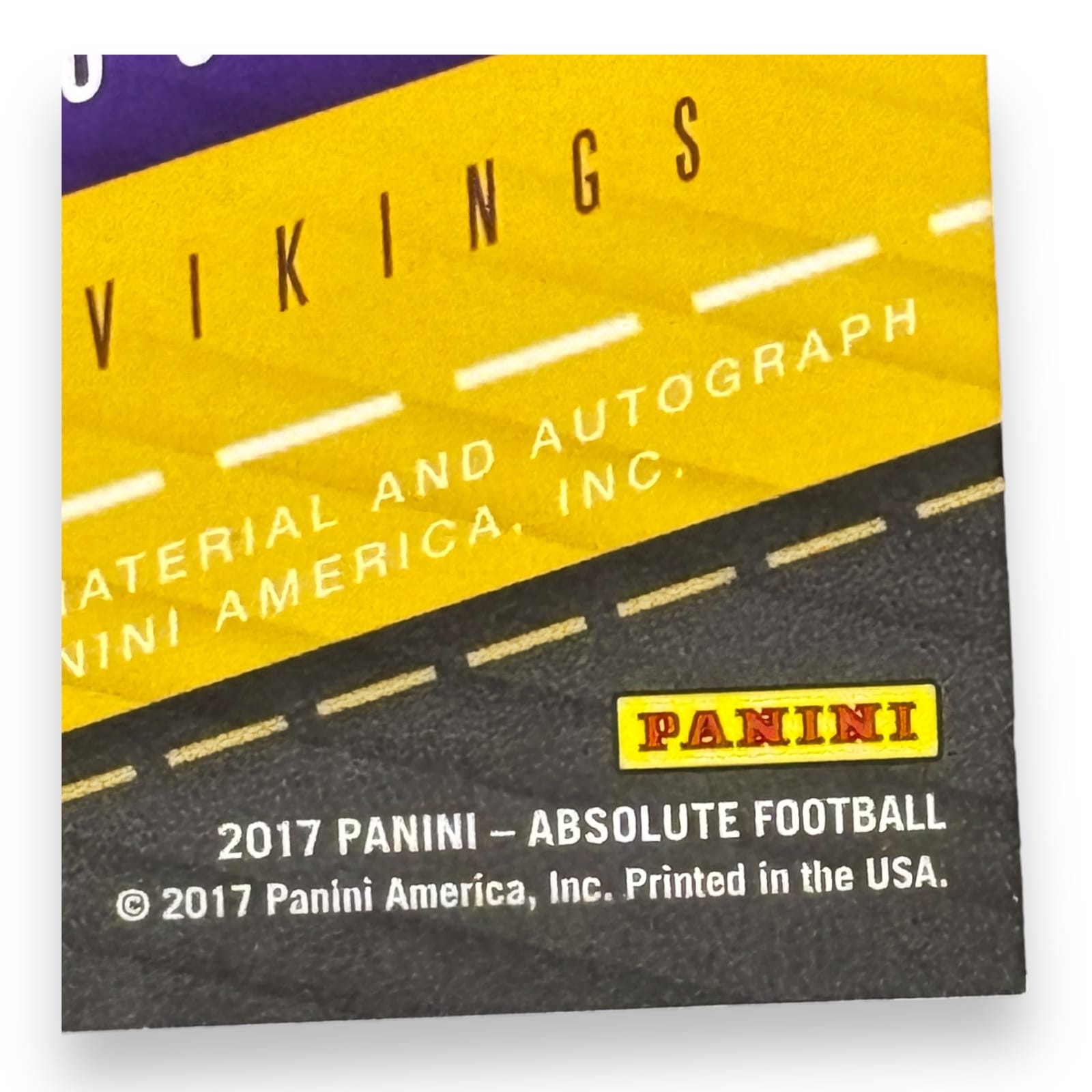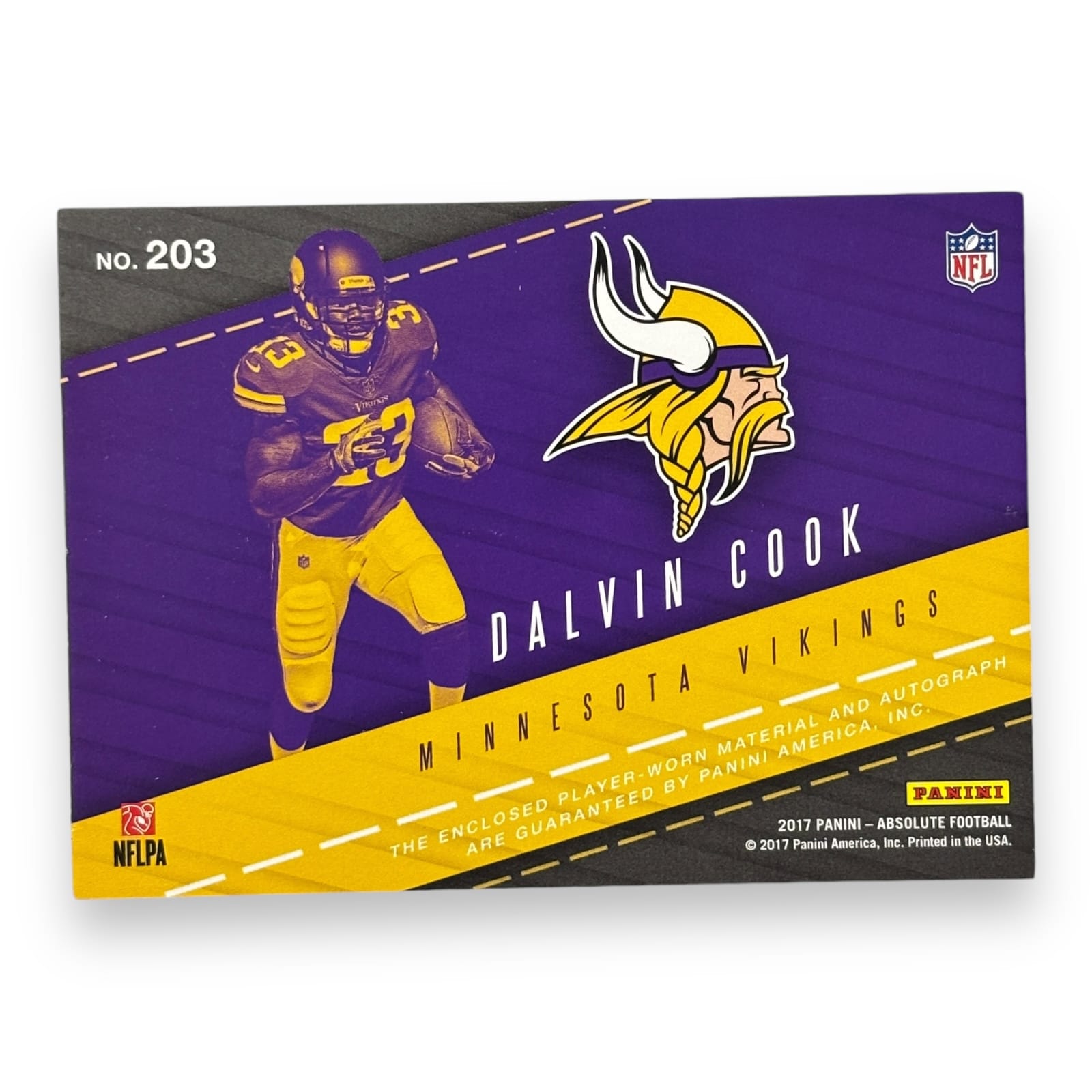 Original 2017 Panini Absolute Football “Rookie Premiere” card featuring Dalvin Cook, running back for the Minnesota Vikings. This autographed rookie card includes three distinct player-worn material swatches—purple jersey, football leather, and black fabric—along with a blue ink on-card signature. Numbered 084/149, this limited edition release is card #203 in the set and is guaranteed authentic by Panini America, Inc.