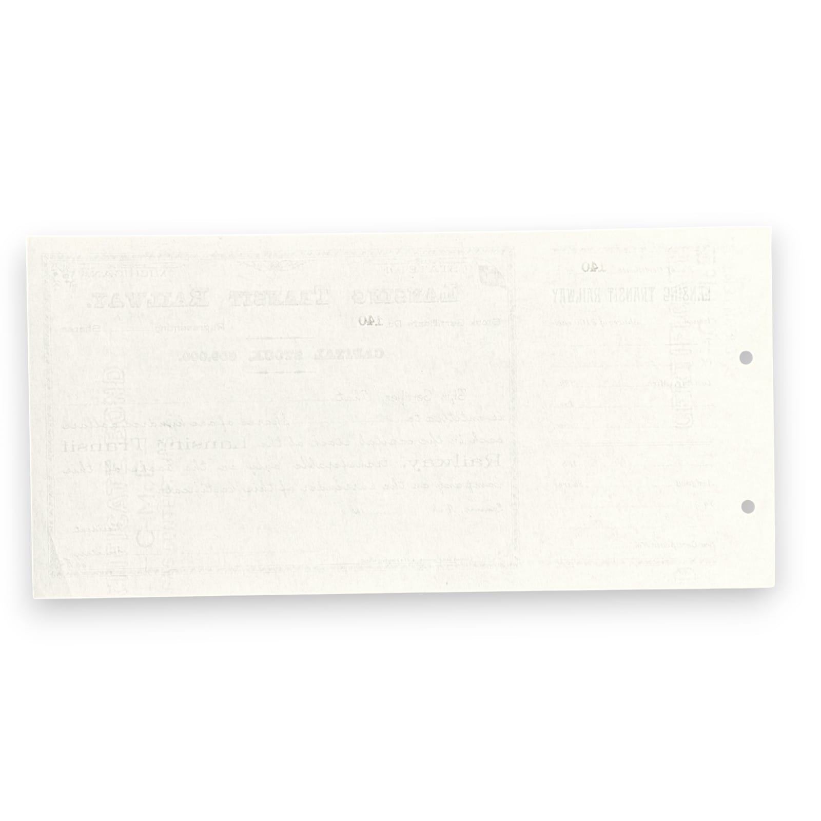 This is a blank, unused stock certificate for the Lansing Transit Railway of Michigan dating to the 1880s. The Lansing Transit Railway was incorporated in 1886 and leased to the Michigan Central Railroad in 1887, with construction completed in 1888. This company was used to transfer freight between Lansing manufacturers and the larger rail lines of Michigan Central and New York Central. The certificate, printed by the Lansing Daily Journal Steam Printing House, features ornate typography and a preprinted date field “188_” with spaces for officers’ signatures. It measures approximately 6.75 inches tall by 13.75 inches wide and remains clean and unused. It is stock certificate #140.