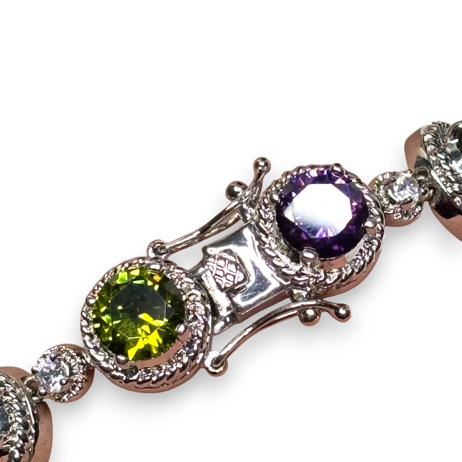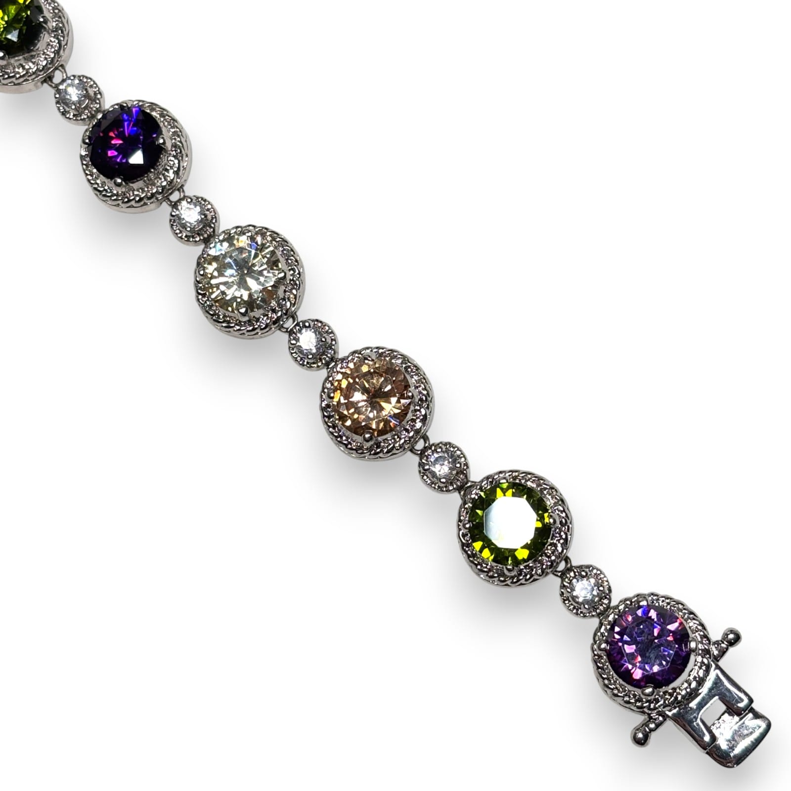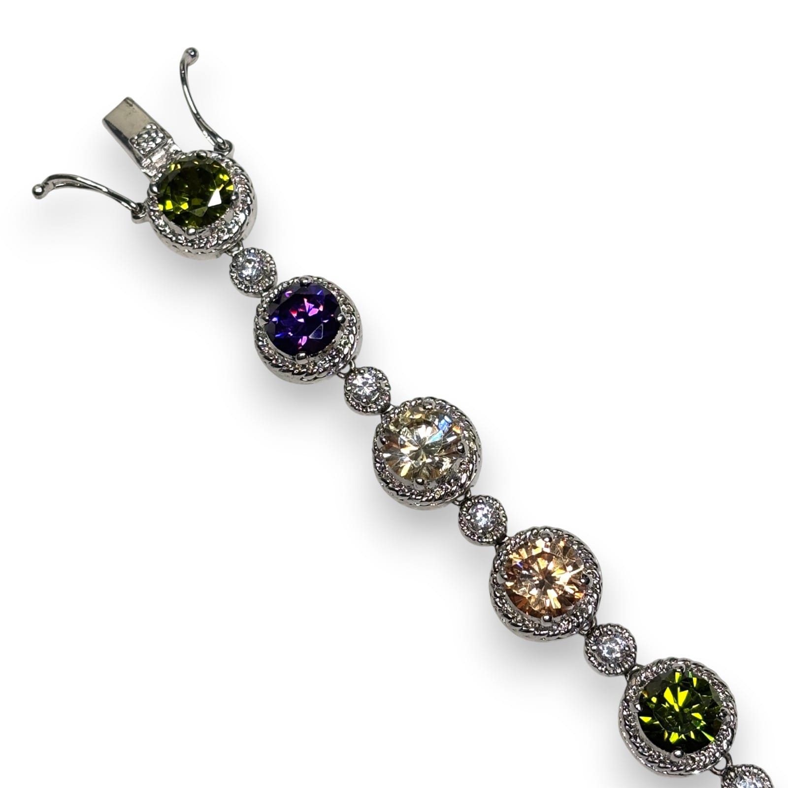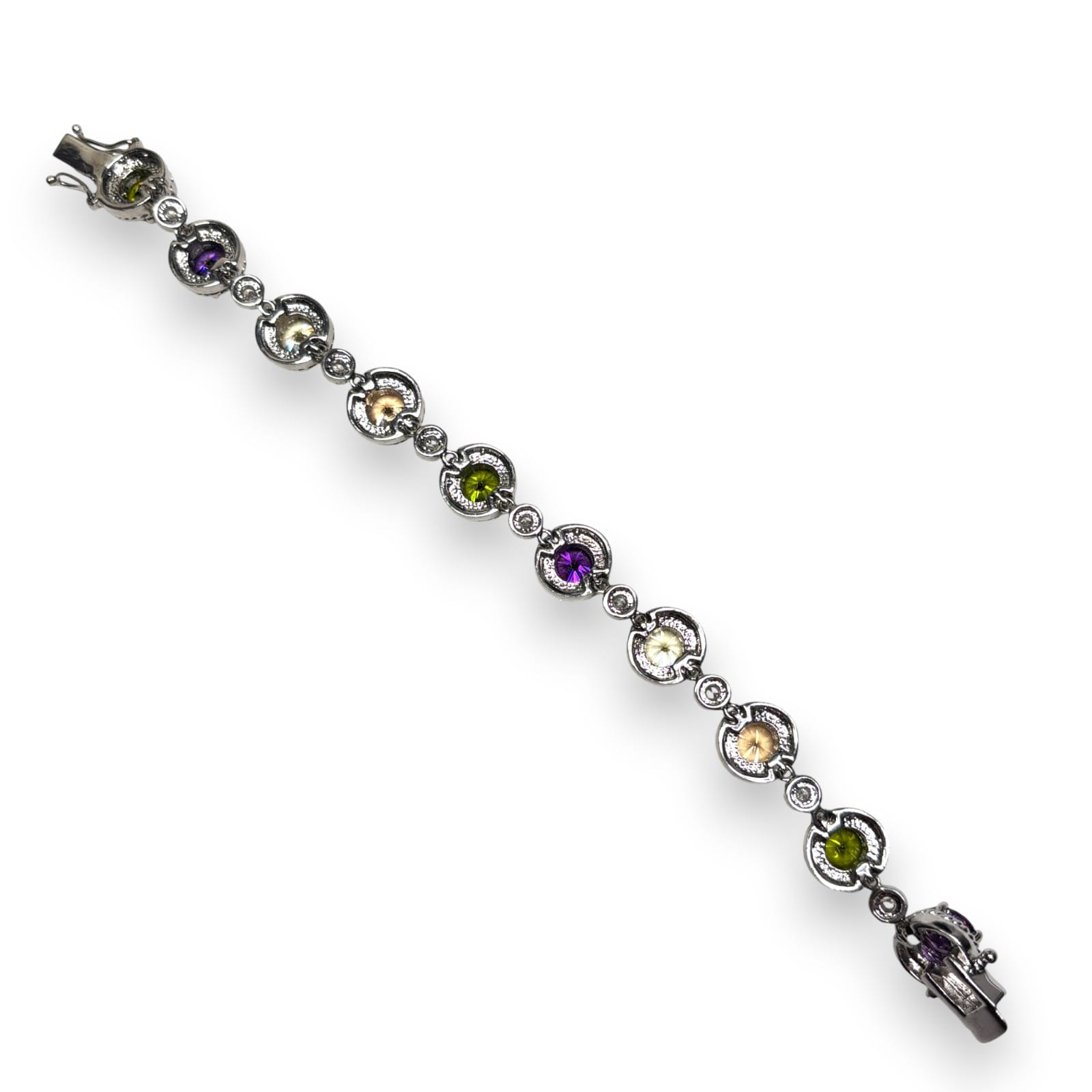 This 1990s silver-tone link bracelet features prong-set faceted multicolor glass stones. The larger round stations alternate with smaller clear rhinestone links. The bracelet closes with a box clasp found at one end. It also has dual side safety clips.