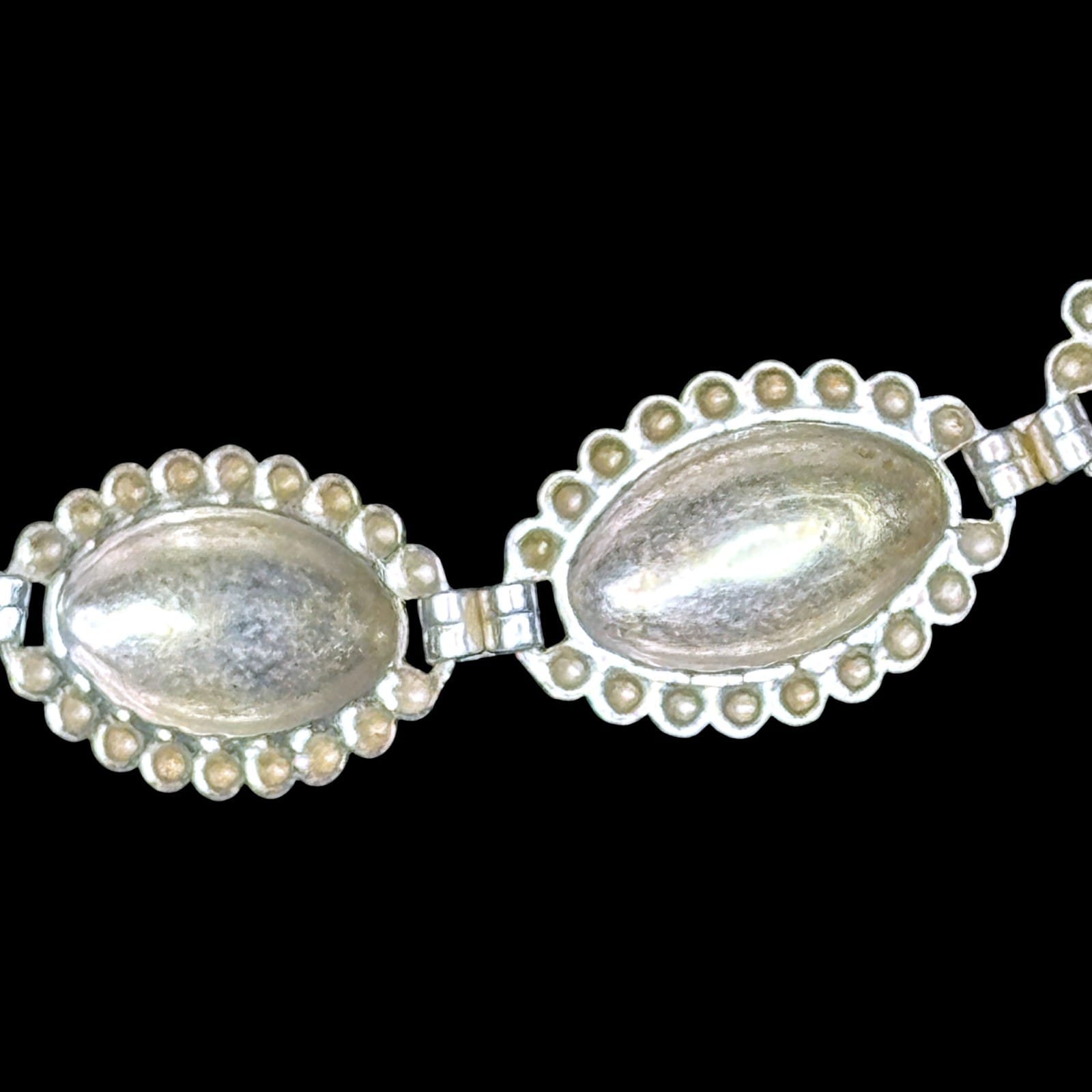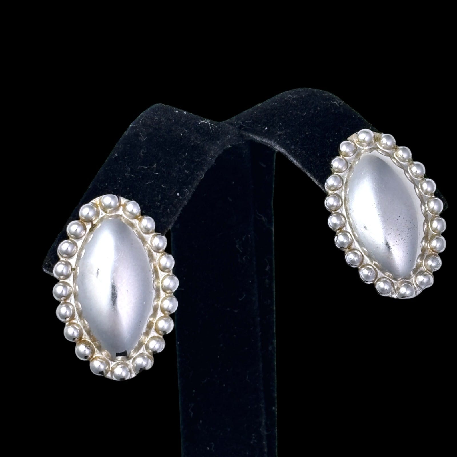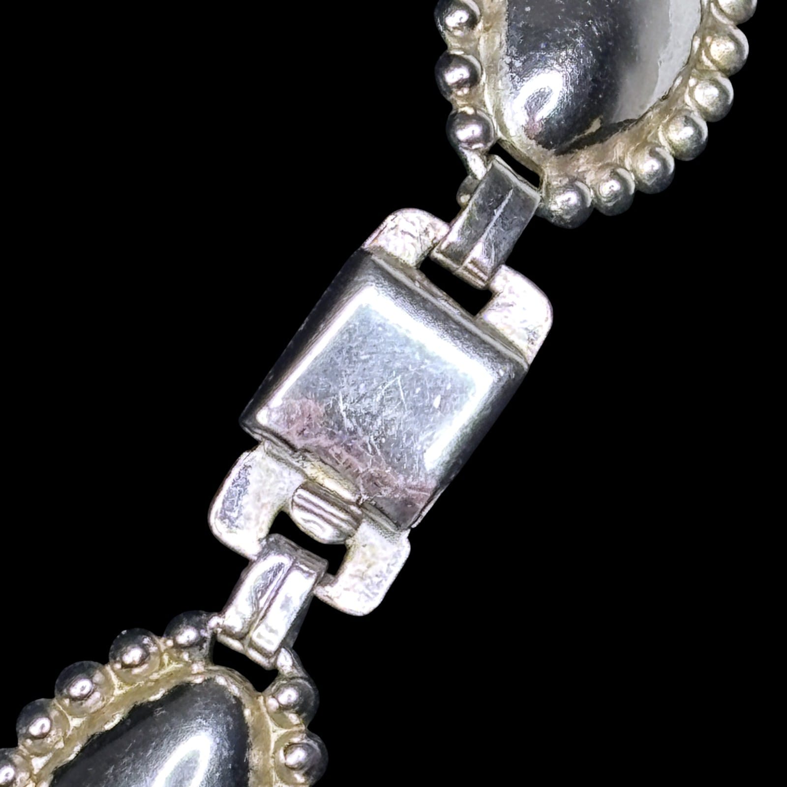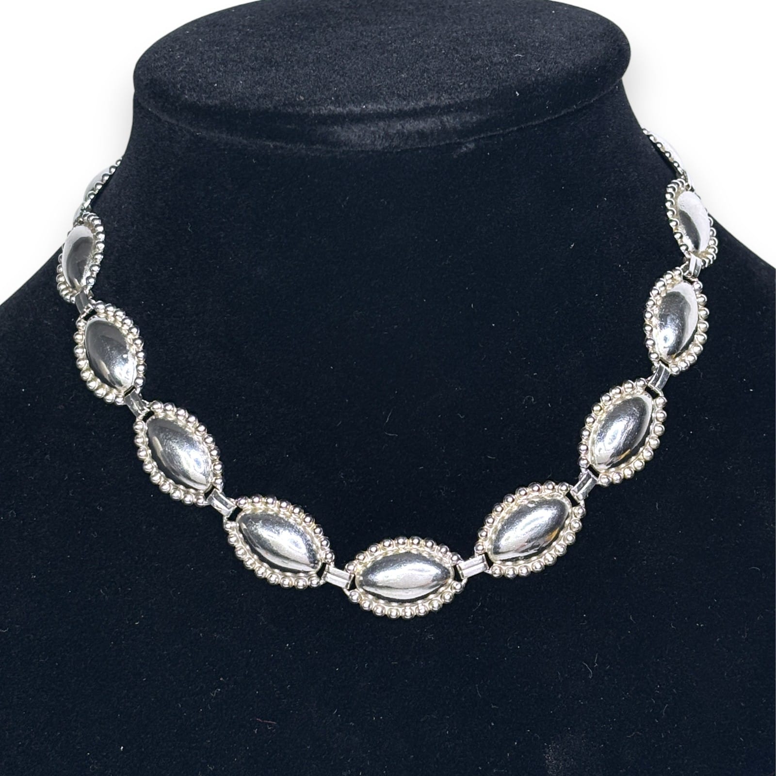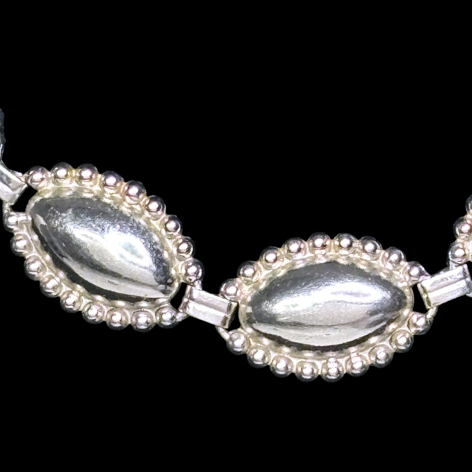 Signed G&D&Co sterling silver necklace with matching screwback earrings dating to the 1940s–1950s. The design features domed marquise-form links framed by a beaded border. The necklace is fitted with a patented double-locking box clasp stamped with the maker name, sterling mark, and patent number, and each earring screw is marked STER.