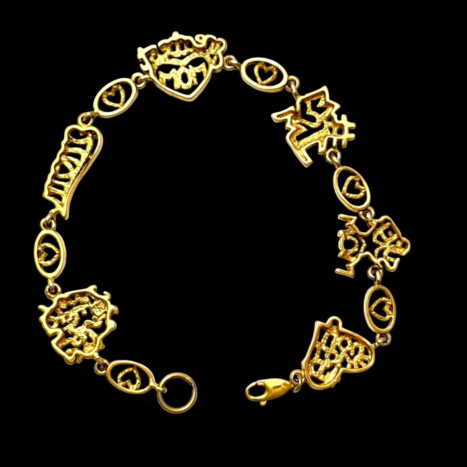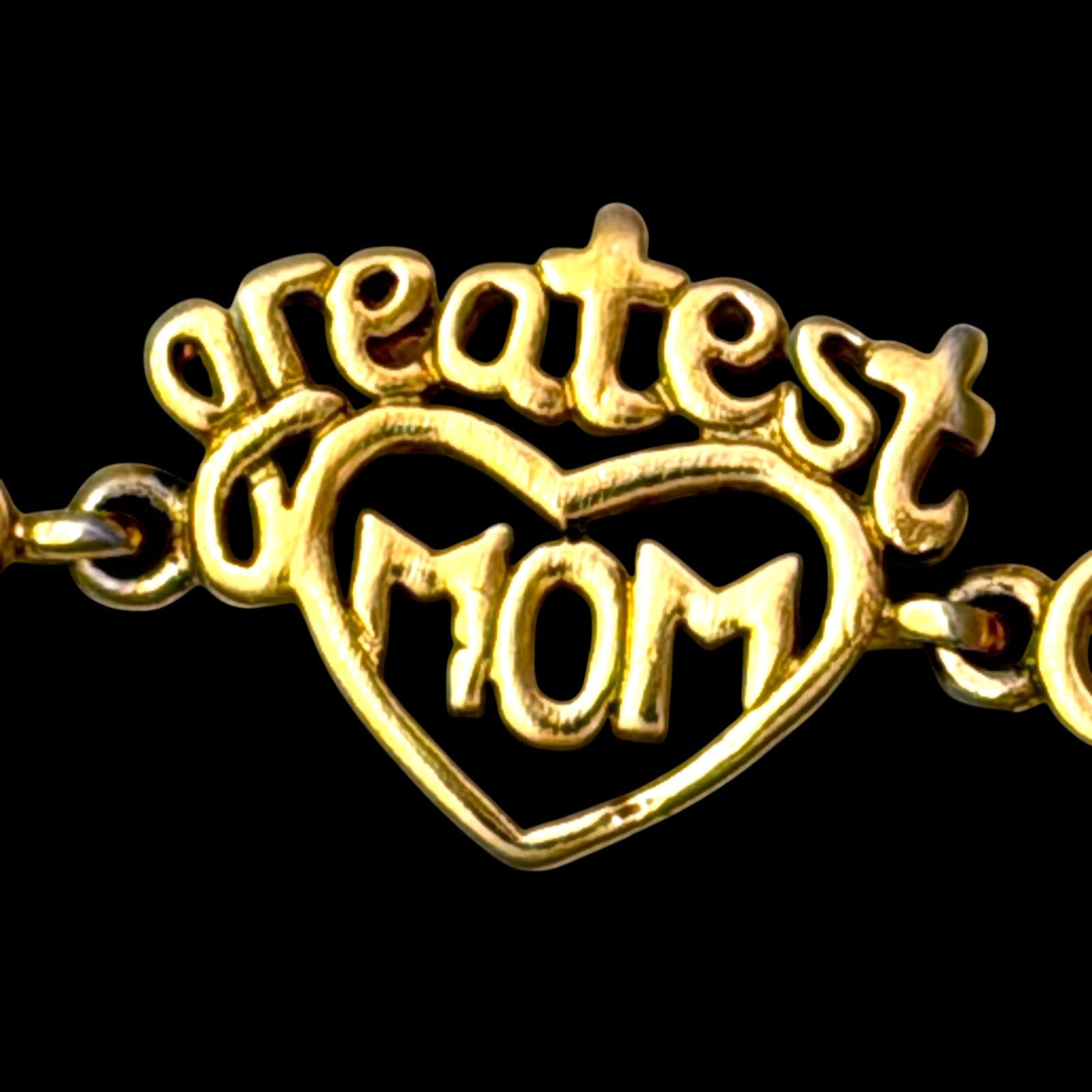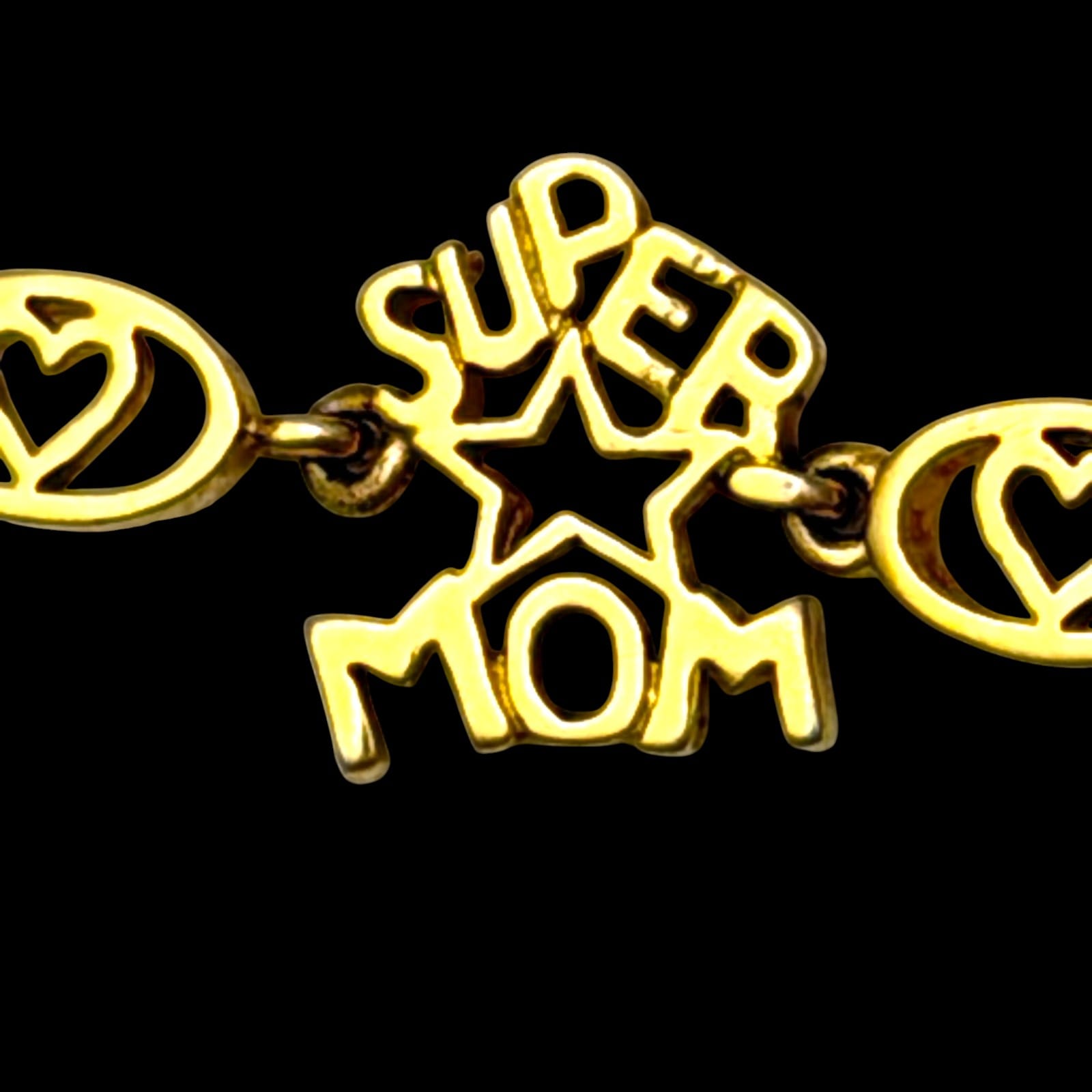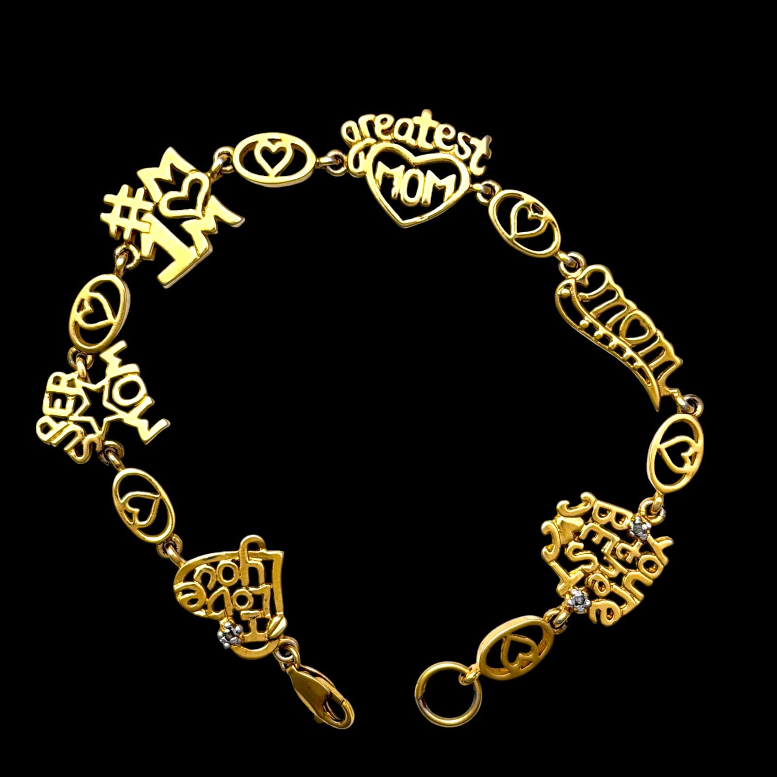 This 1990s vermeil-over-sterling link bracelet features multiple mother-themed word links and heart motifs. The bracelet measures 7.5″ and closes with a lobster claw clasp. The design includes mixed slogan links such as #1 MOM, SUPER MOM, greatest mom, mom, I Love You, and you’re the best. The clasp and one link are marked 925.