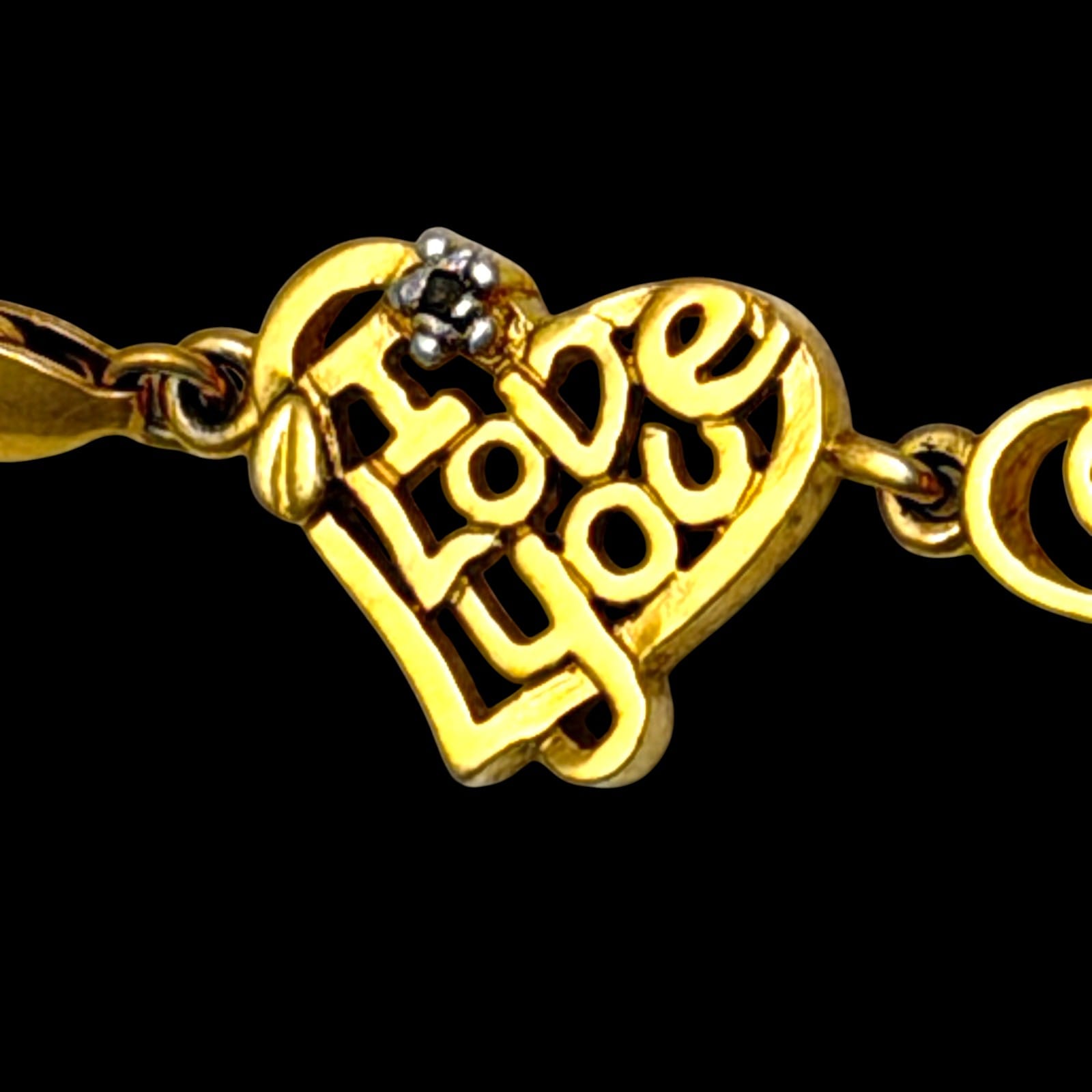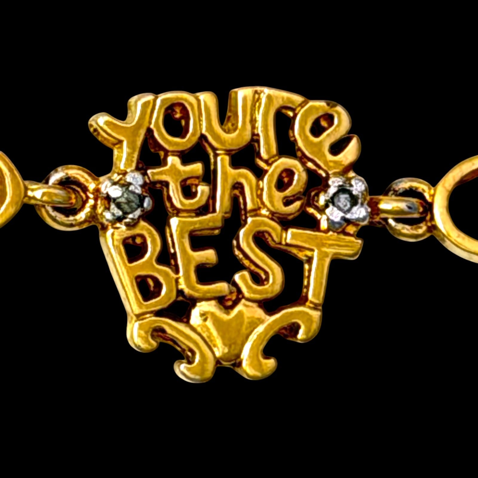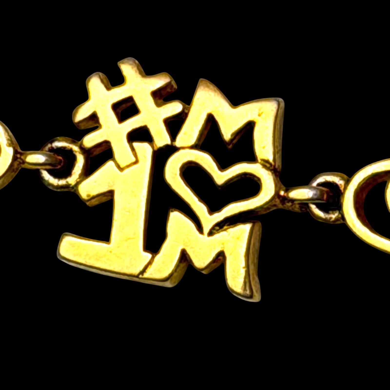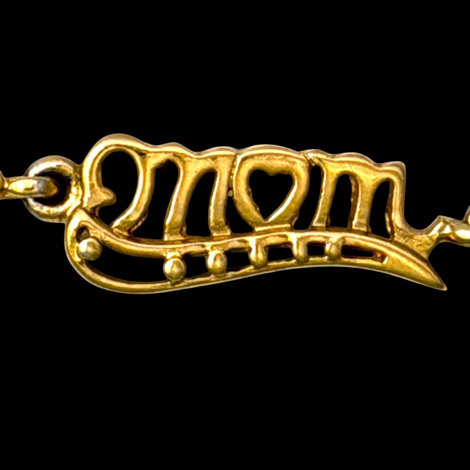 This 1990s vermeil-over-sterling link bracelet features multiple mother-themed word links and heart motifs. The bracelet measures 7.5″ and closes with a lobster claw clasp. The design includes mixed slogan links such as #1 MOM, SUPER MOM, greatest mom, mom, I Love You, and you’re the best. The clasp and one link are marked 925.